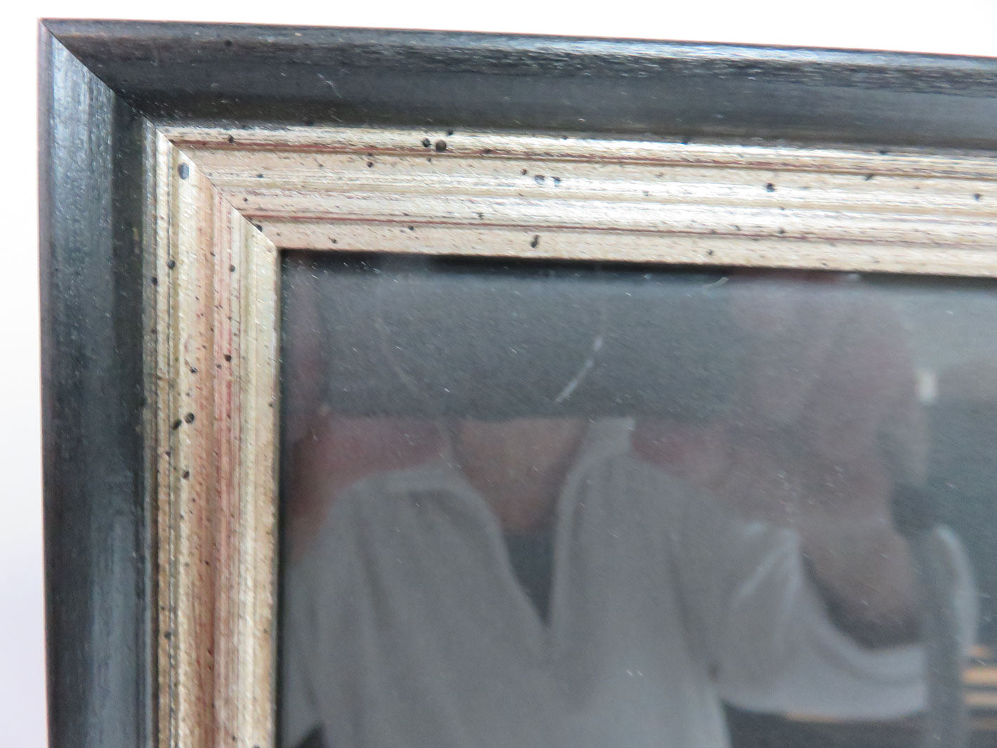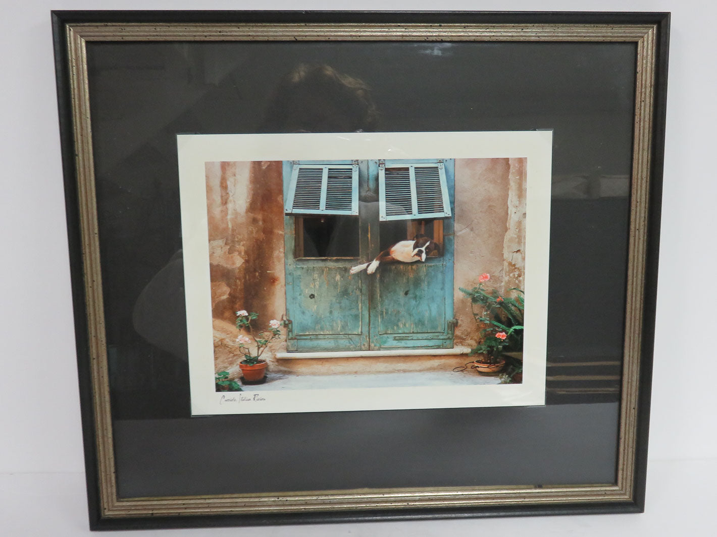 Dog looking out teal doors on Italian Riveria in antiqued silver frame
