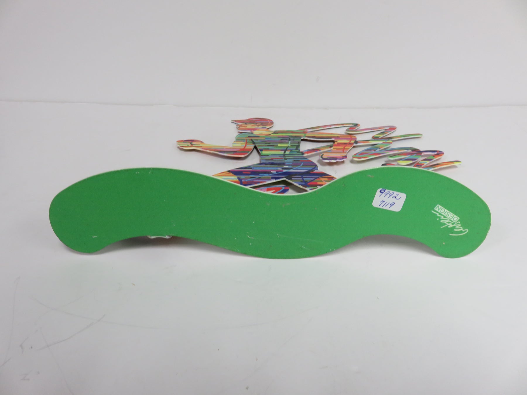 Item Number: 9992-7119 Multi-colored free-standing, double-sided laser cut steel sculpture of a man jogging. 13"W x 12.25"H