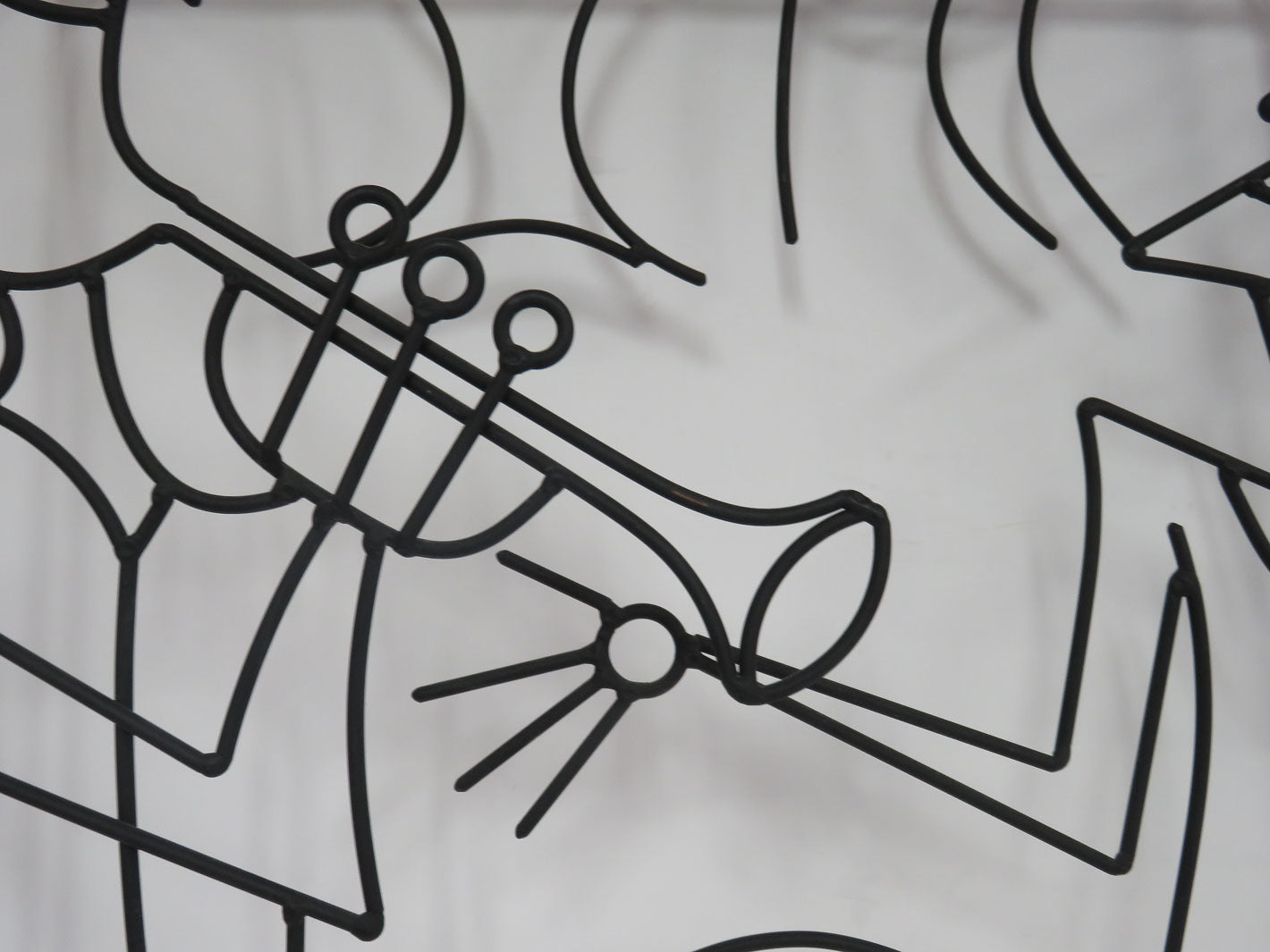 Black wire sculpture of 2 musicians at a cafe, can hang on wall