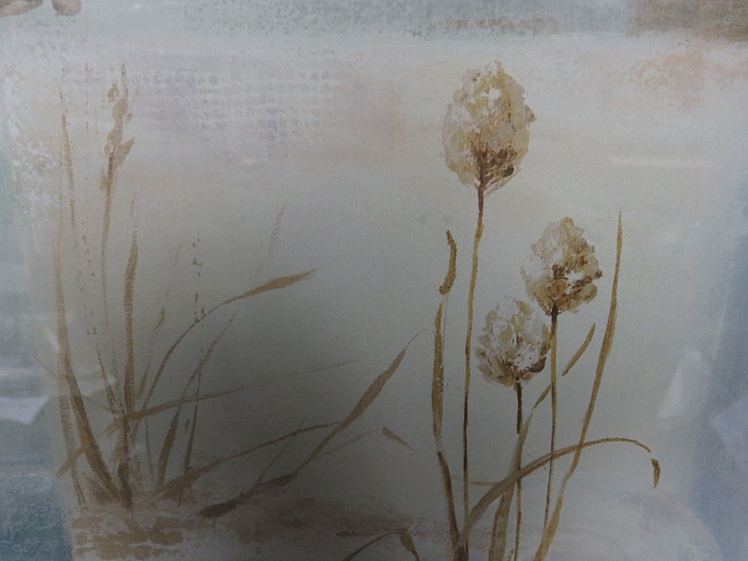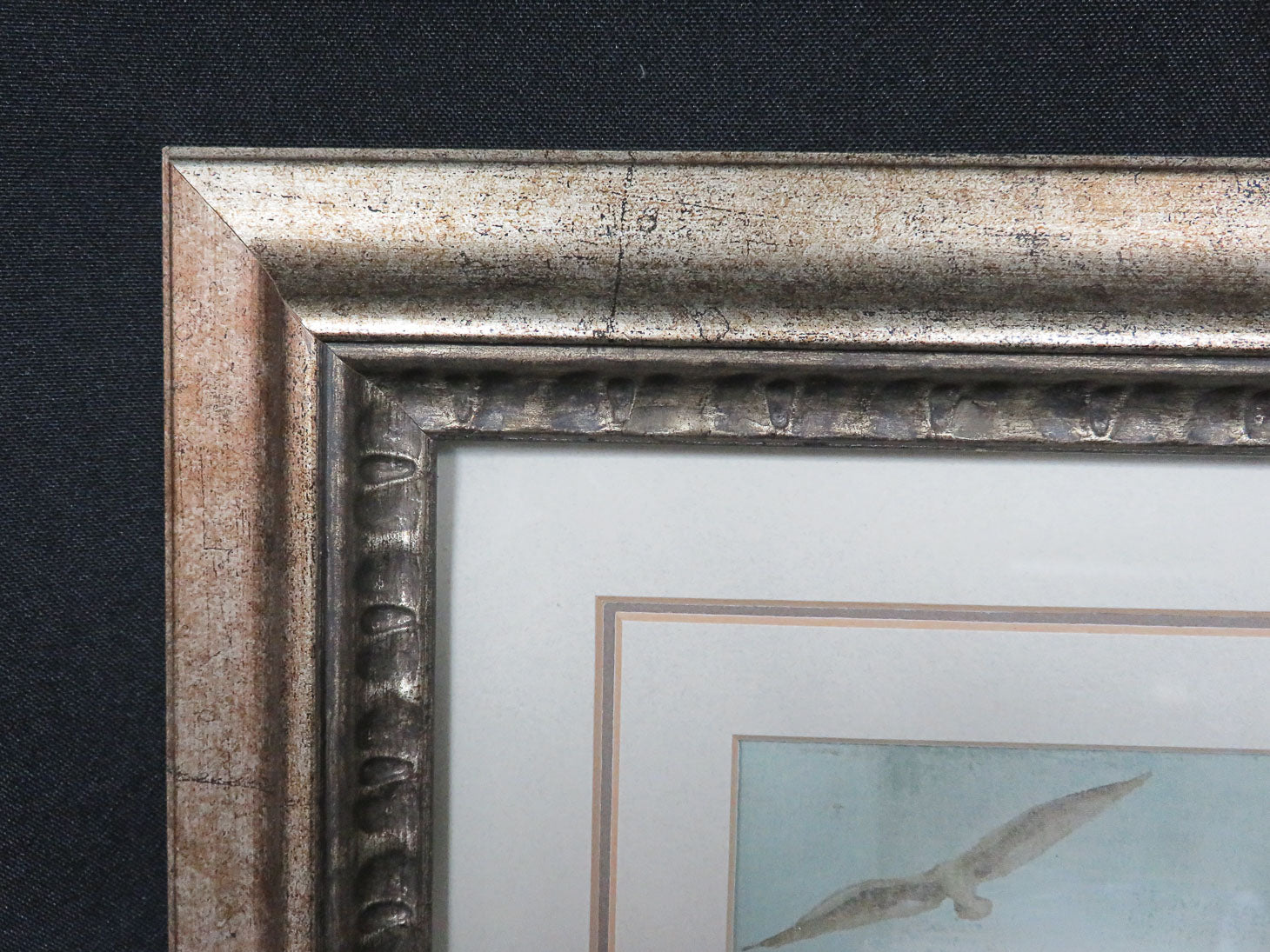 Floral with 2 birds and a starfish, abstract beach design, cream color mat with gold frame