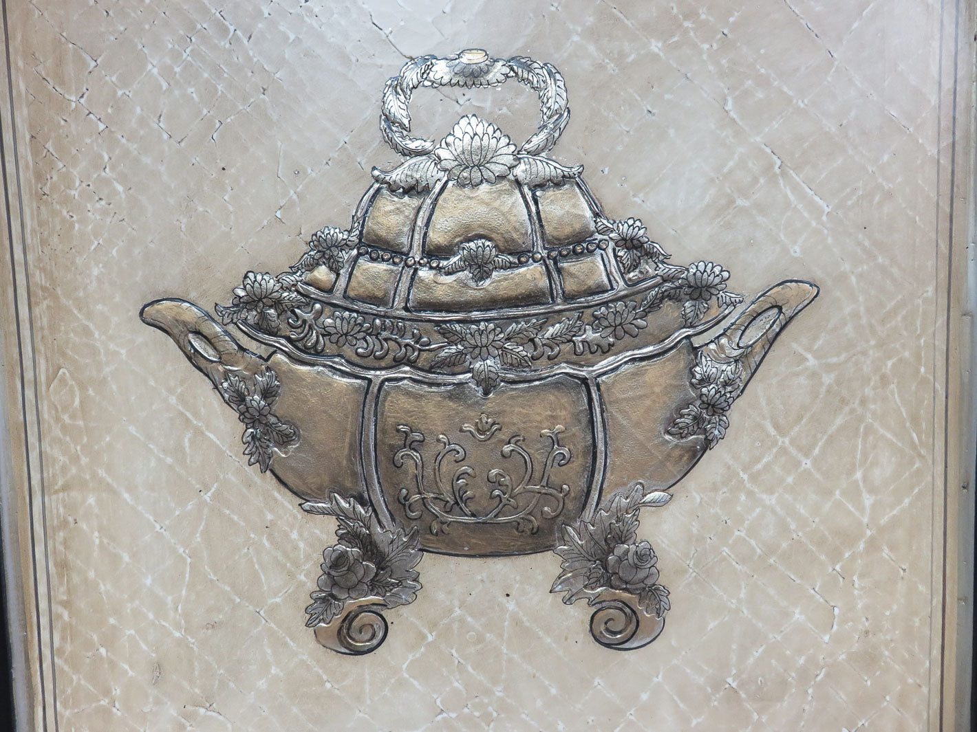 Item Number: 2087-759 Covered urn embossed in metallics. Framed in a black and gold frame with stenciled floral details. 32" x 32"