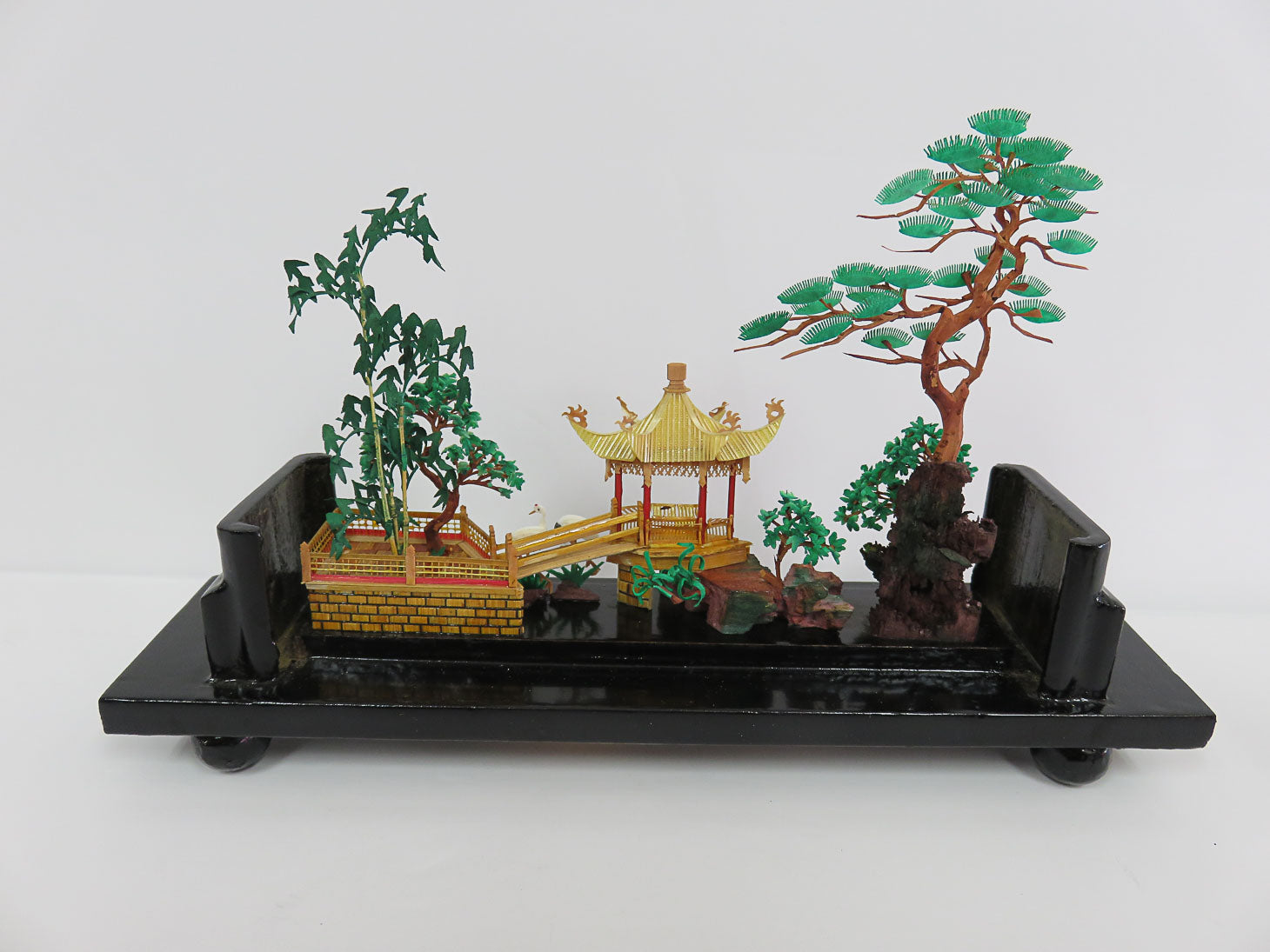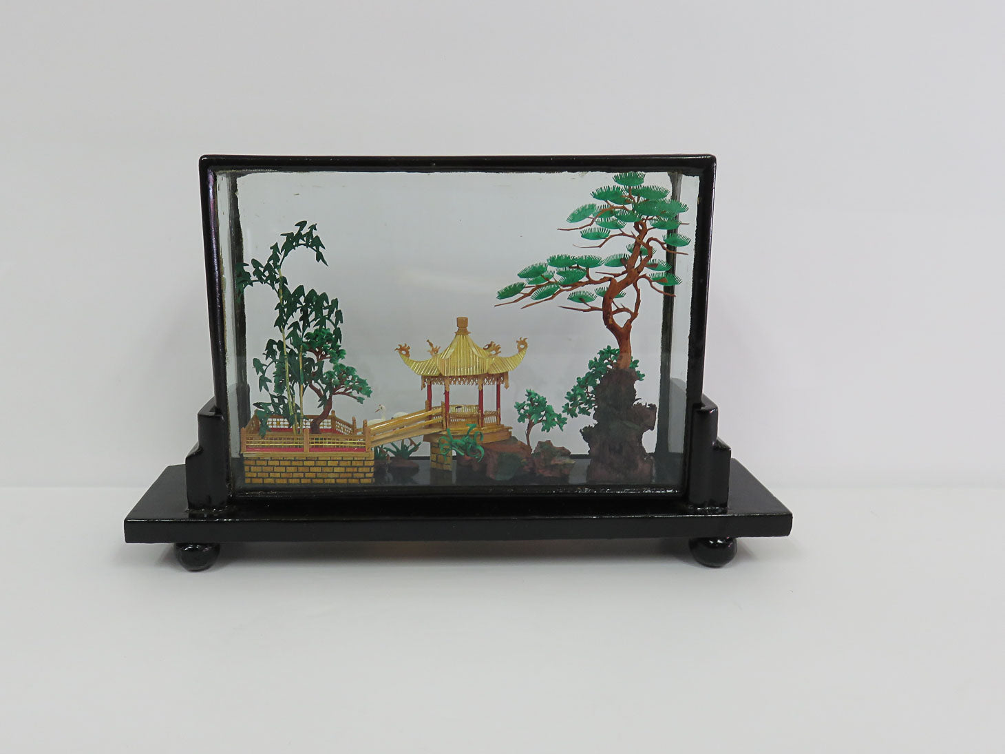 Green and brown trees, cranes, pagoda in glass case on wood stand, 2 pc