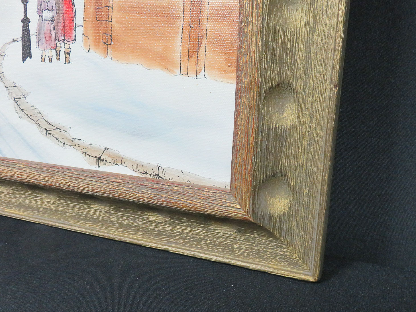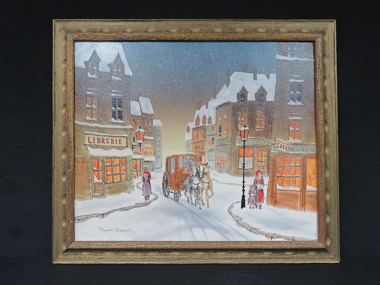 Winter scene with horse-drawn carriage and buildings, gold tone frame.