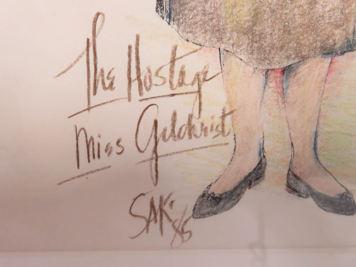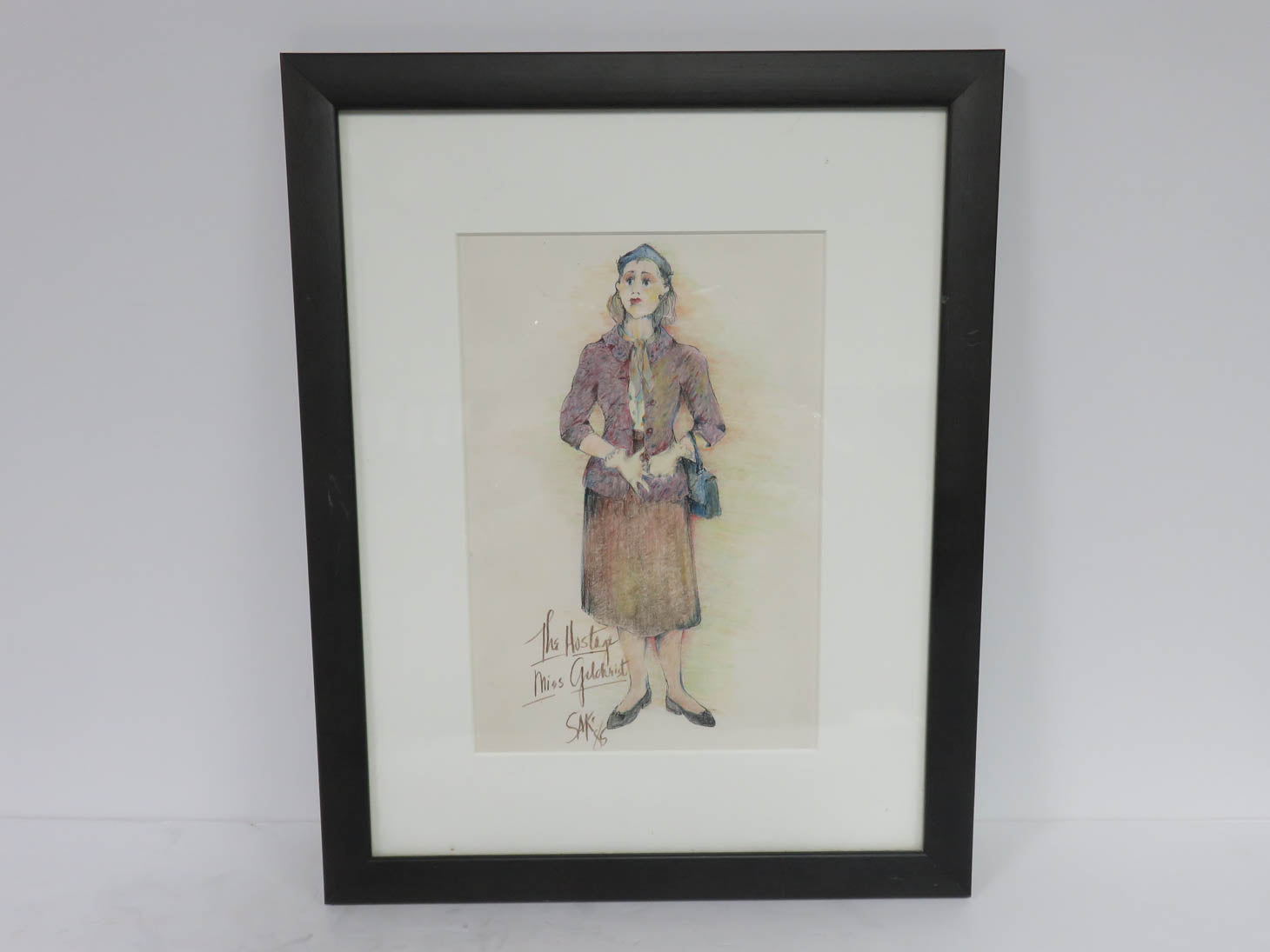 By Sheila Kehow, woman in vintage clothing from production of "The Hostage" in a black wood frame, 1985