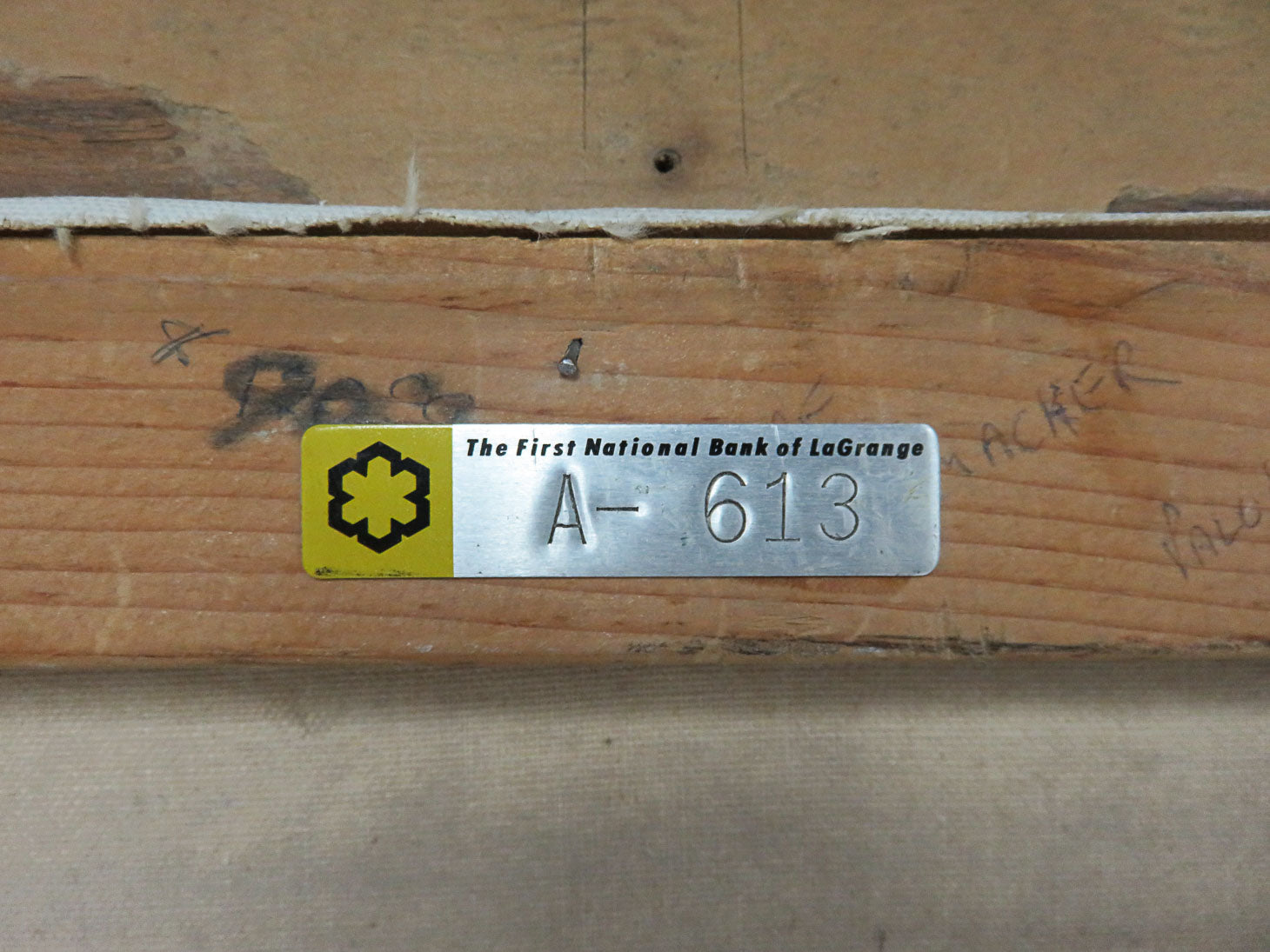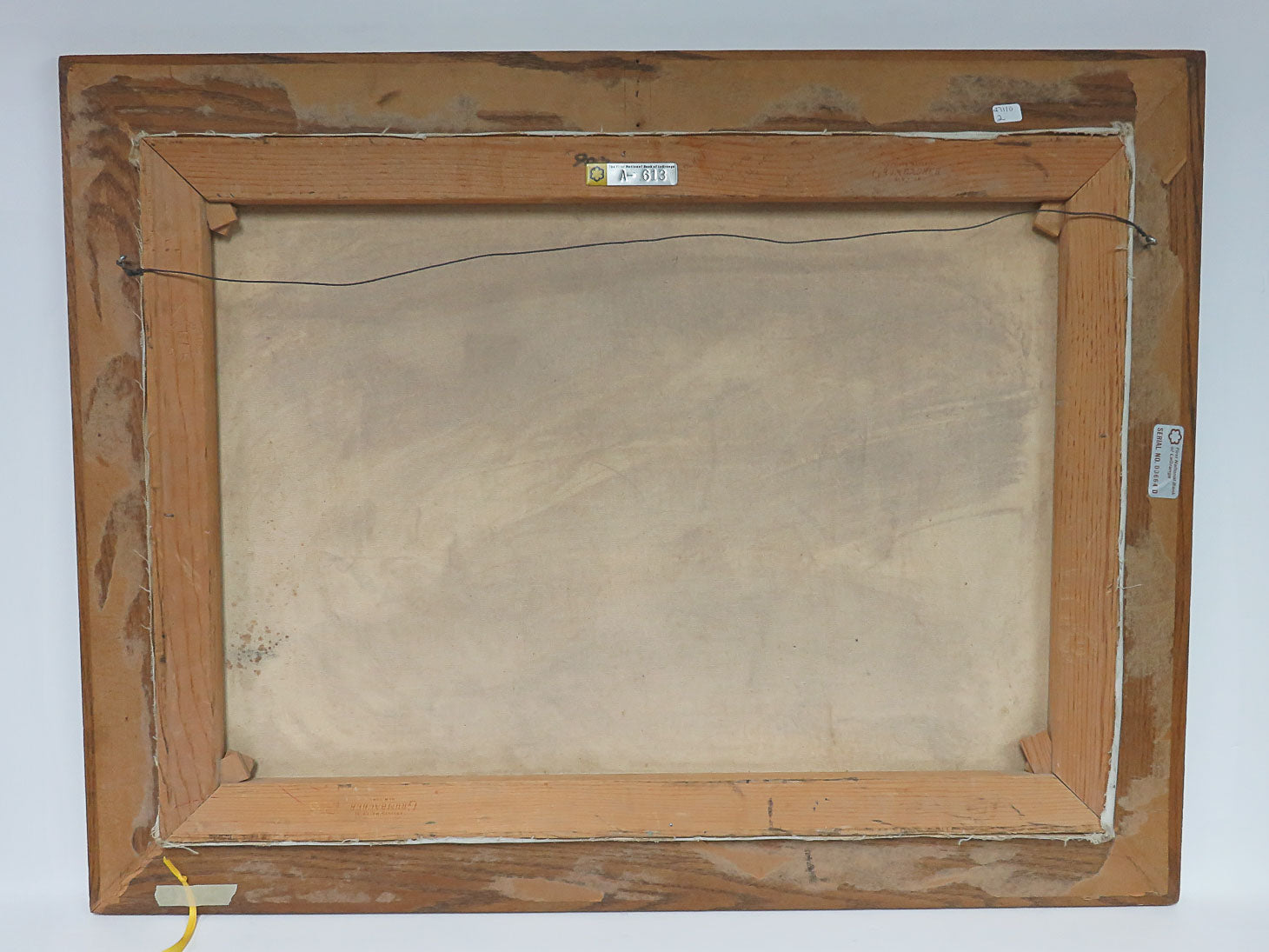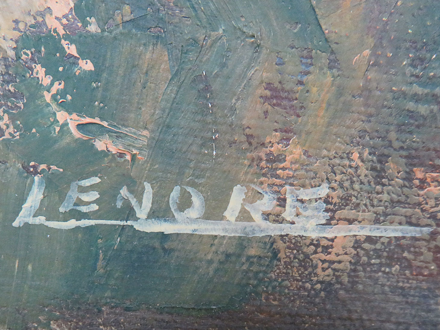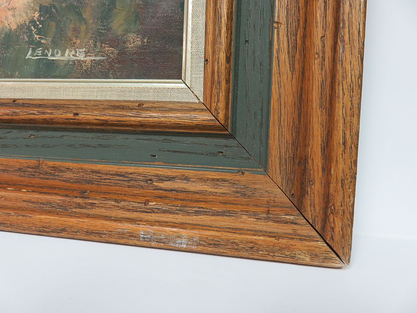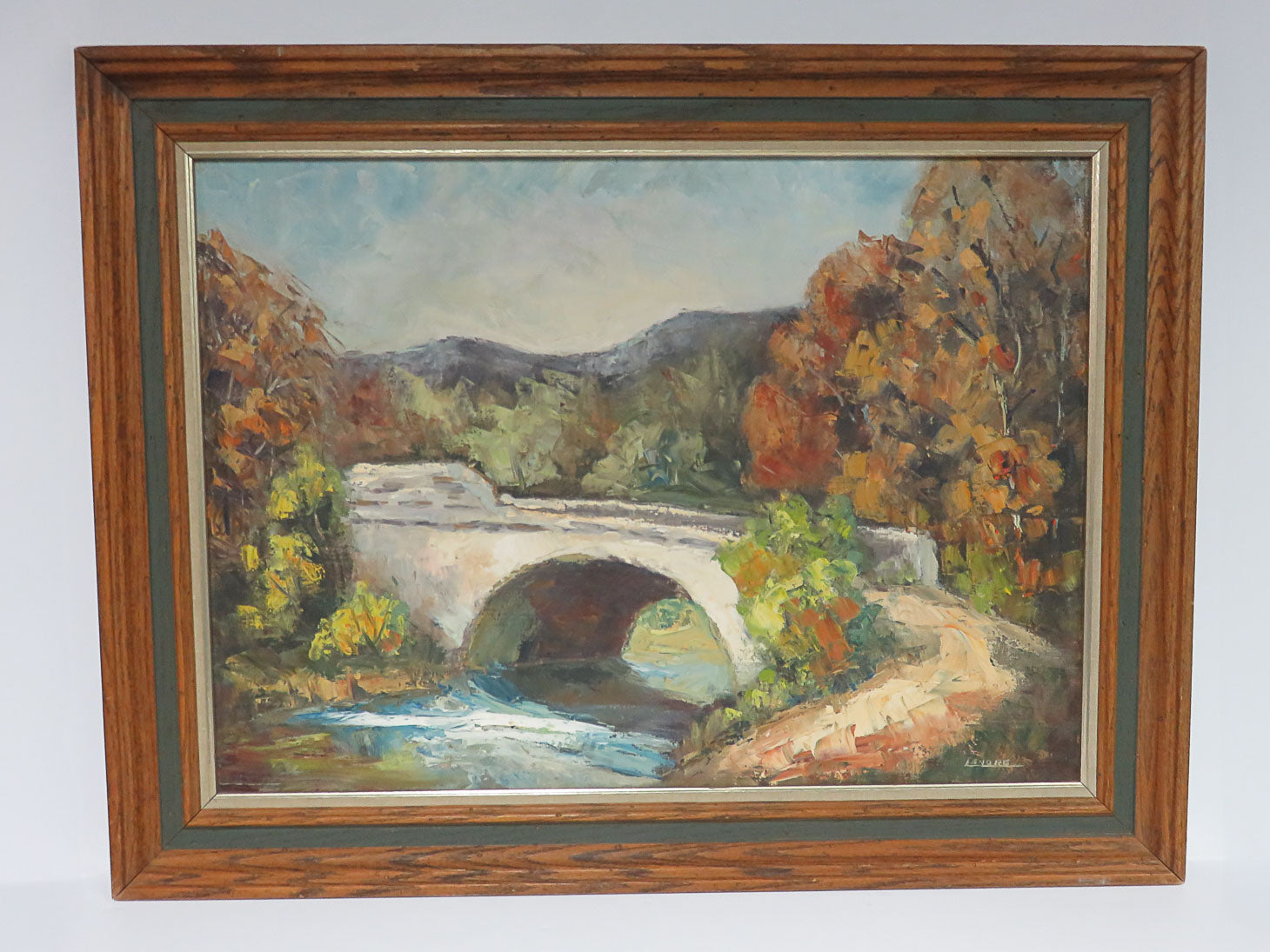 Bridge and mountain scene, wood frame with dark green accents, signed "Lenore" possibly Lenore Beran.