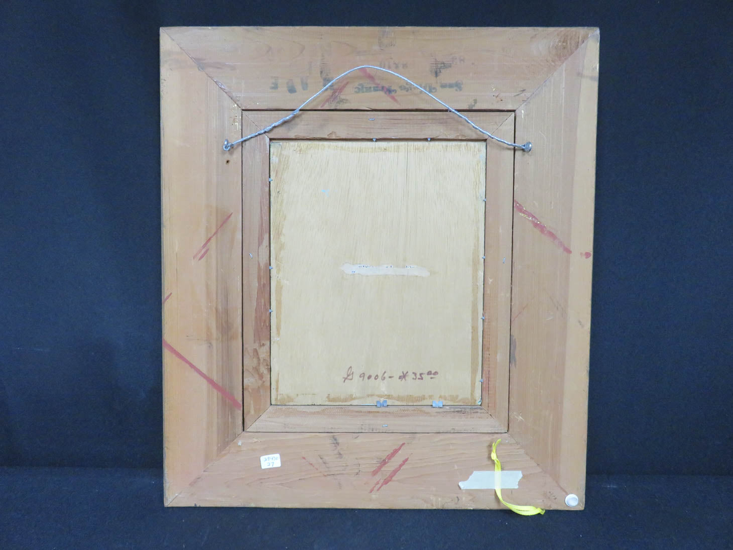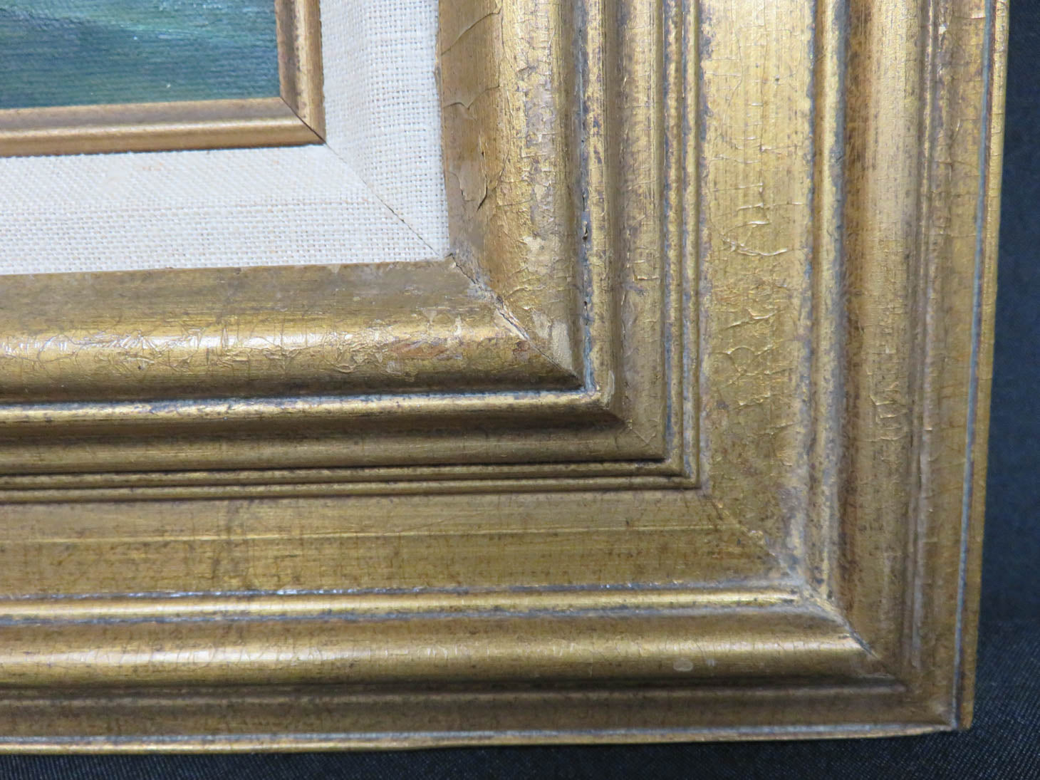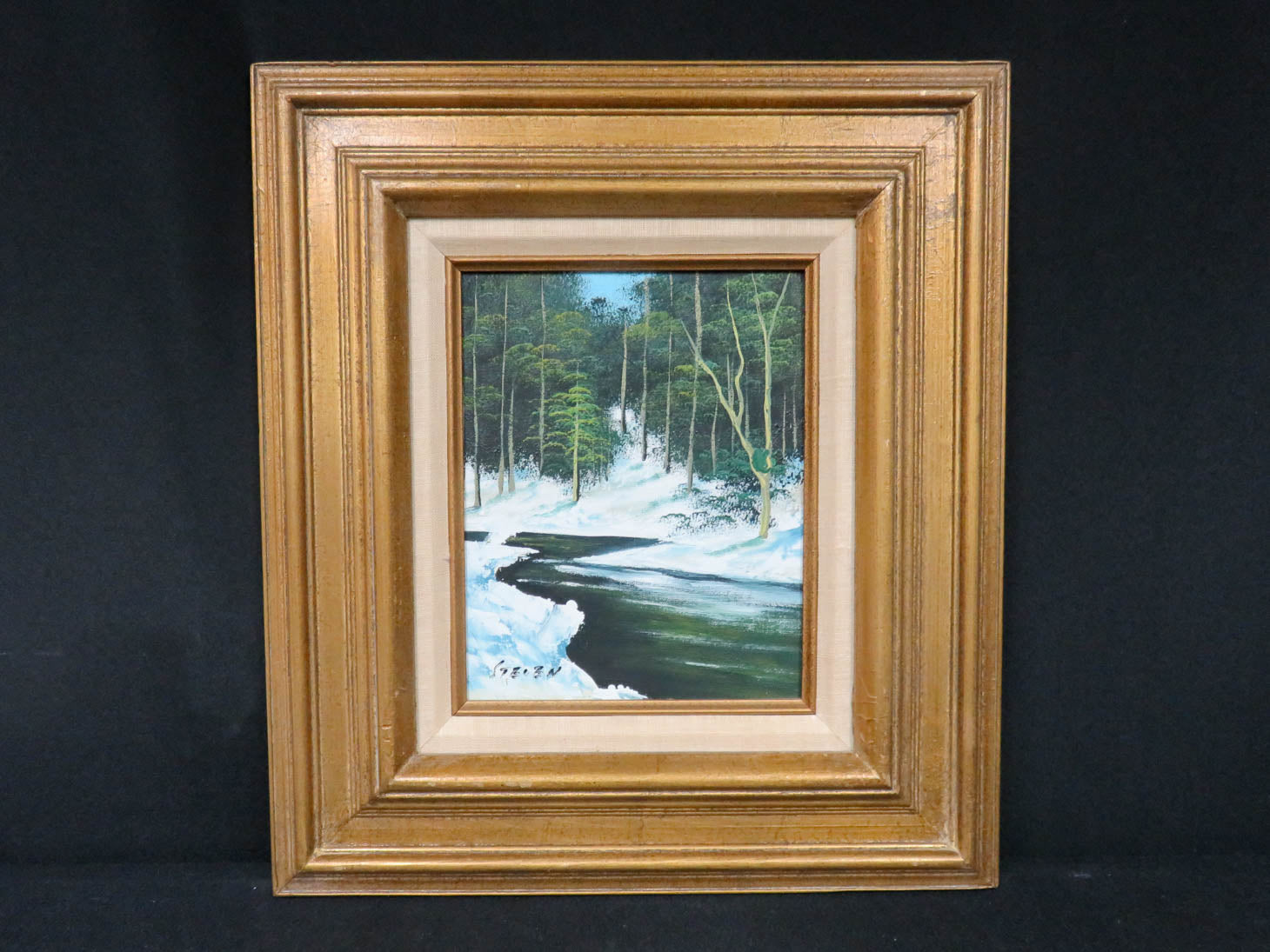 Item Number: 29432-27 Original, winter scene, stream with pine trees, burlap mat, wood frame. 16" x 18.5"