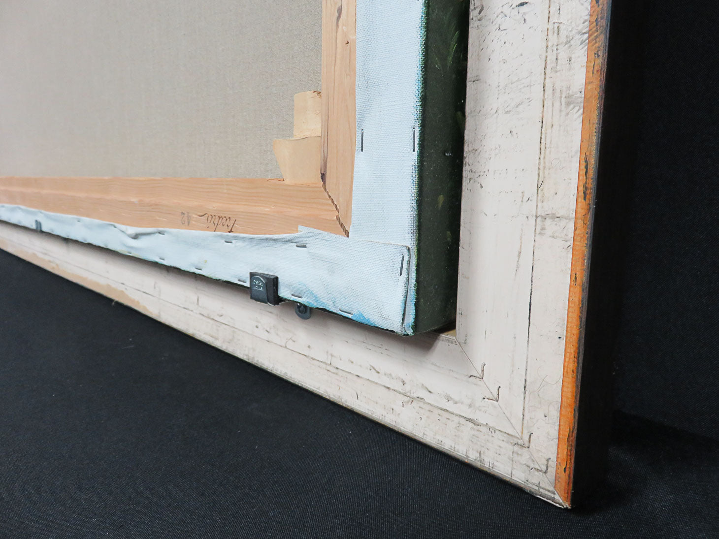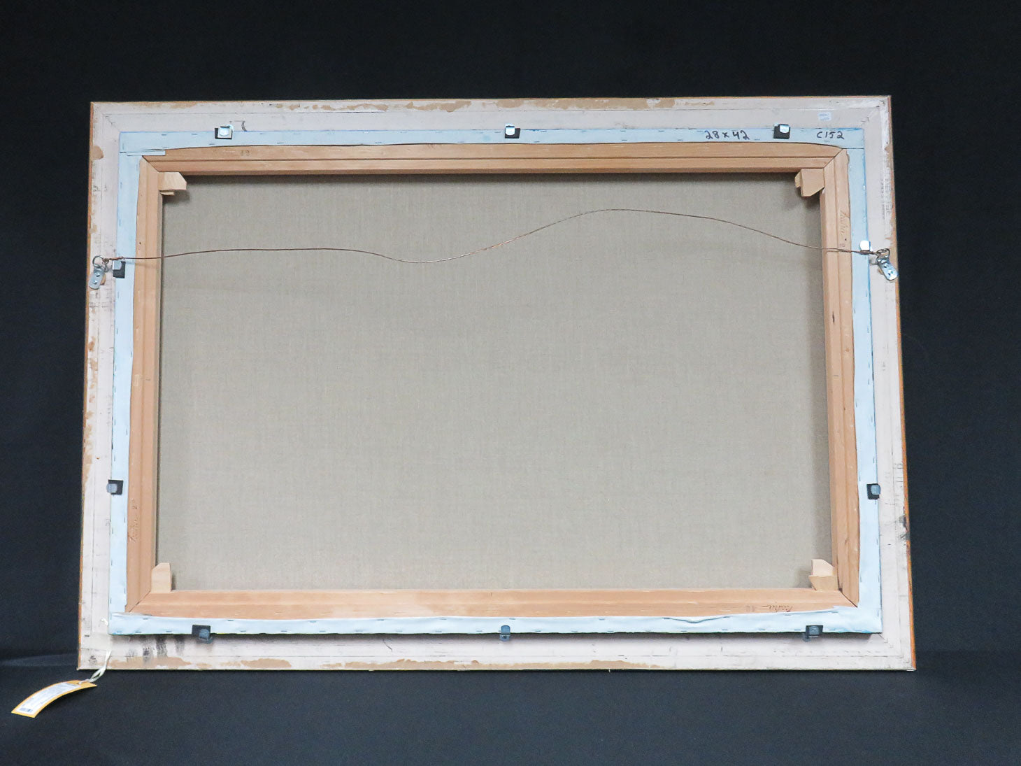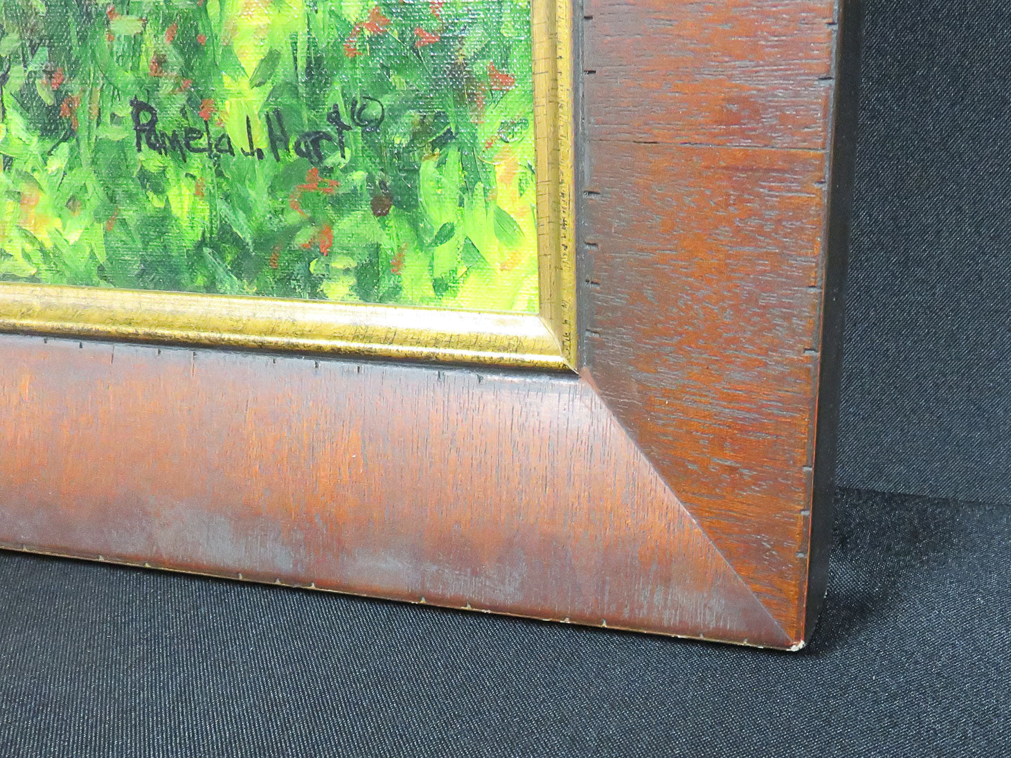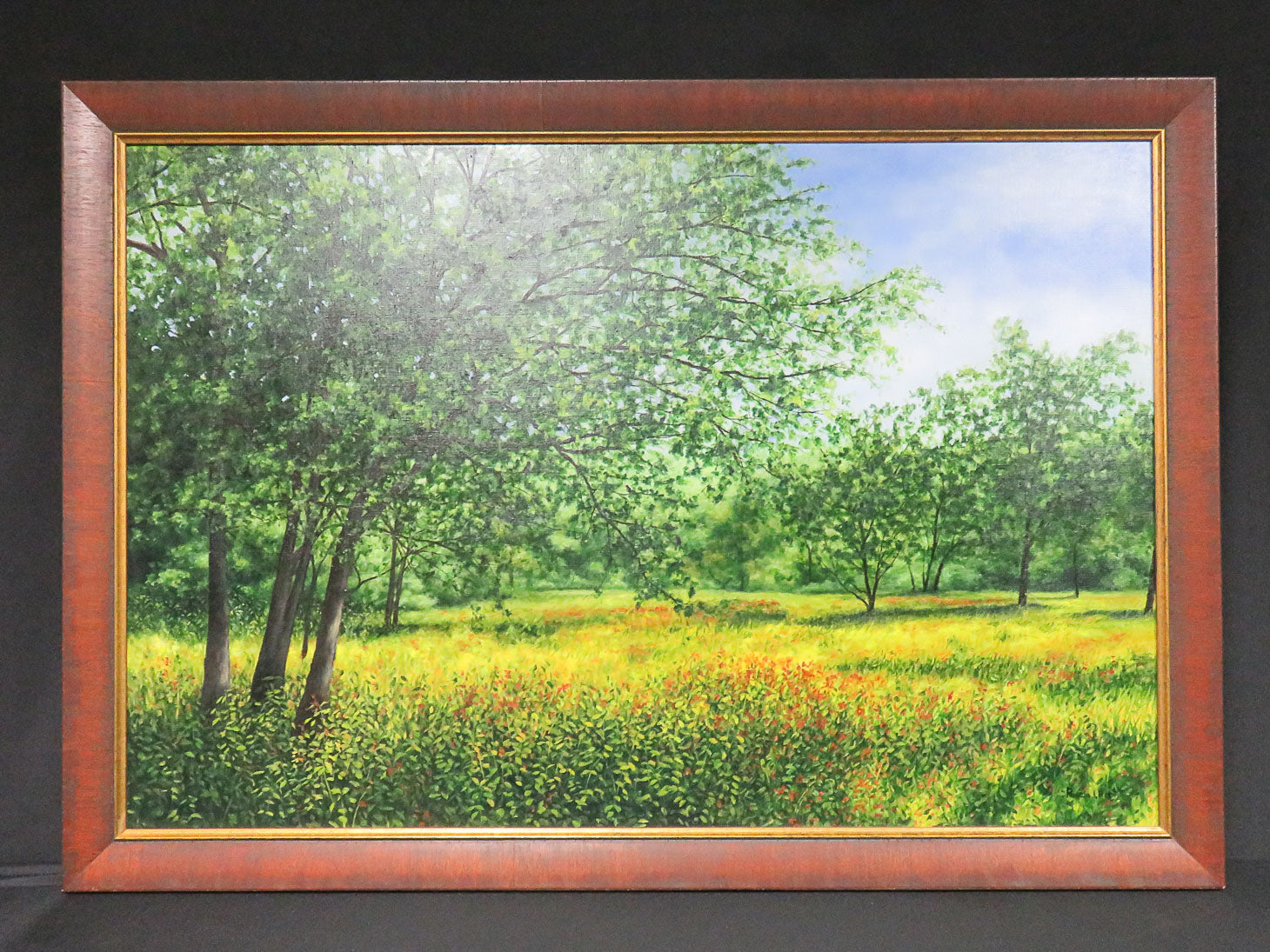 Landscape oil of a field of yellow and green with large green trees; brown wood frame with gold accents