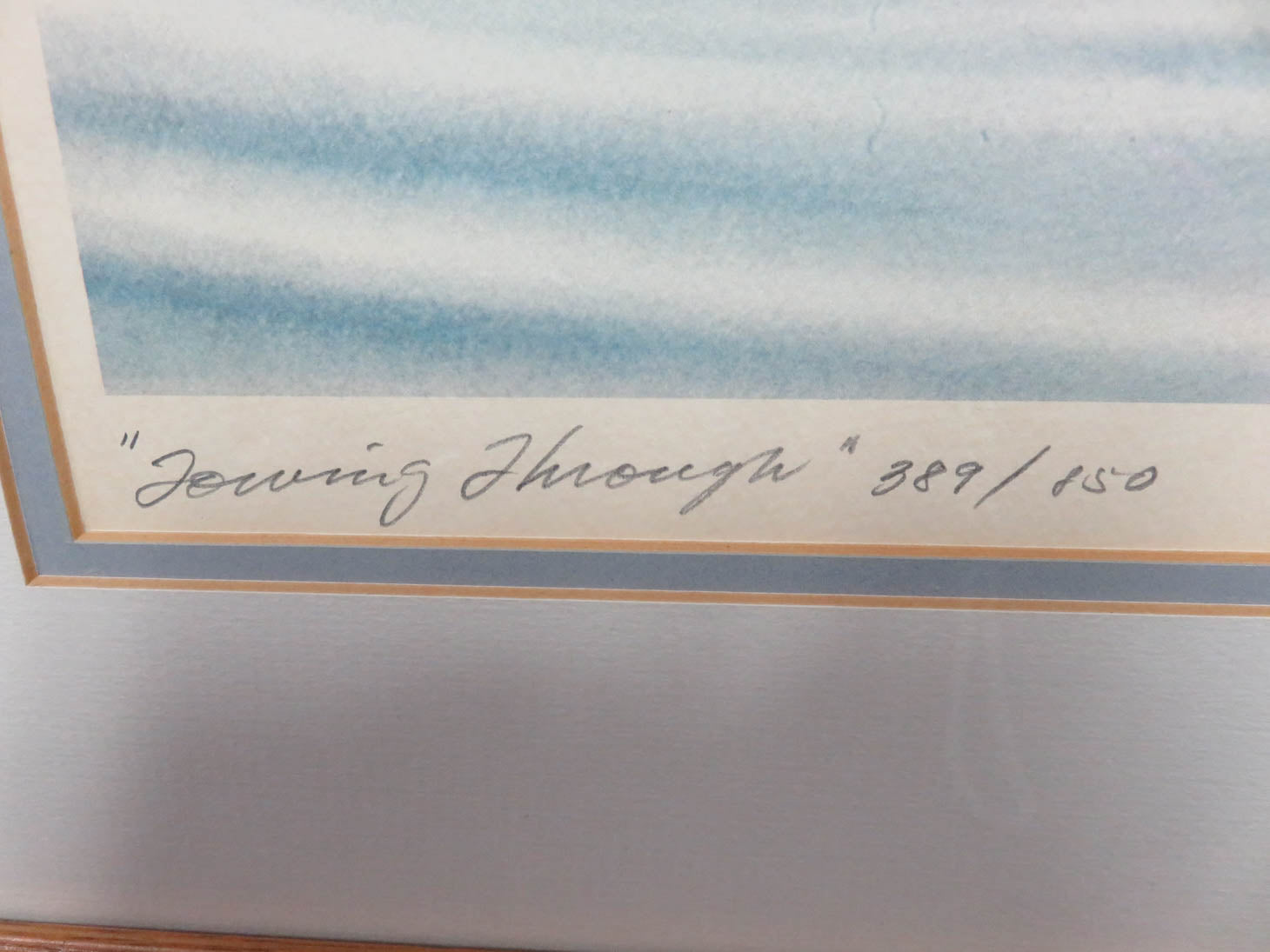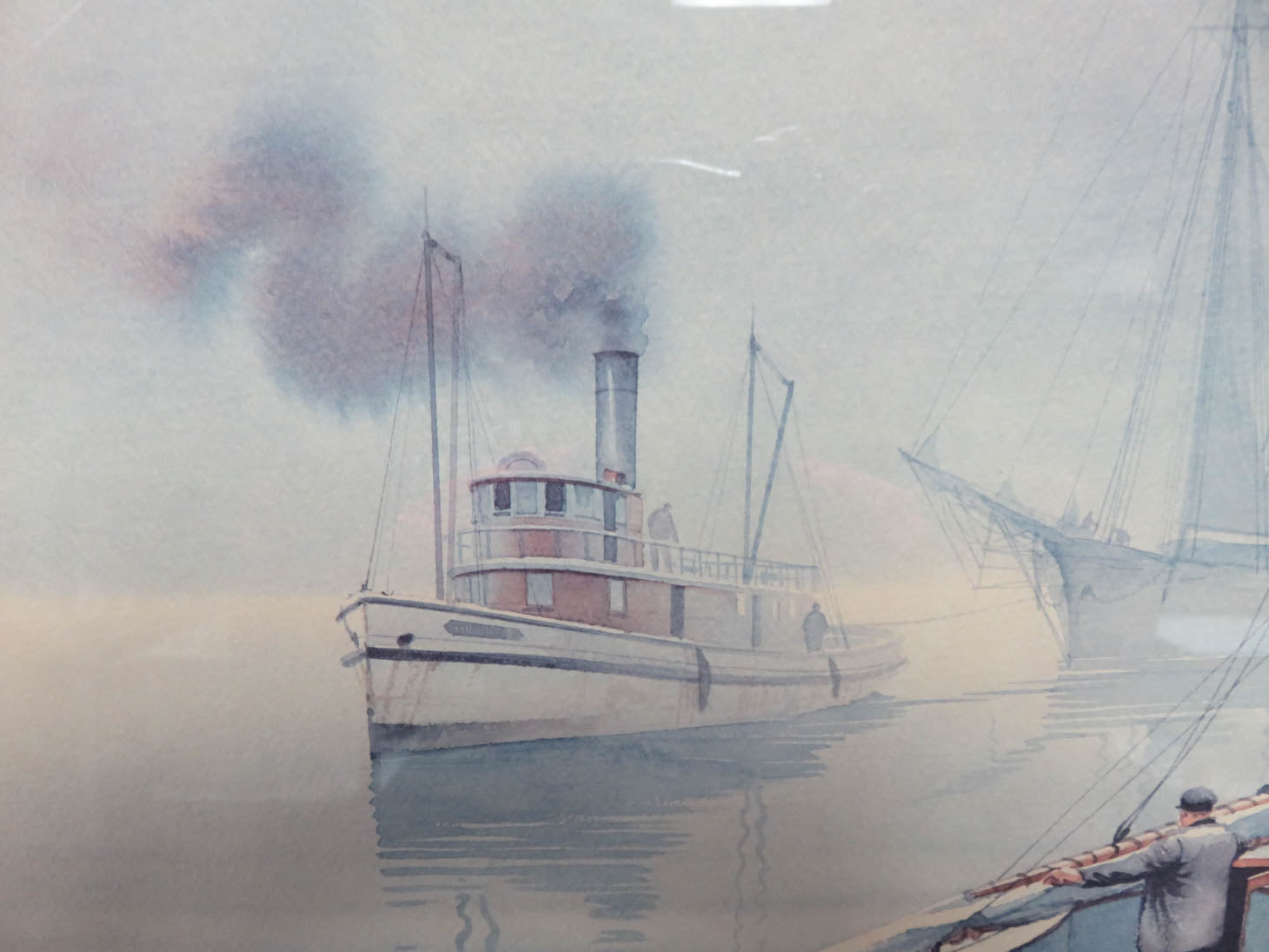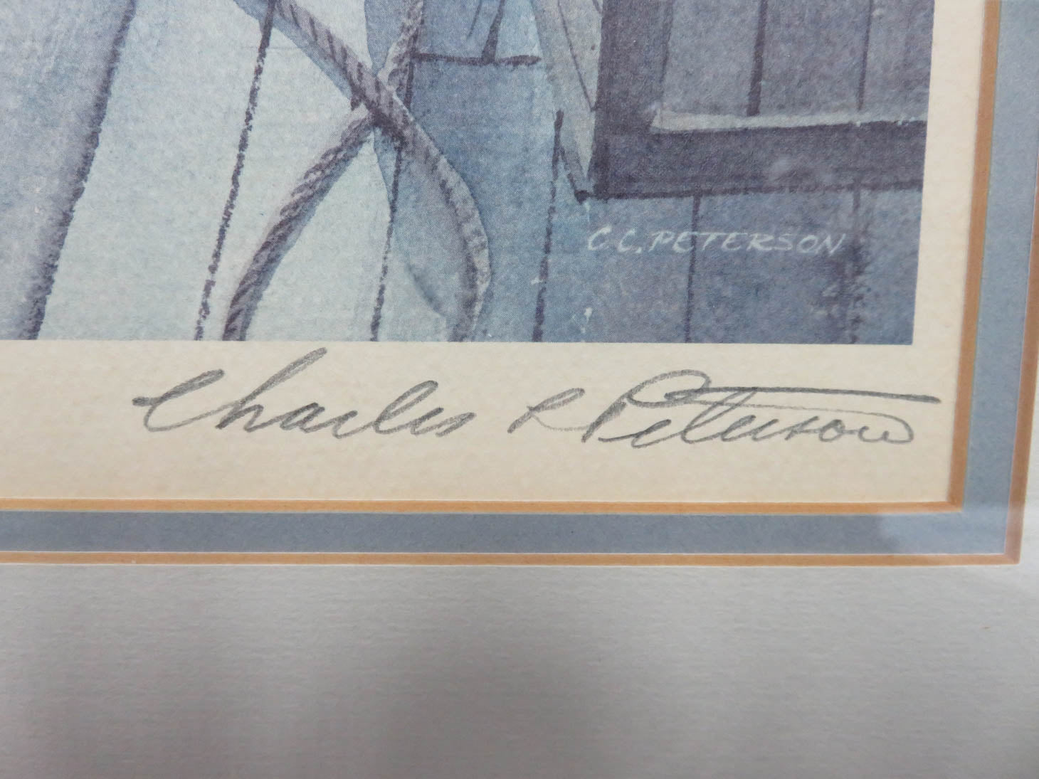 Sturgeon Bay harbor scene, signed by Charles Peterson, 389/850 in a faux wood frame