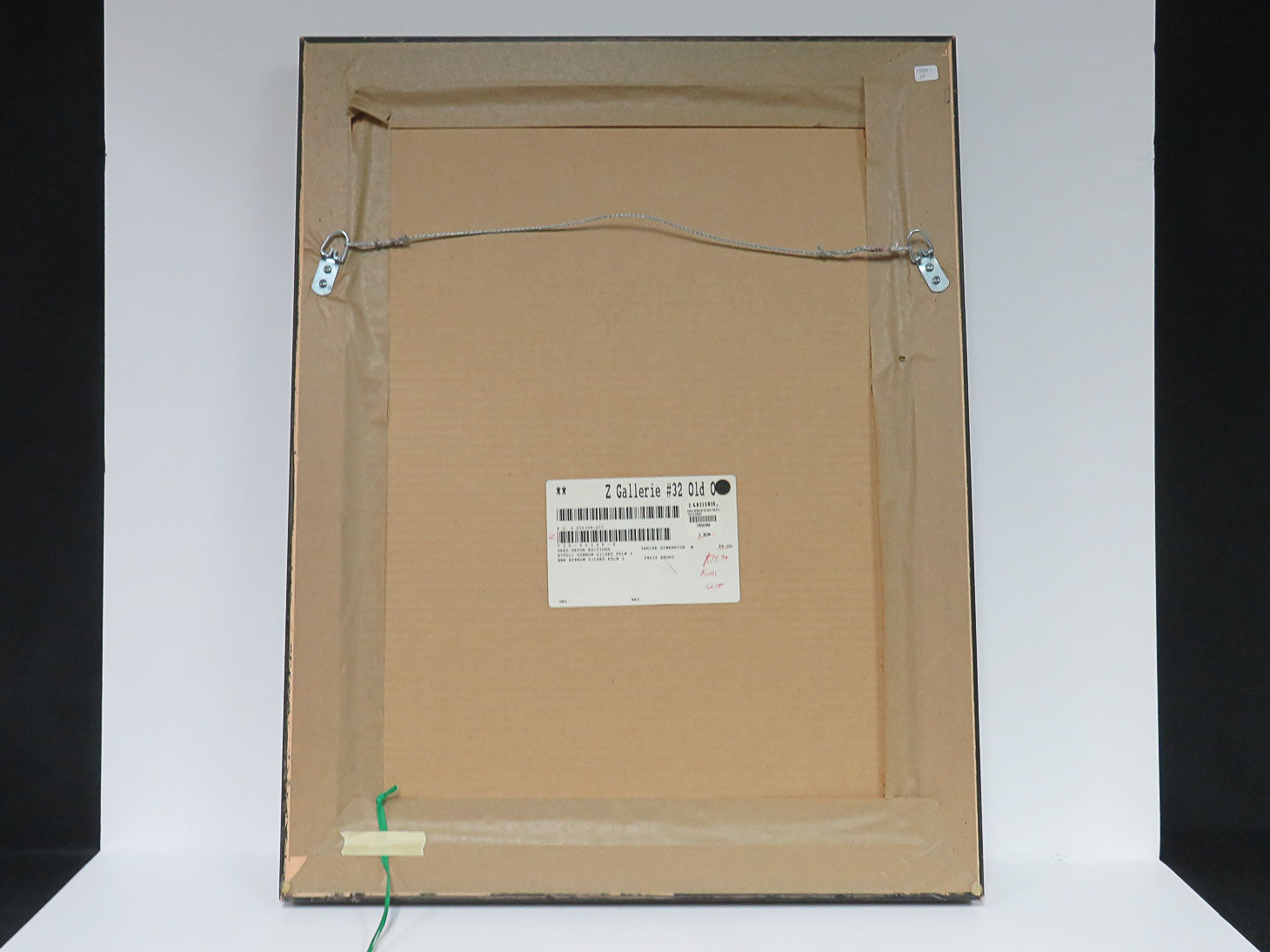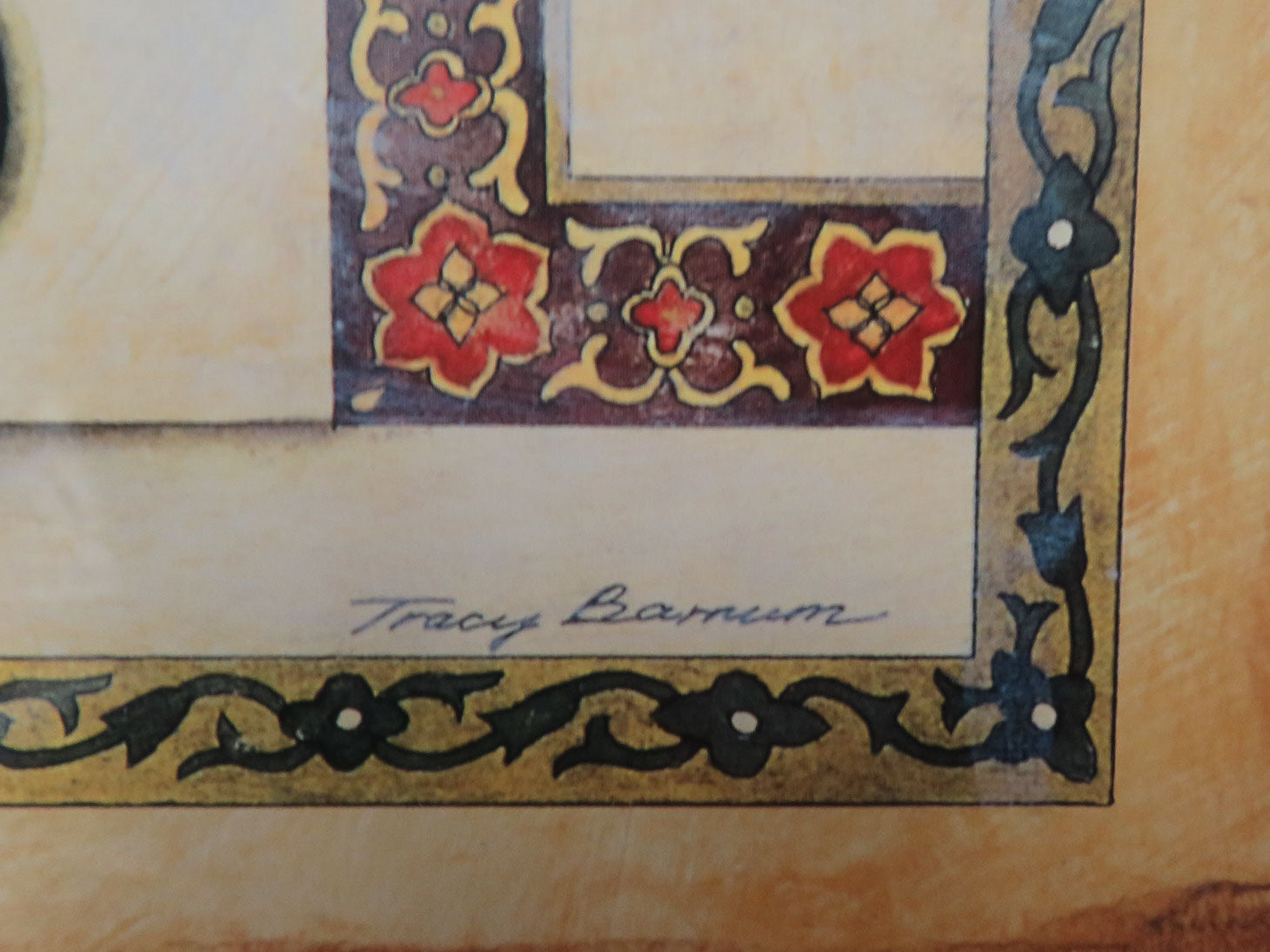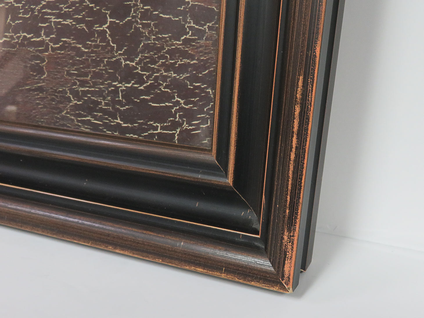 Banana leaves in pot within archway design. Crackle-look mat and distressed black frame.
