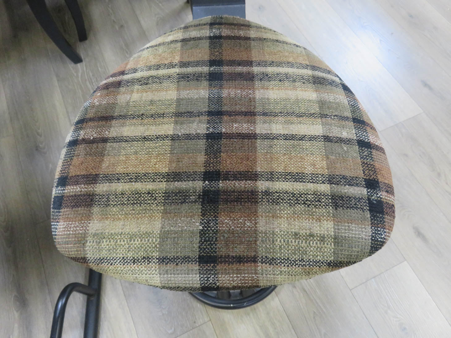 Triangular blue backs, plaid fabric on seats, black base and foot rests. 2 chairs on floor/2 in warehouse for viewing. 18" x 21" x 38"H Seat is 16"W x 24"H