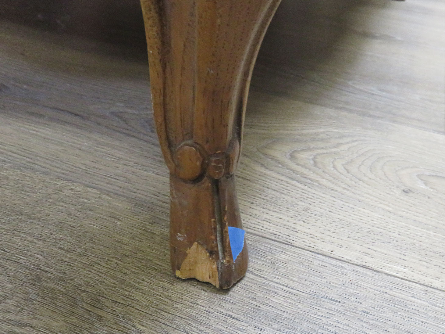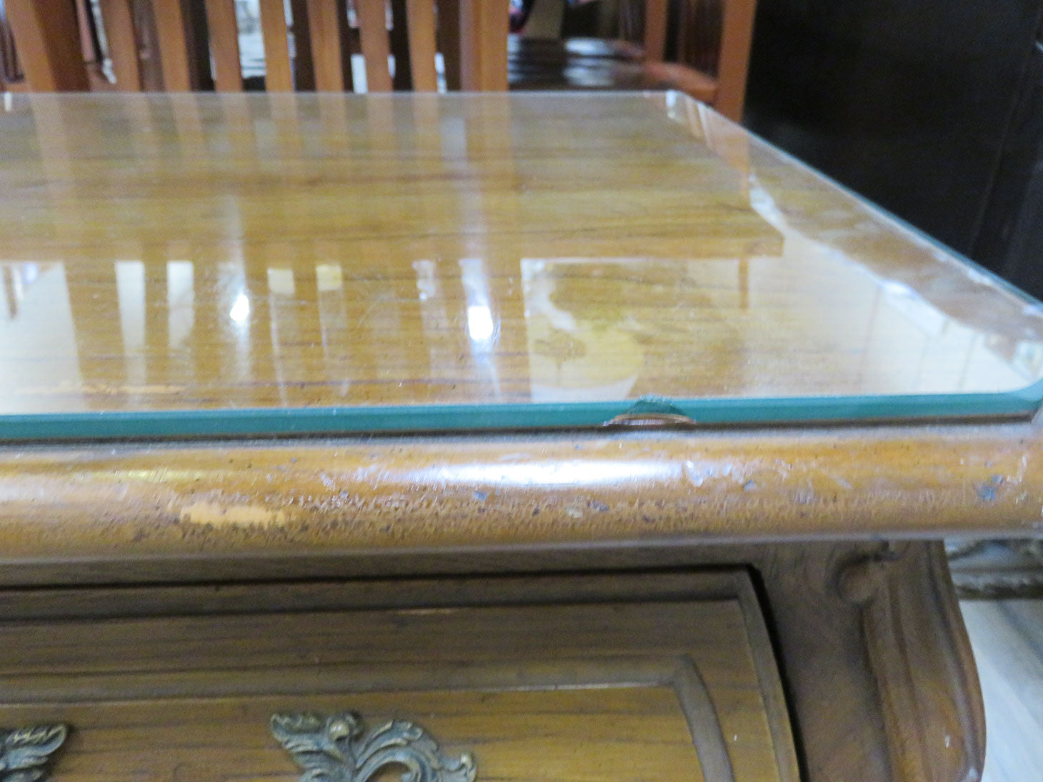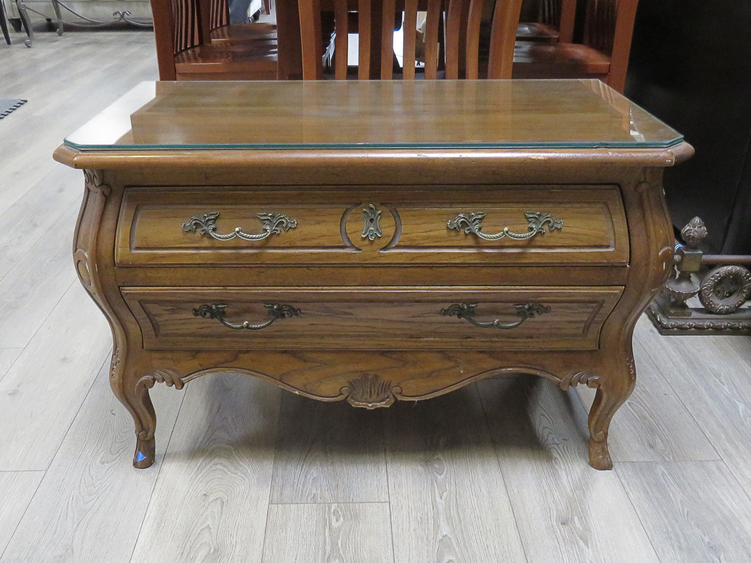 Item Number: 22774-88 Two drawers with French Provincial antique brass pulls. Removable glass top. Carving, cabriole legs with hoof feet. 33.5" x 19" x 22"