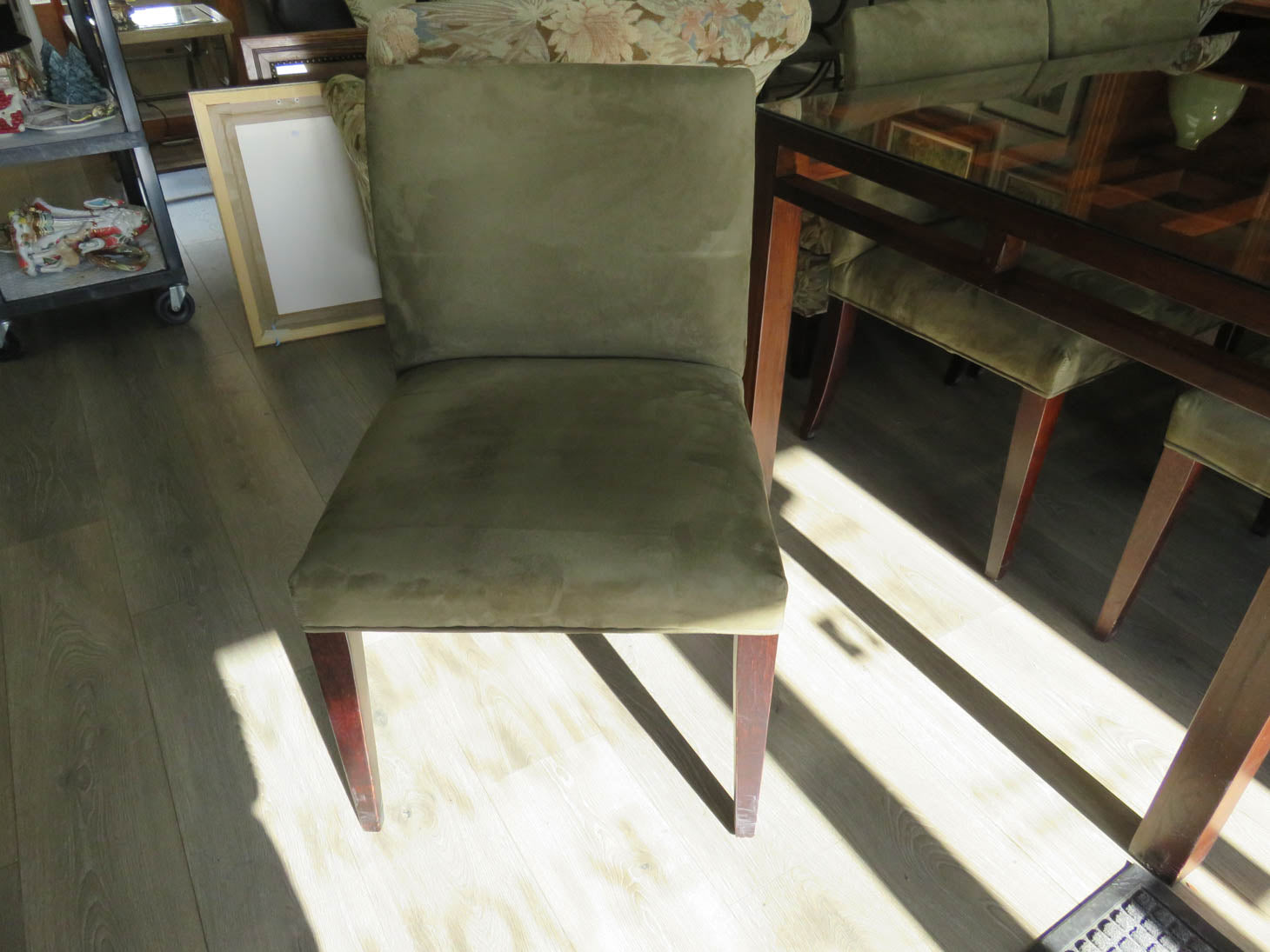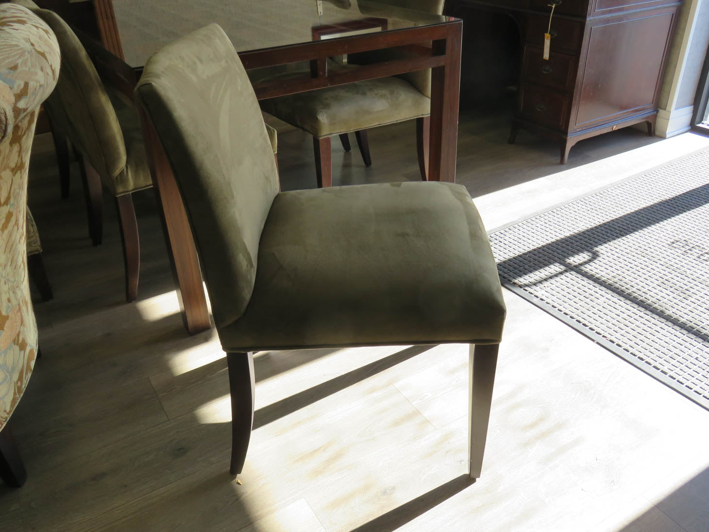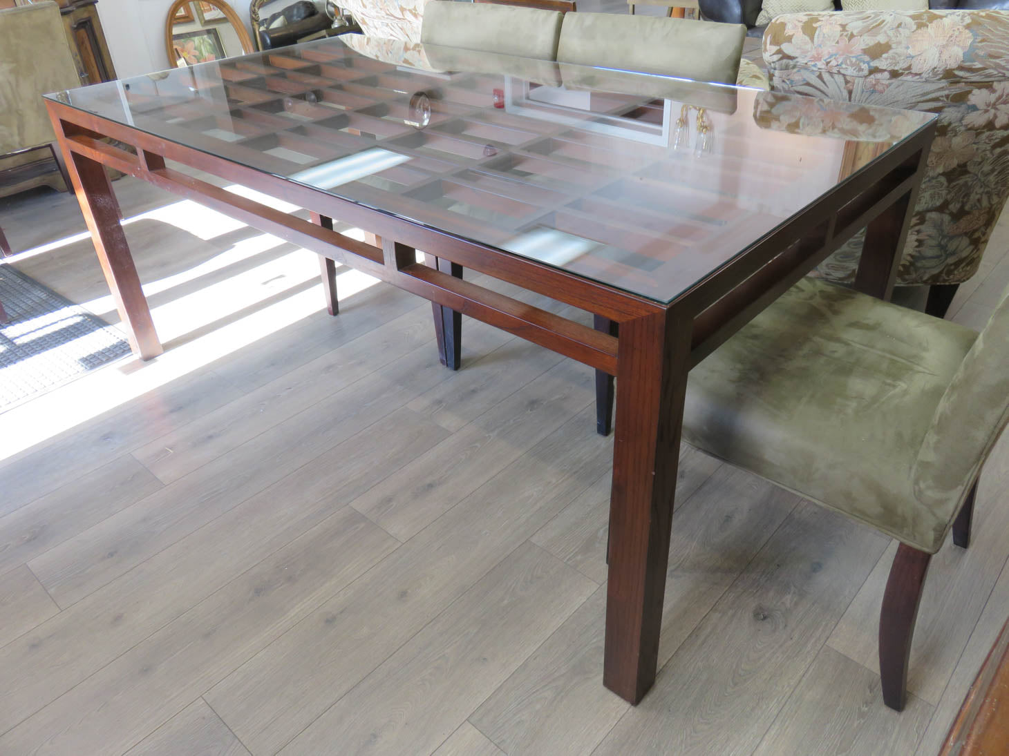 Dark wood with grid pattern under glass top. 6 side chairs with sage green faux suede upholstery and saber legs