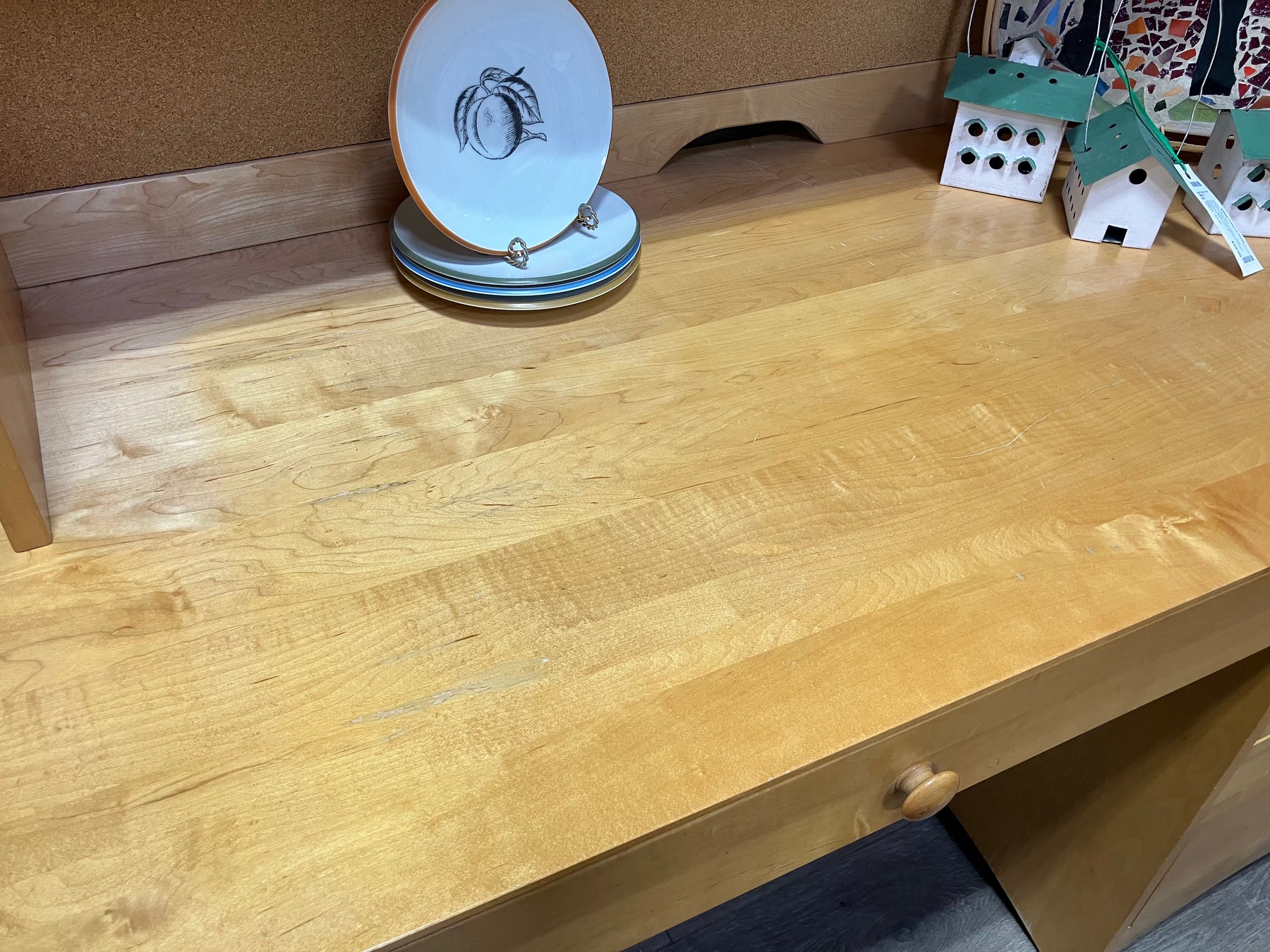 Light wood, 4 drawers, one flips down. Hutch illuminates has bulletin board and shelves on top. Condition issues on desk top.
