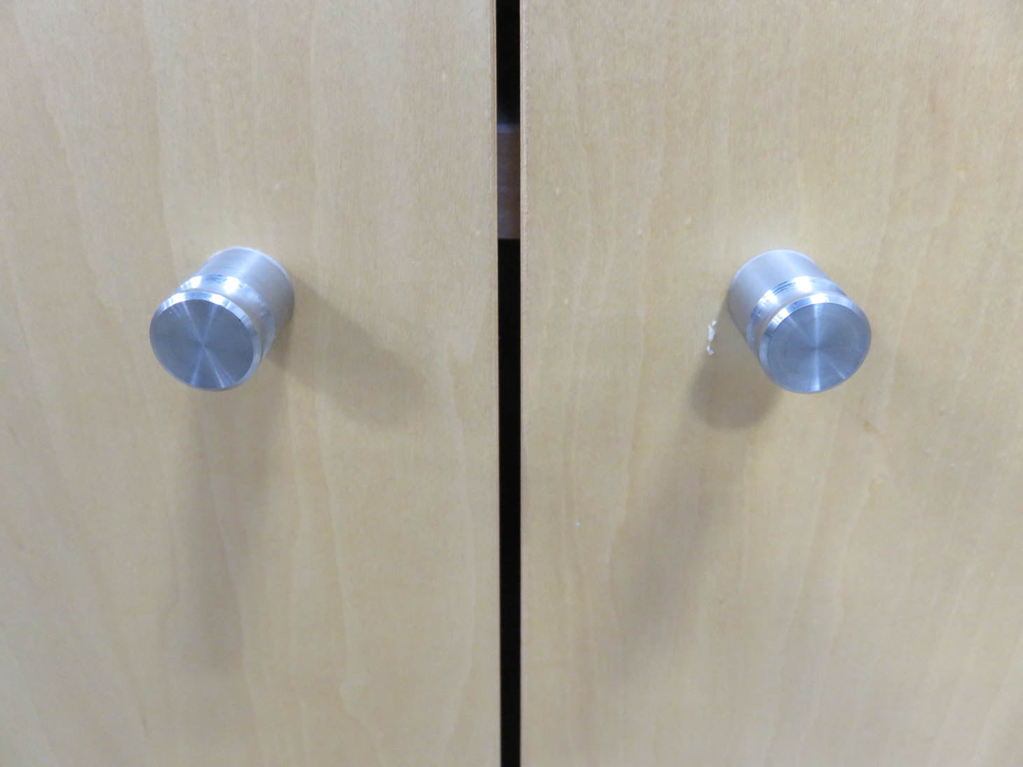 Light wood with 2 shelves, 2 doors with one shelf inside. With brushed nickel knobs