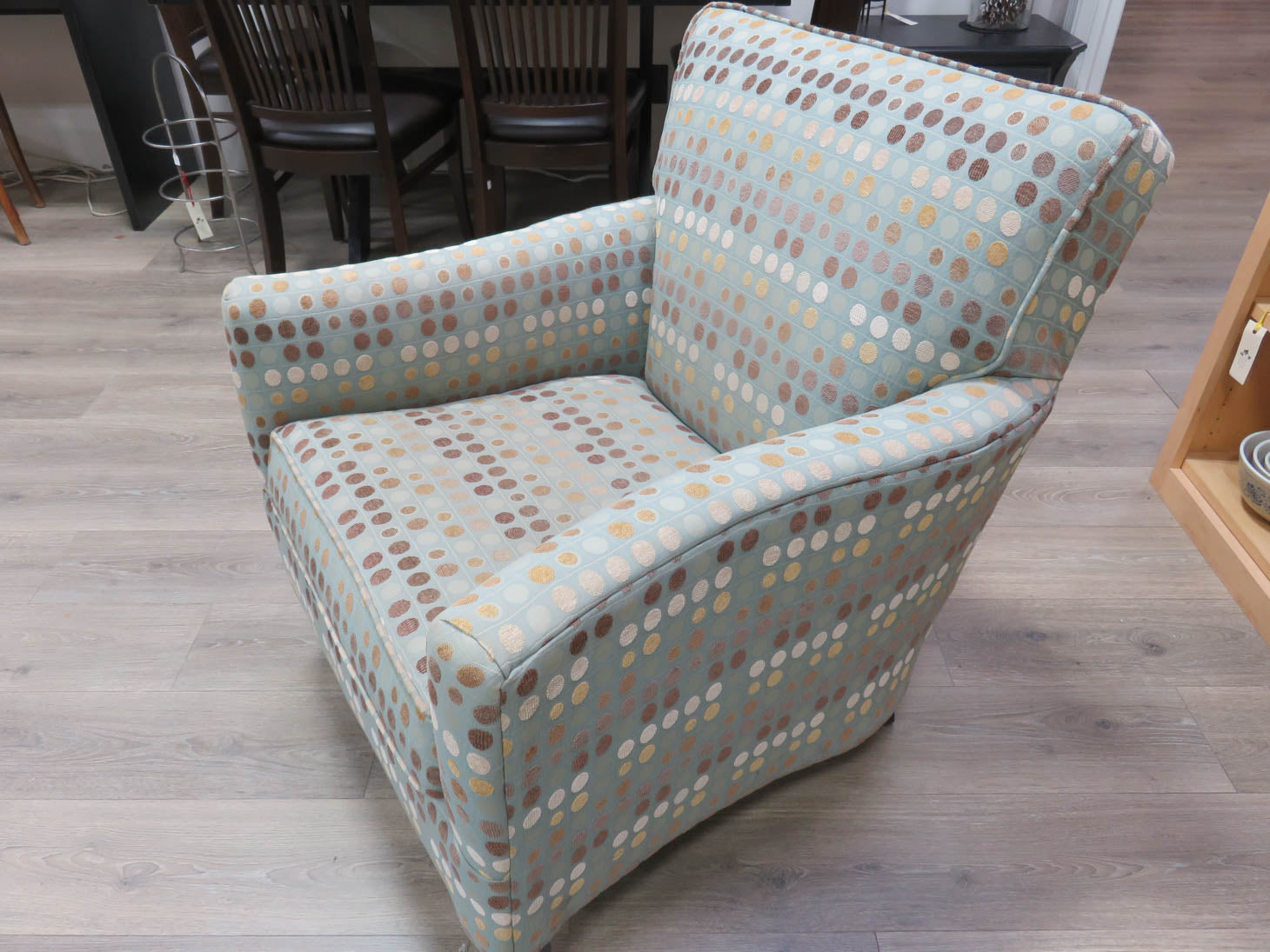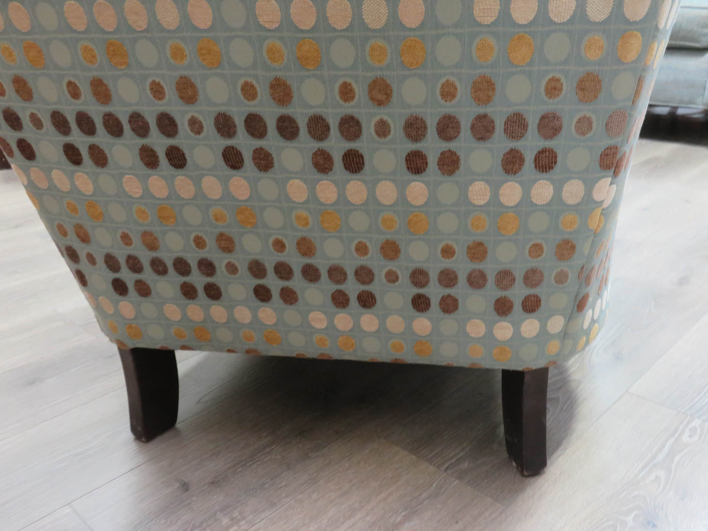 Multicolored dot print fabric, seat cushion and exposed wooden legs. Fabric has wear to seat and arms. Two chairs available, sold separately.  #29451-2.