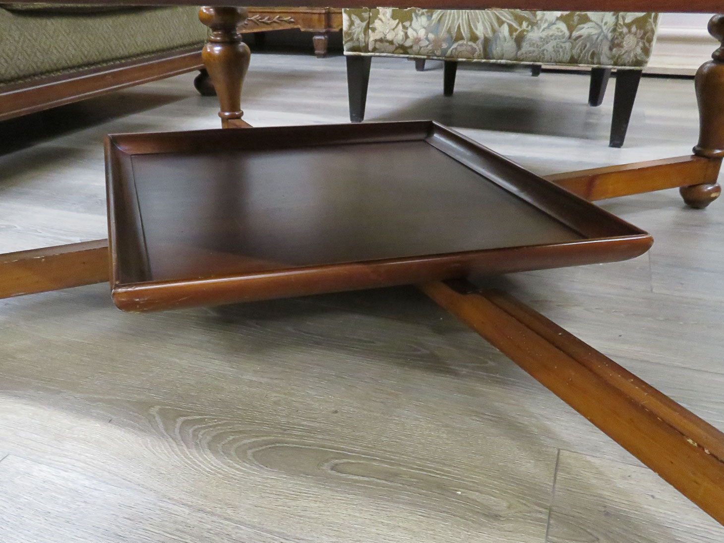 Square with wooden base and 4 pull-out trays. Large removable tray resting on base.