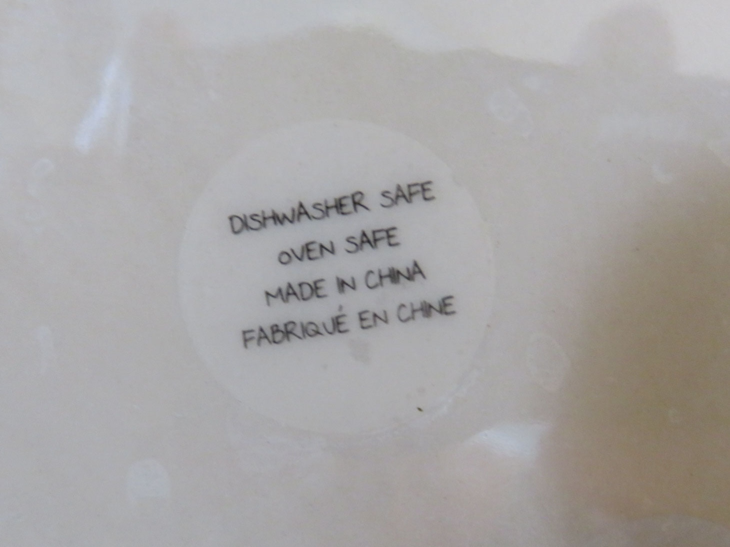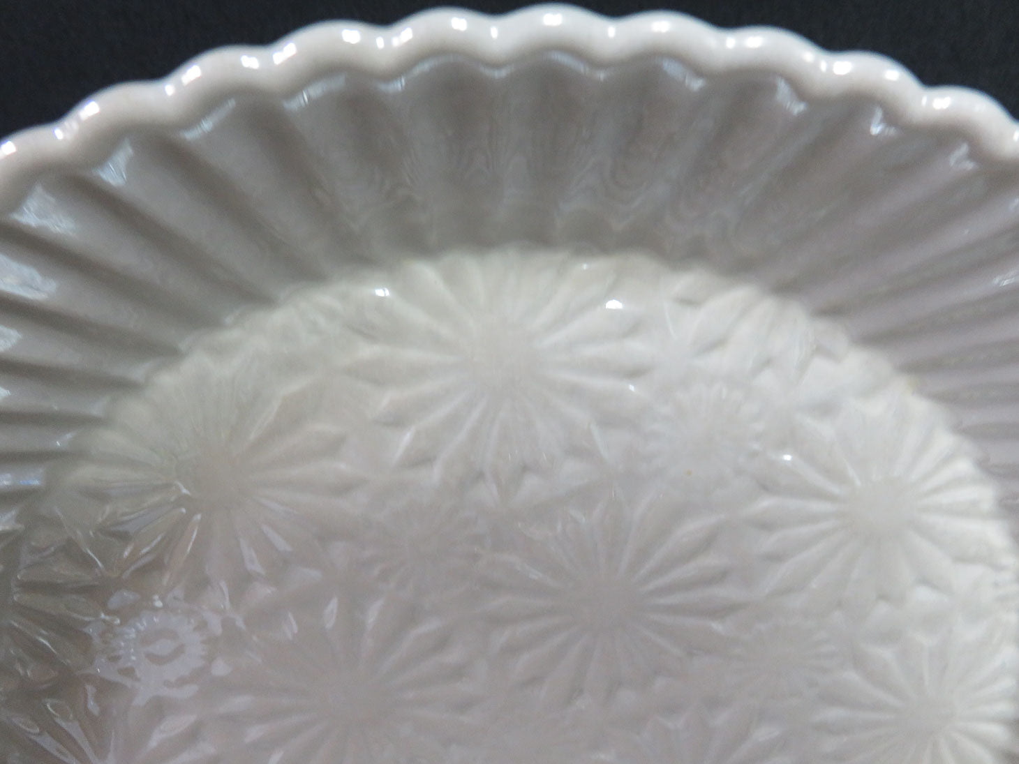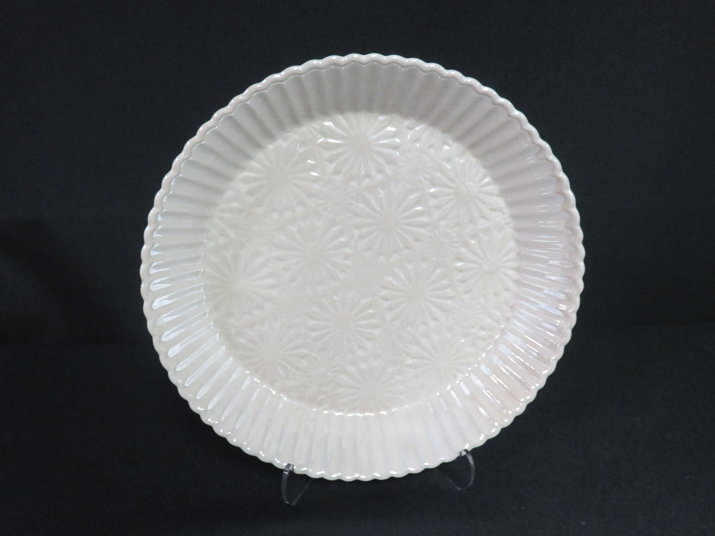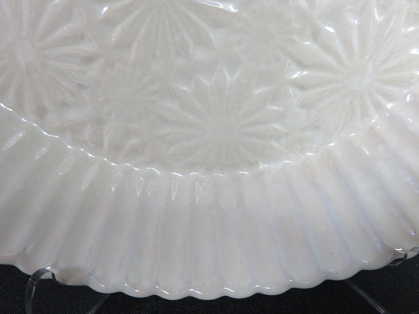 Item Number: 29147-35 Anthropology iridescent dish with ribbed and scalloped edge and daisy design in center 10" x 1.25"