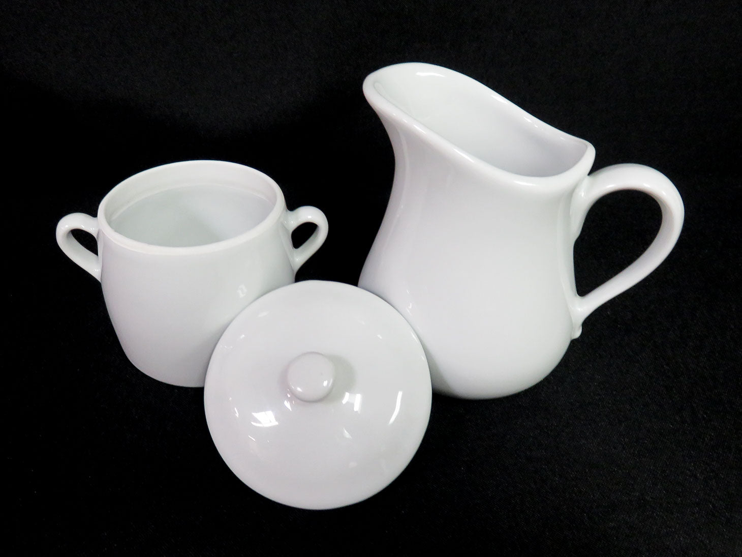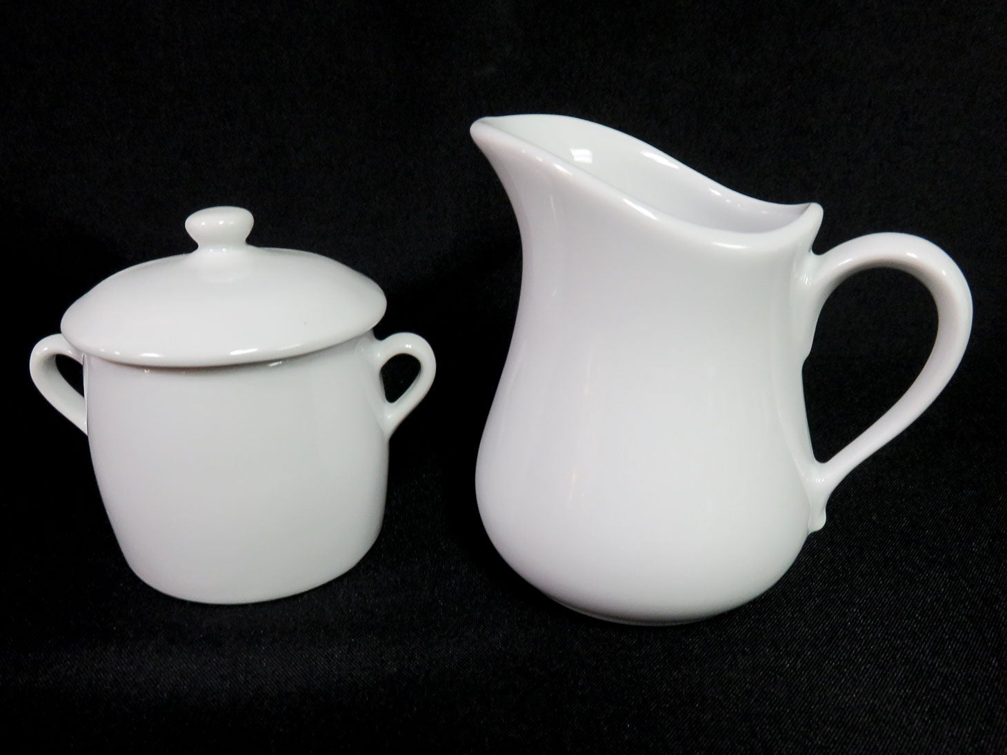 Classic white, sugar has lid and two handles, jug shaped creamer, 3 pc