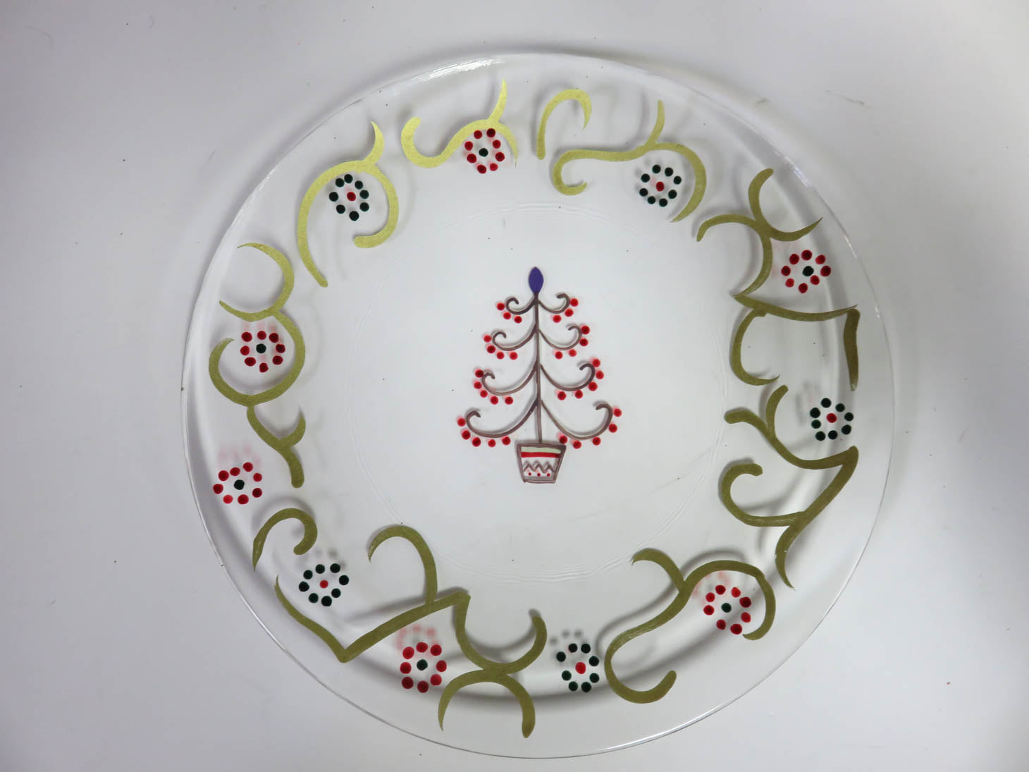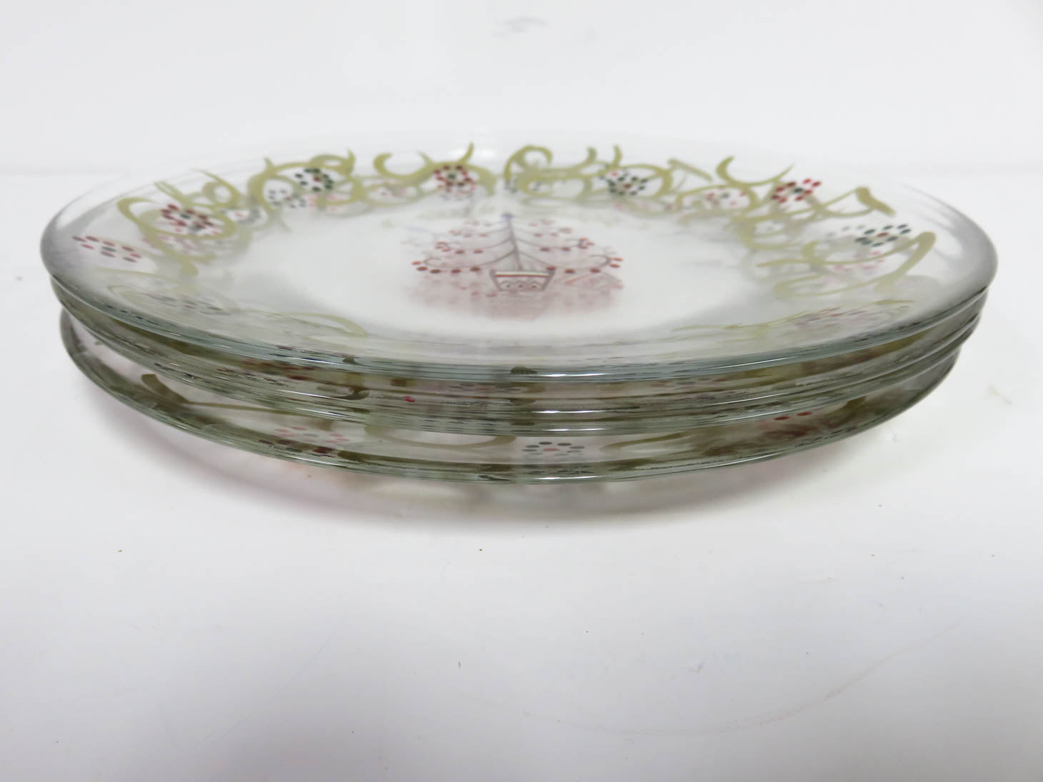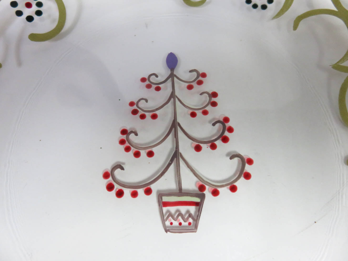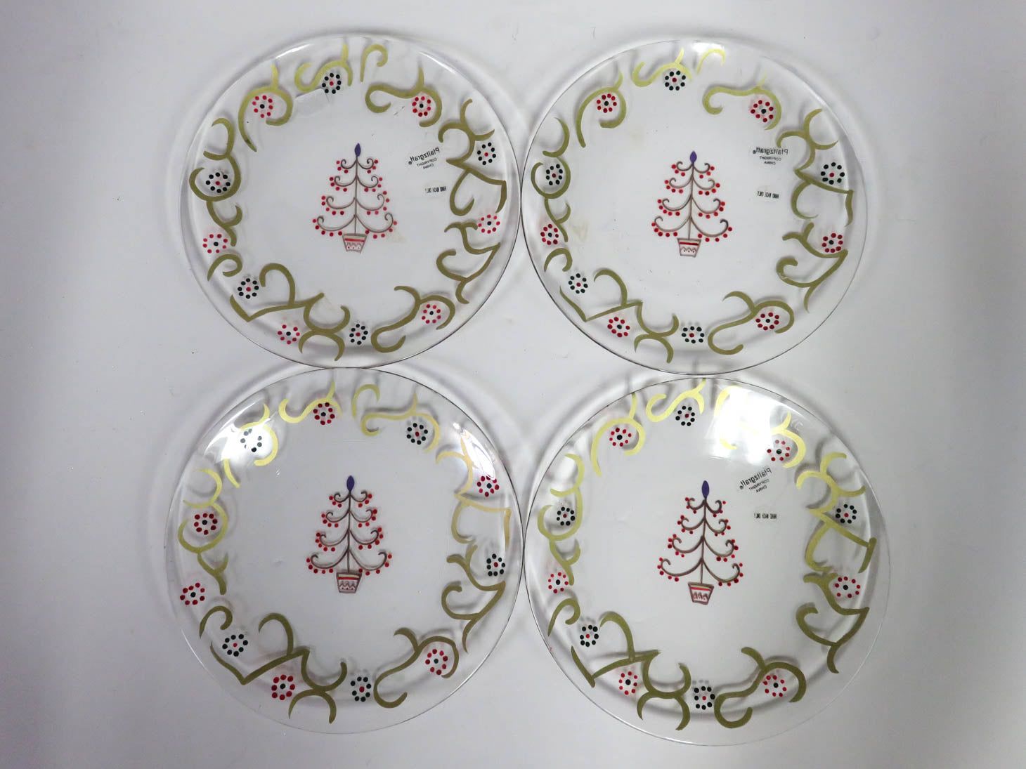 Set of 4, enameled gold swirls with potted Christmas tree in center.