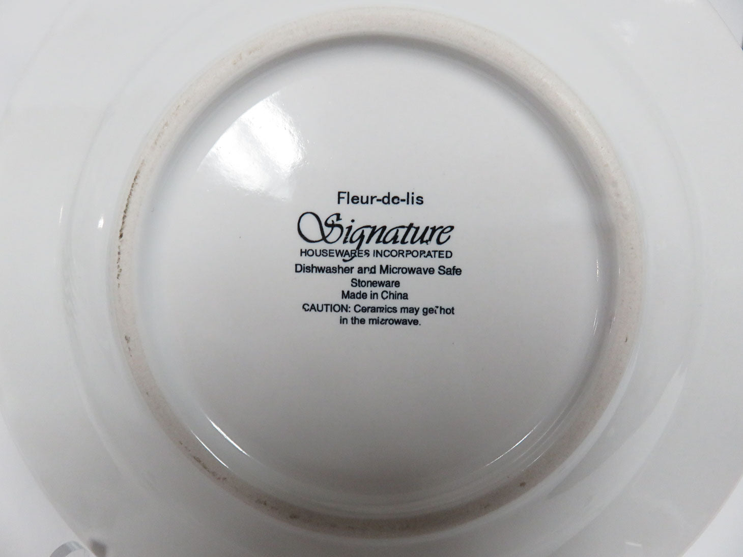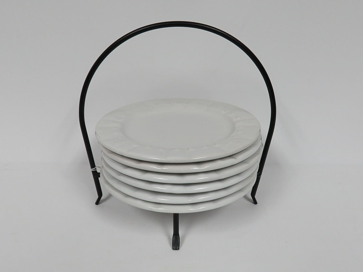 Set of 6, White with fleur de-lis and embossed dot pattern, on metal stand. (7 pcs) 6.25"d plates