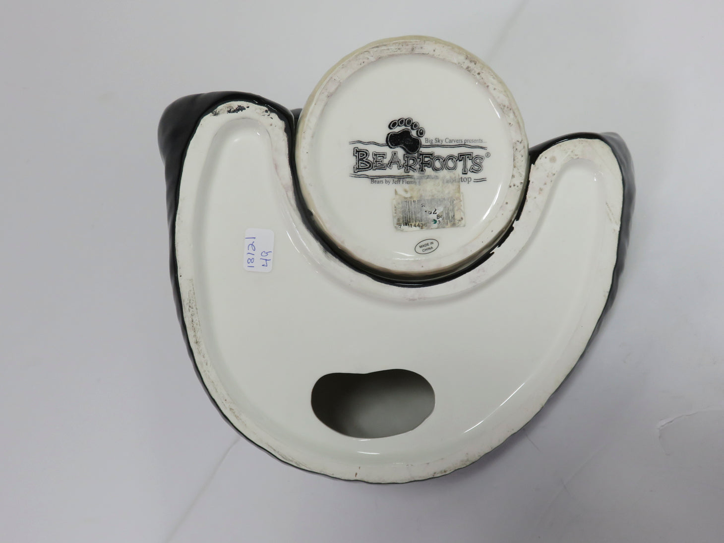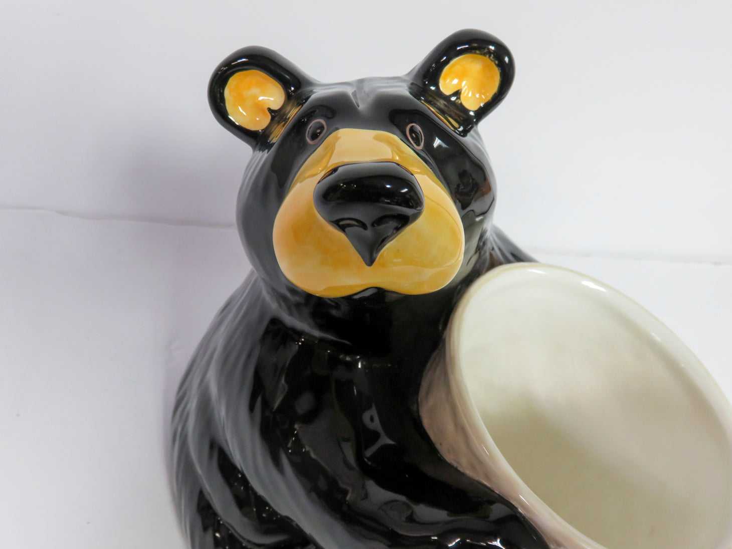 Black bear holding beige cylindrical holder