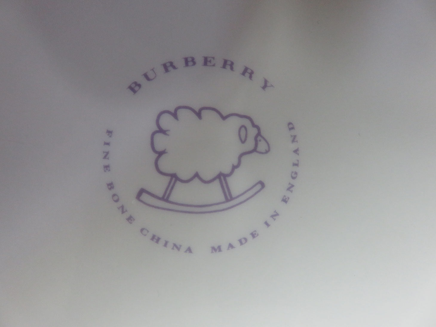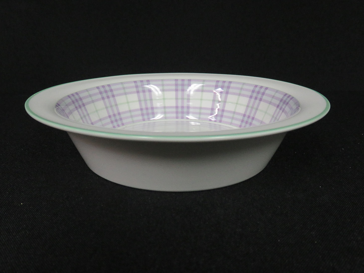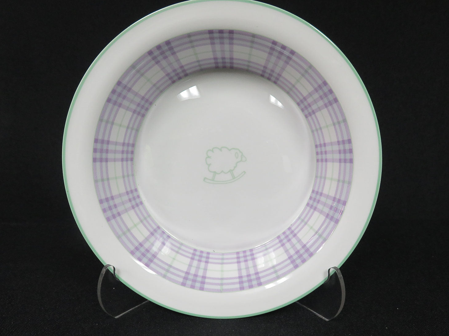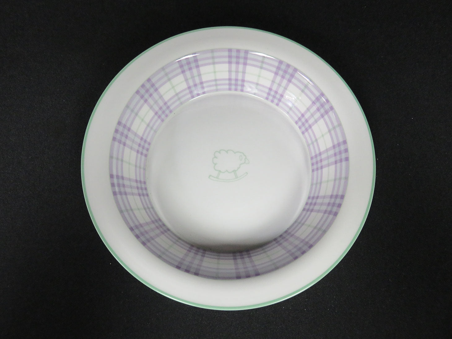 Item Number: 26509-57 Child's bowl, white with purple and green plaid accents, green trim, with green sheep on interior 7" x 1.5"