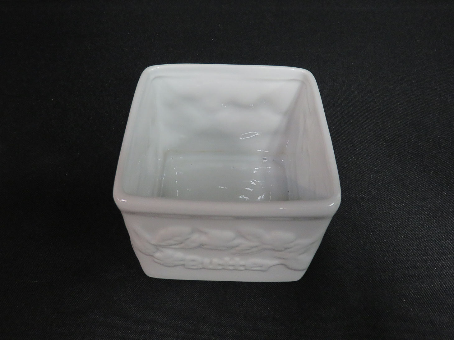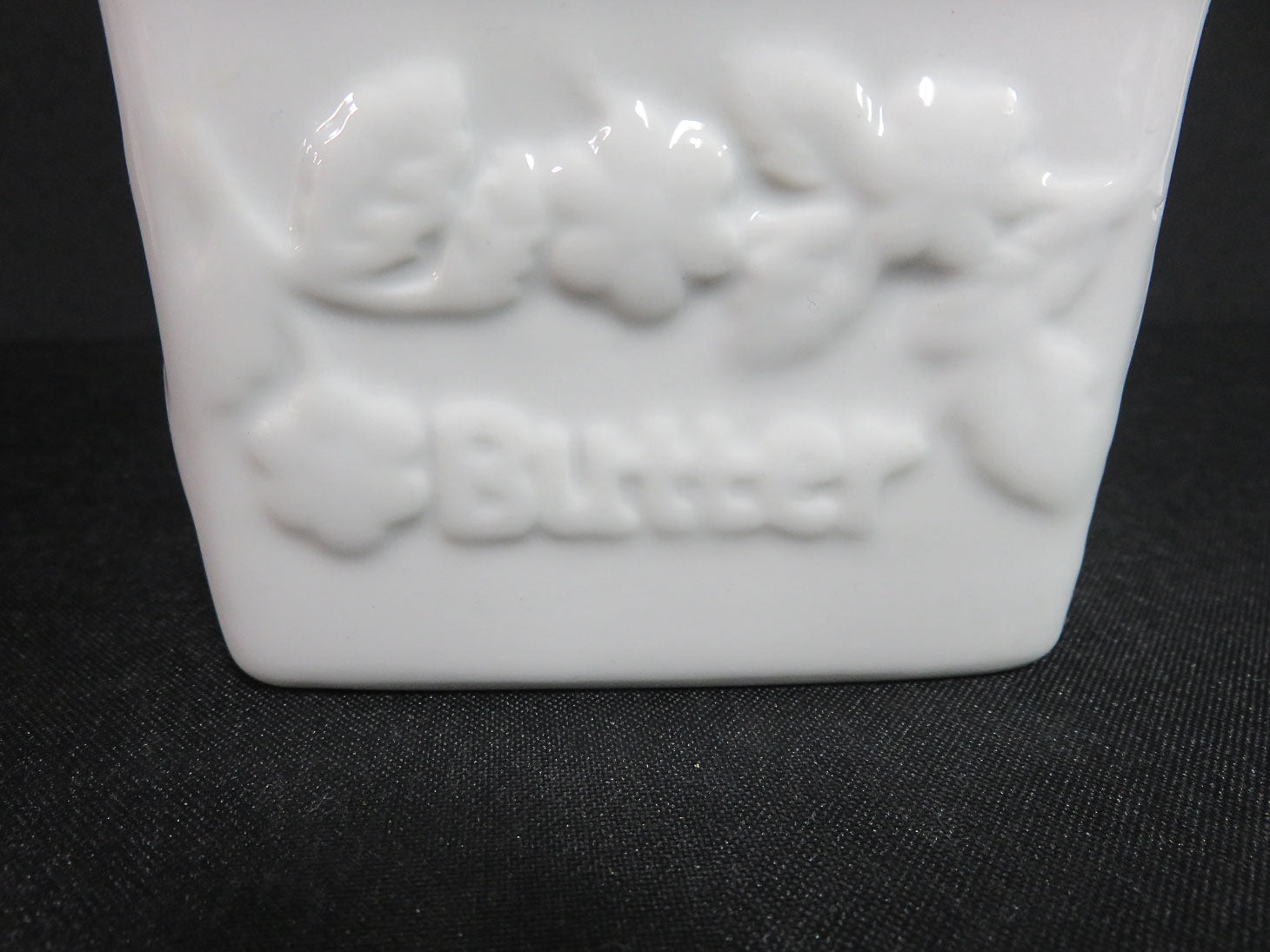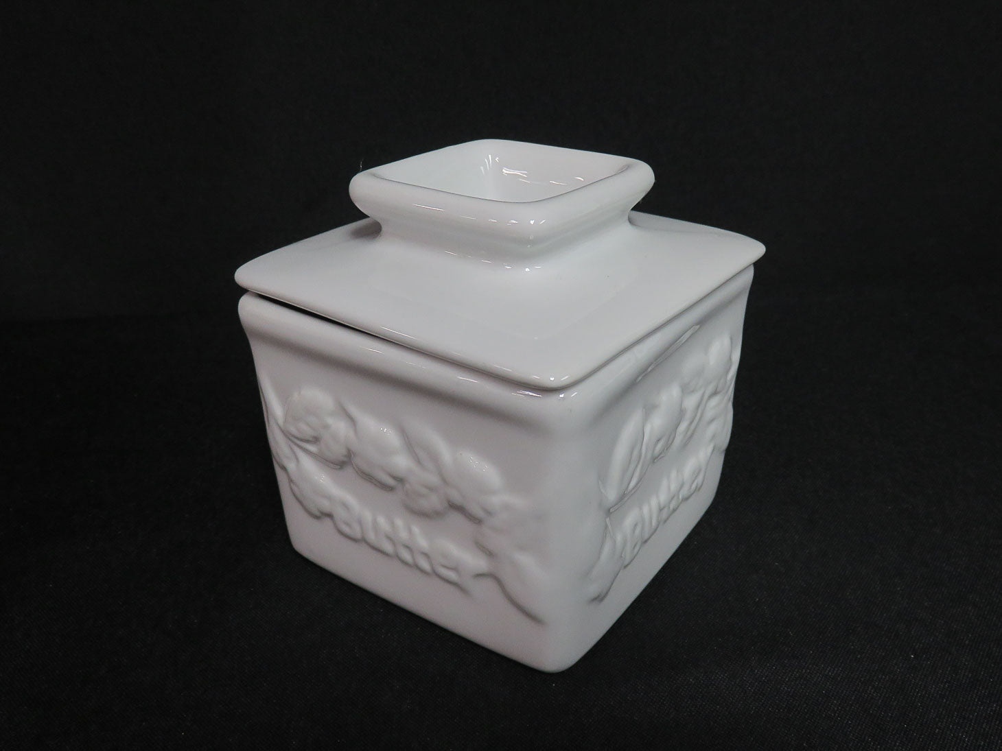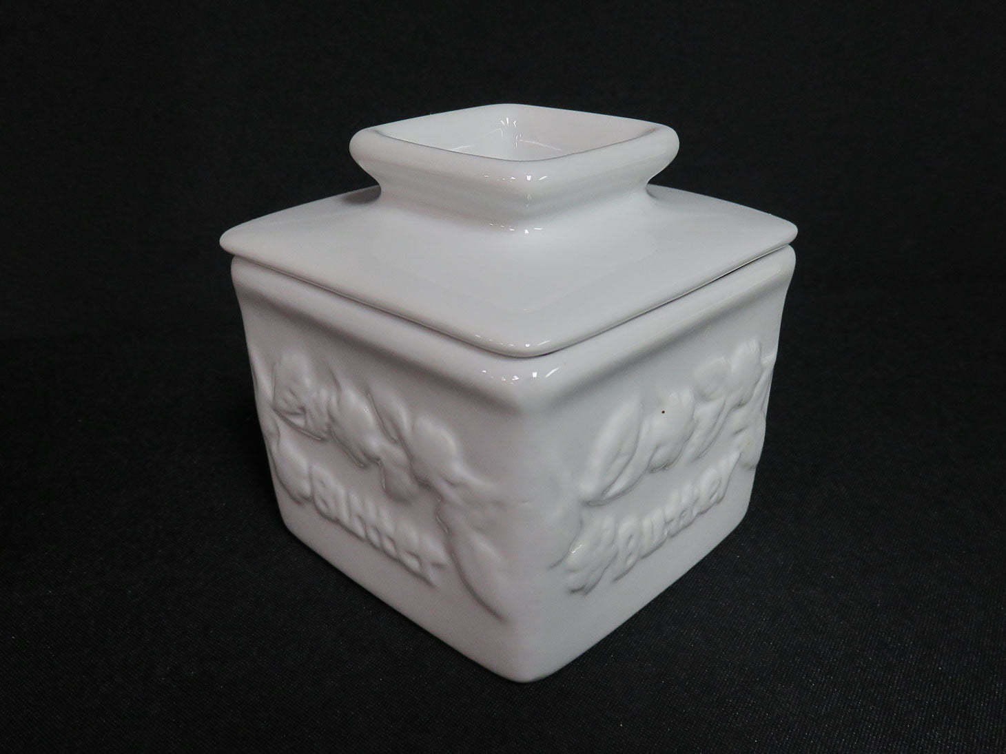 Vintage, white square with raised "Butter" and floral design, 2 pc