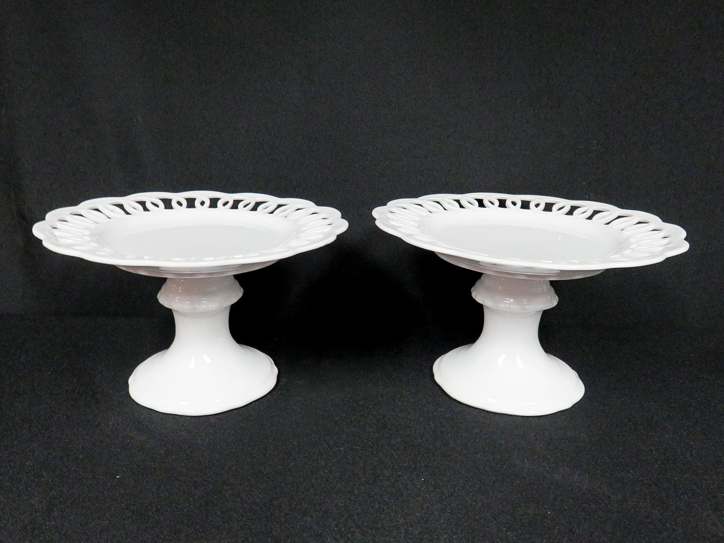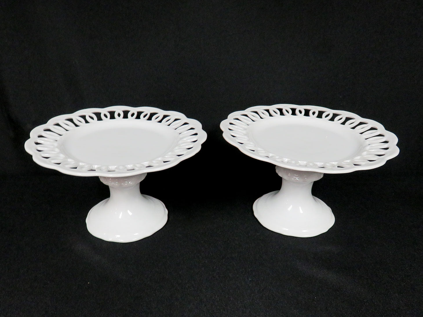 Set of two, white with round base. Has a reticulated, scalloped edge.