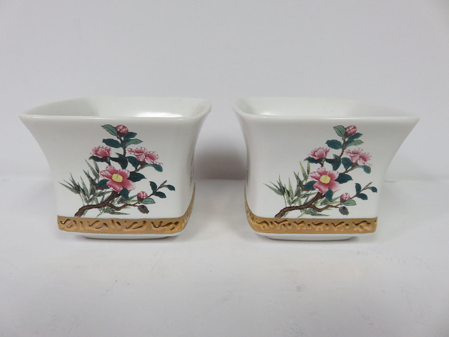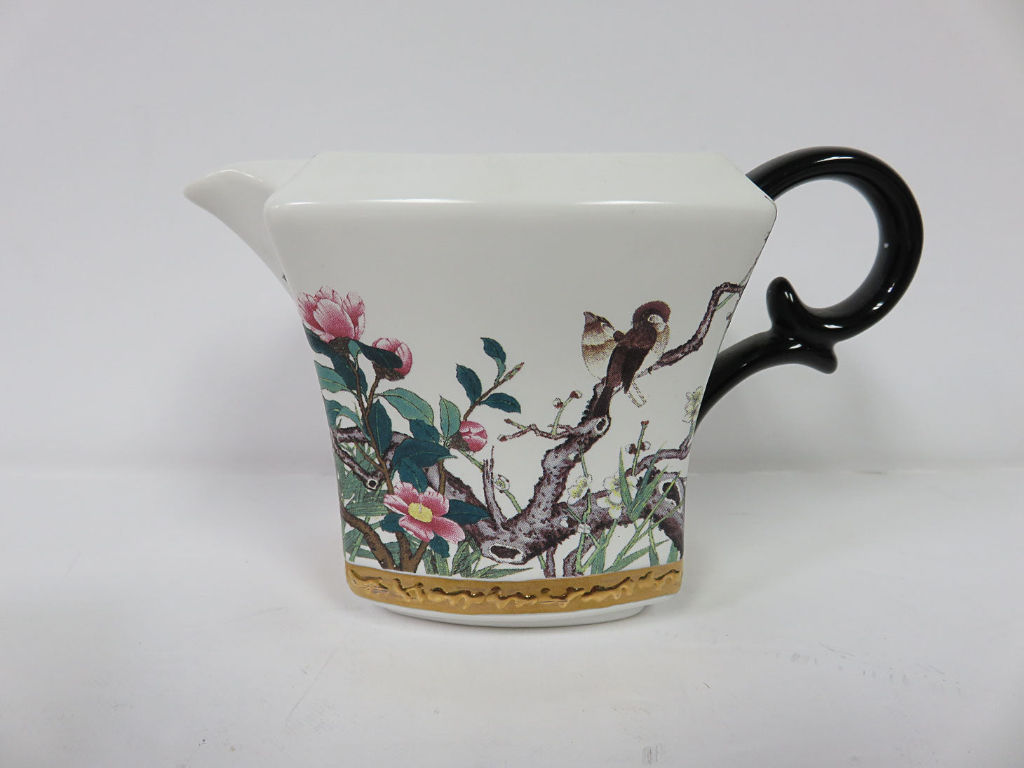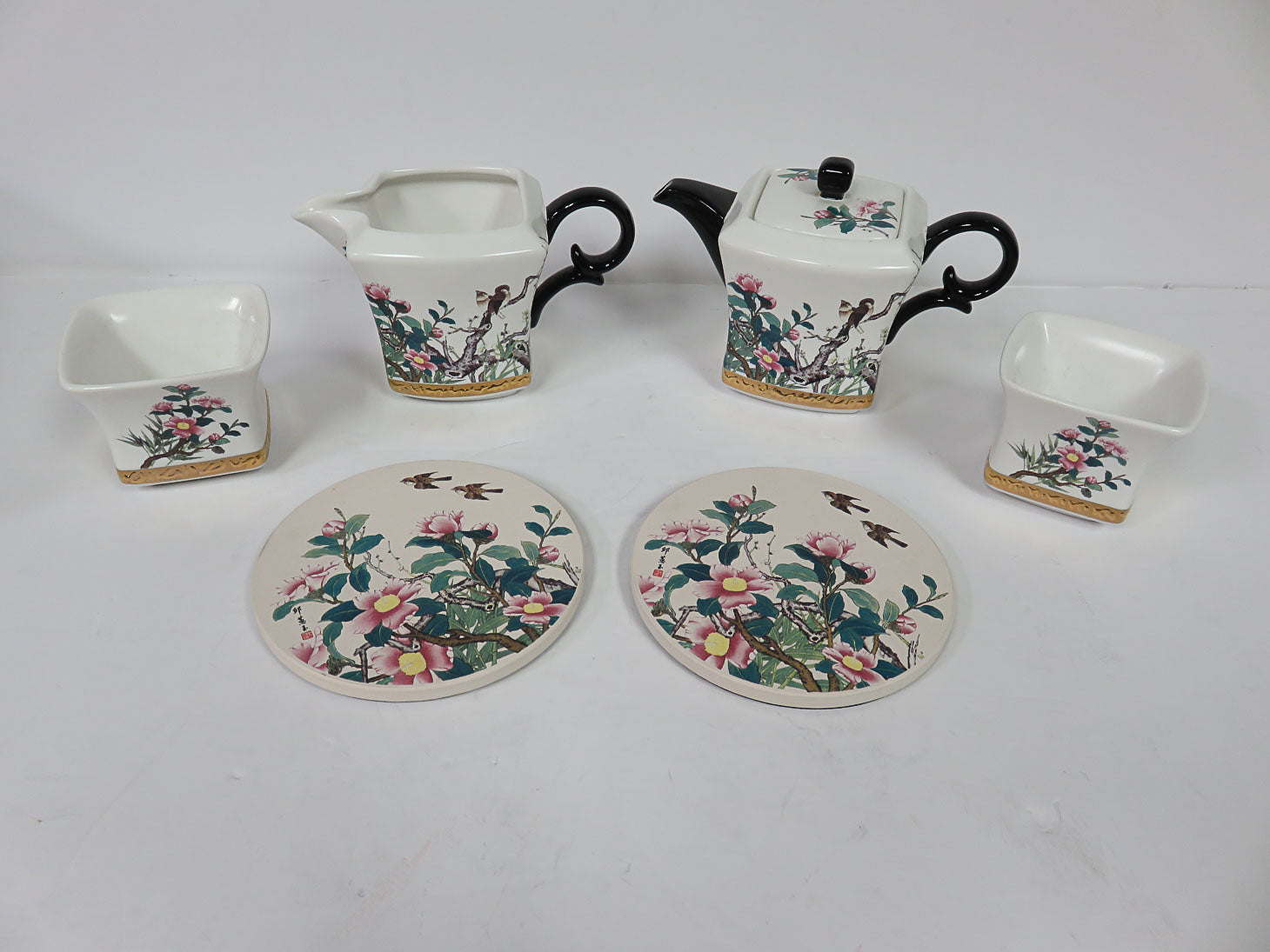 Item Number: 25696-14 Seven piece tea set, "Spring Blooming Camelia" pattern, cream with floral design and gold trim, in presentation box. 6" x 4 " Teapot