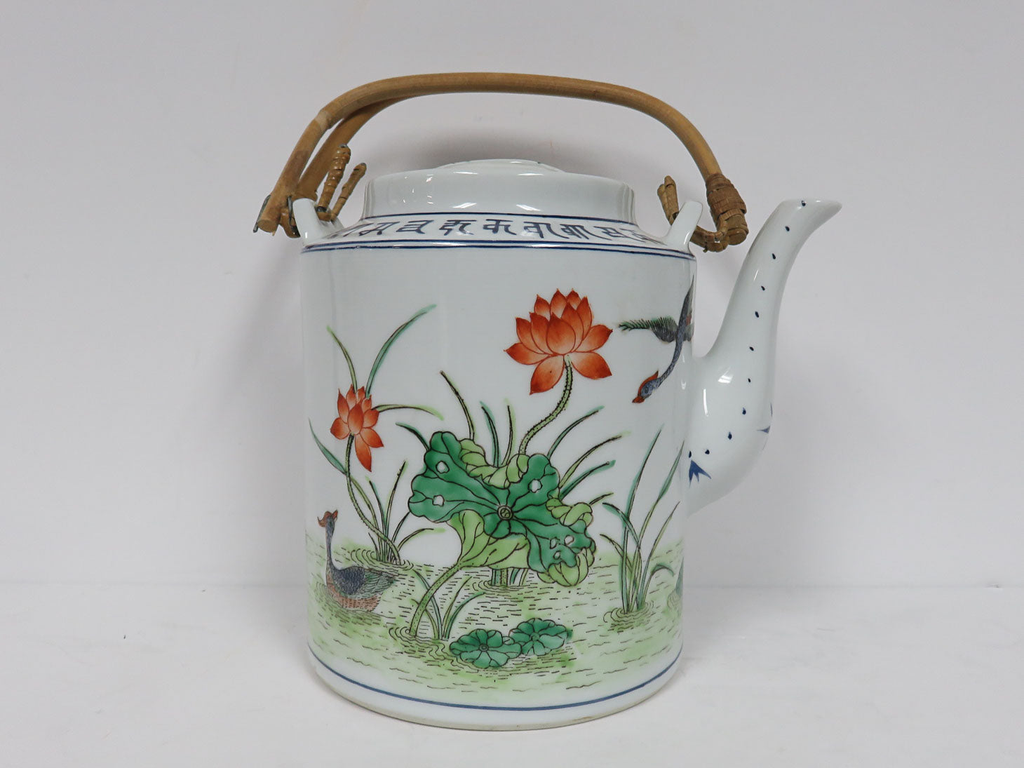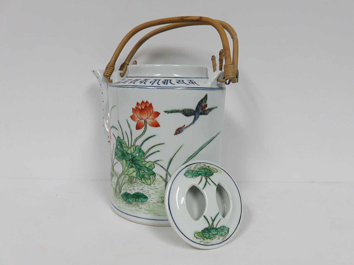 White with floral and bird design, Tibet lettering, bamboo handle, 2 pc 8.5" H