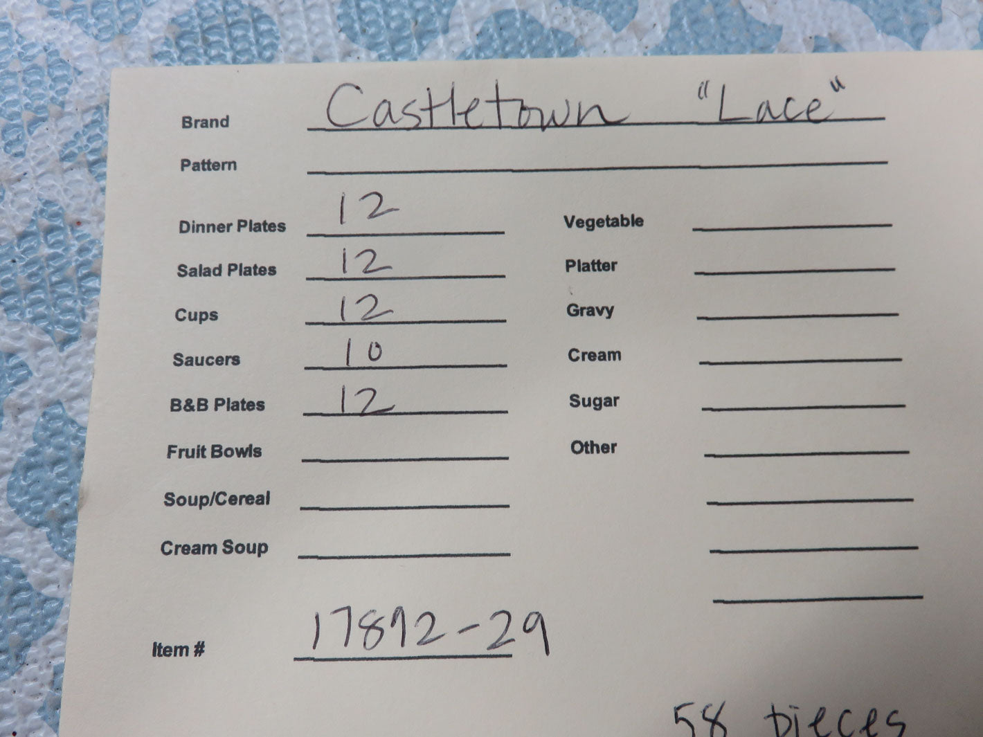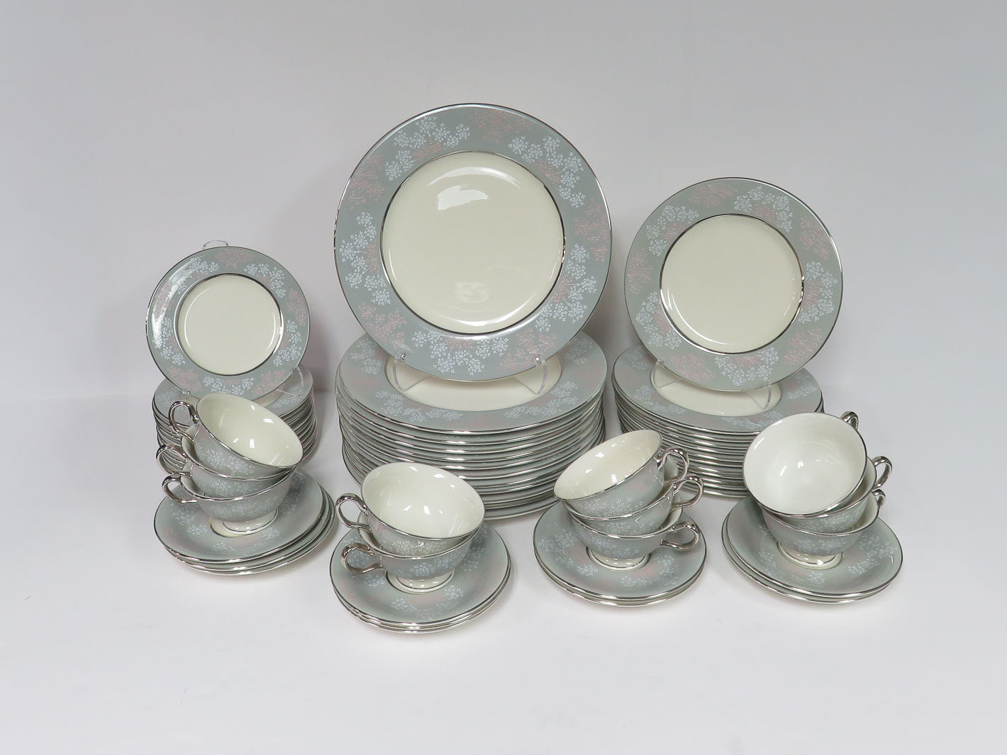 12 5pc, place settings (less 2 saucers and 1 cup) "Lace" pattern, pink and white Queen Anne's lace on gray border with silver rim