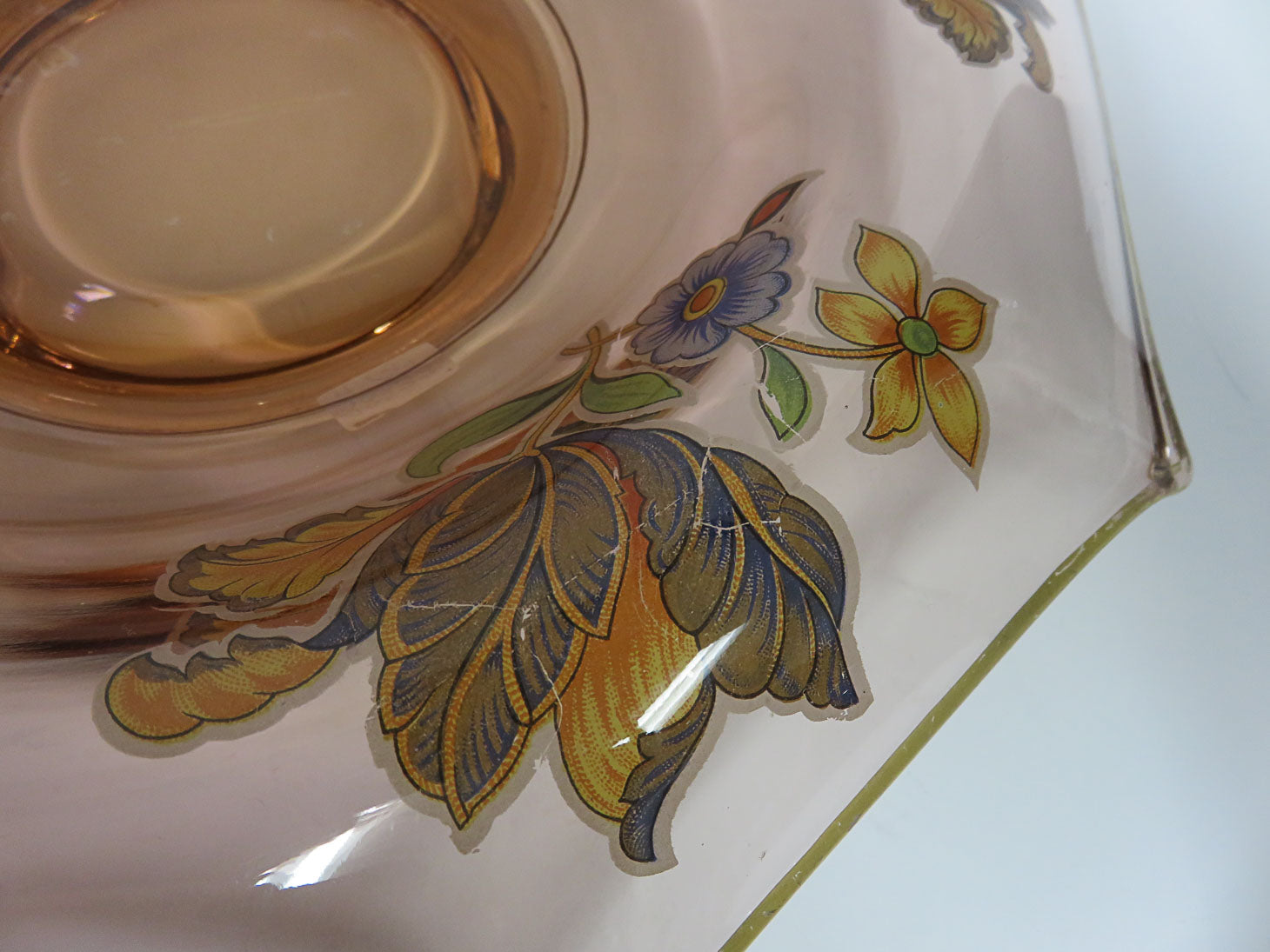 Pink depression glass, flowers on rolled edge bowl and candlesticks, 3 pcs