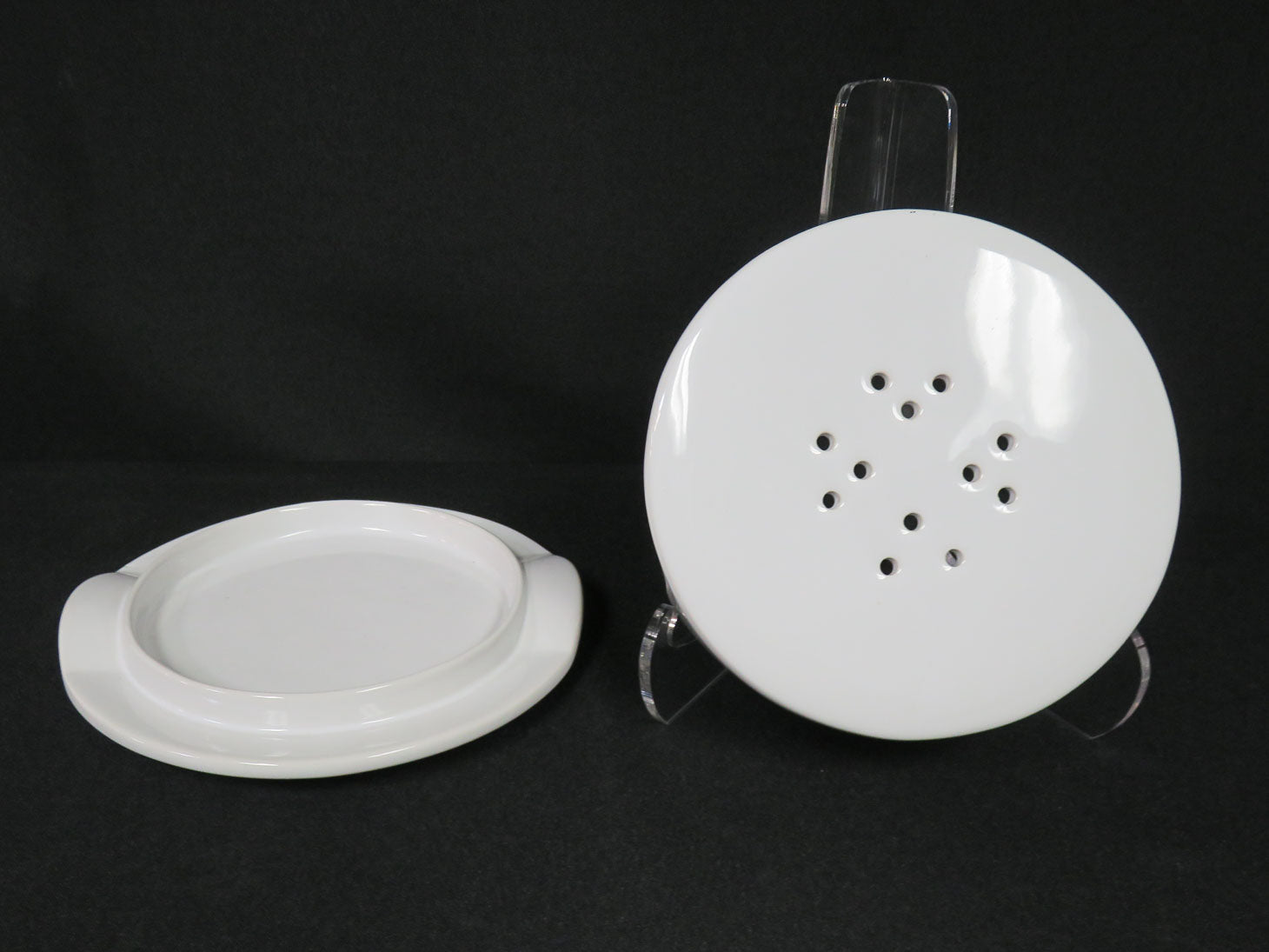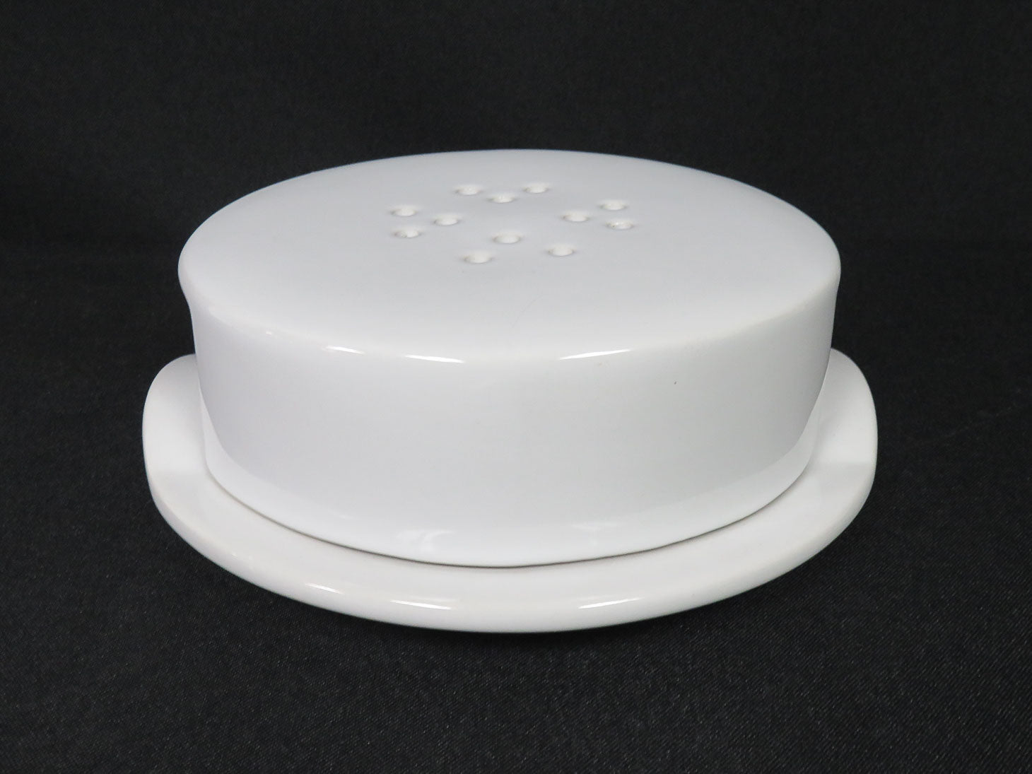 White, round with 2 handles and holes on the lid