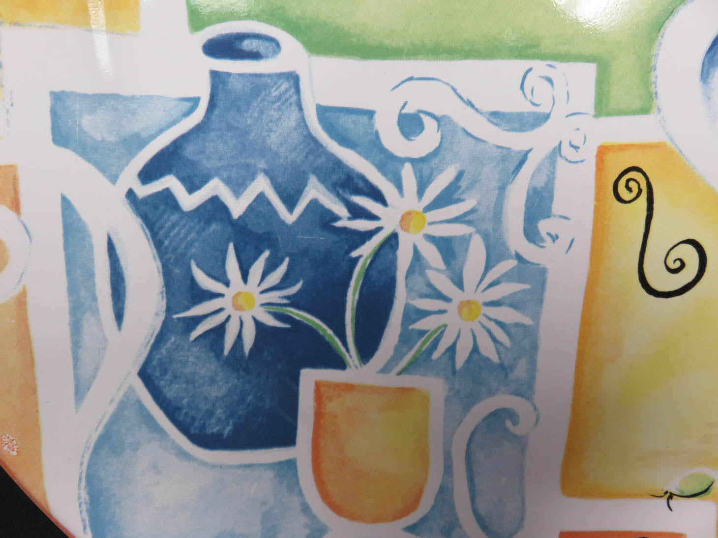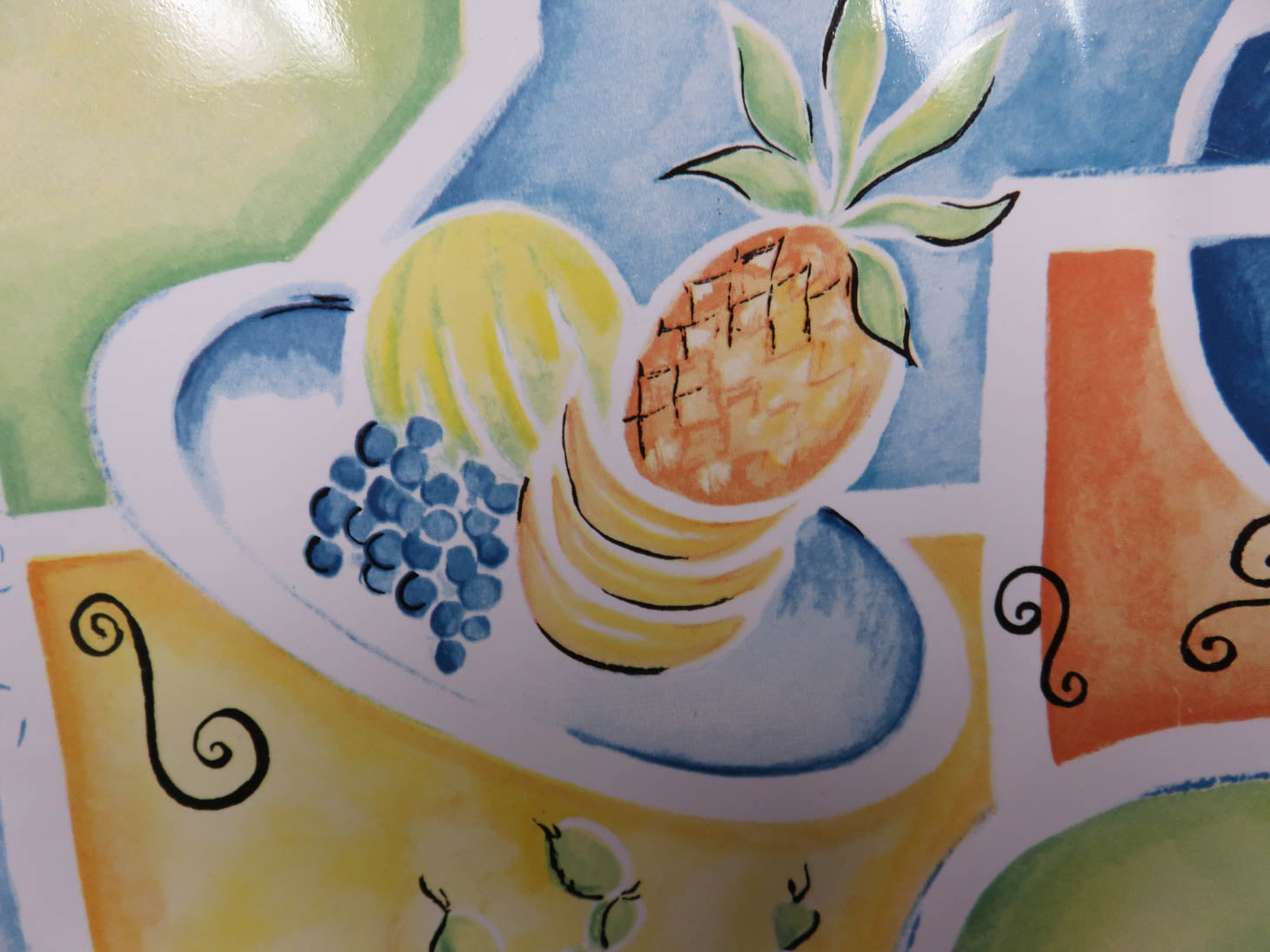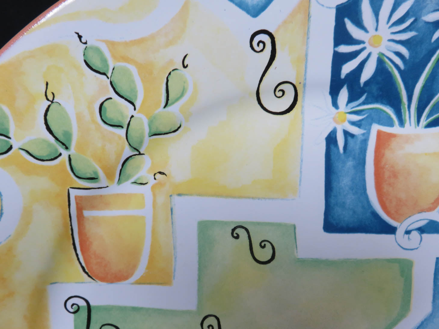 Round with yellow, green, blue muted fruits, plants, terra cotta rim.