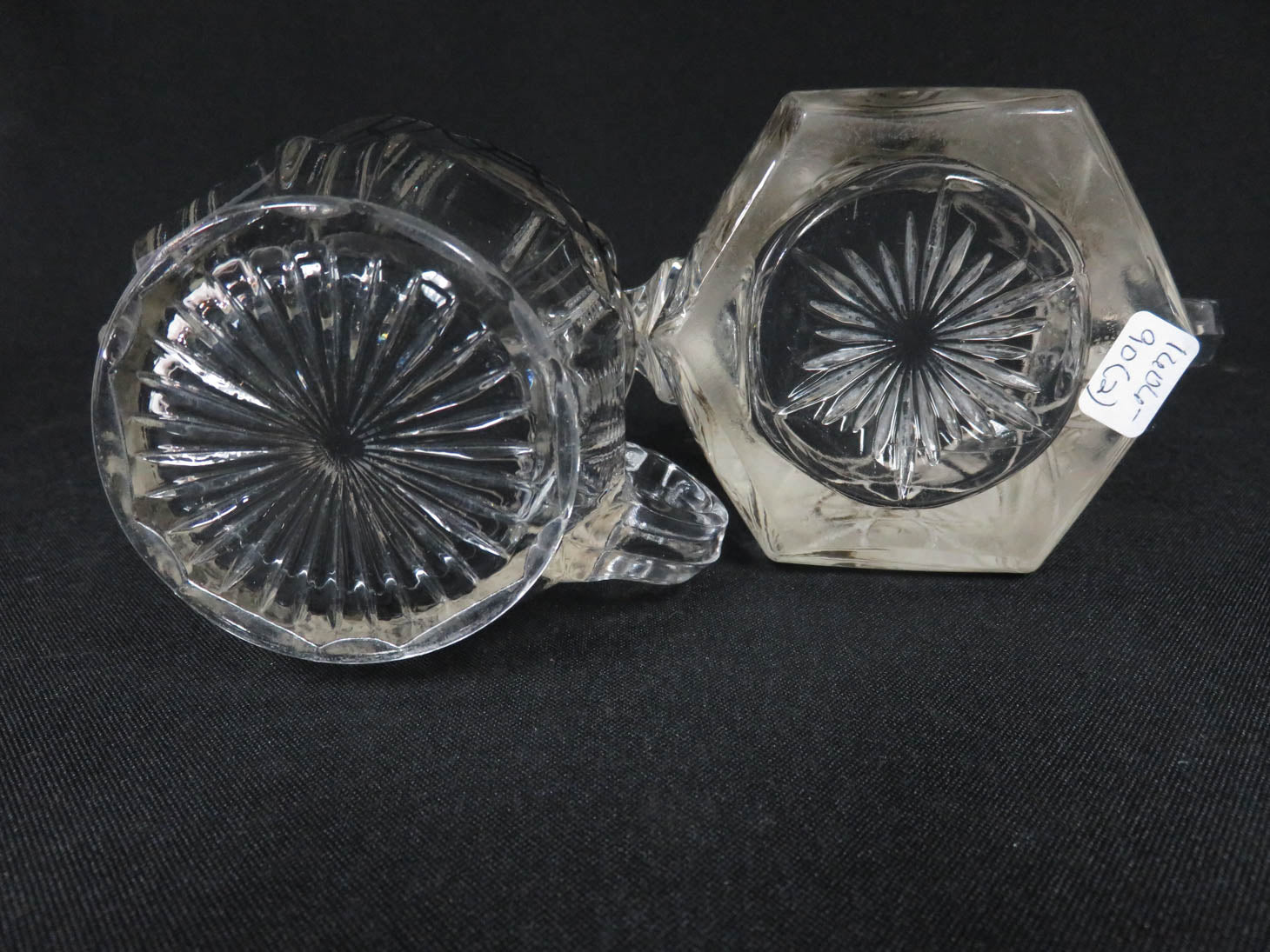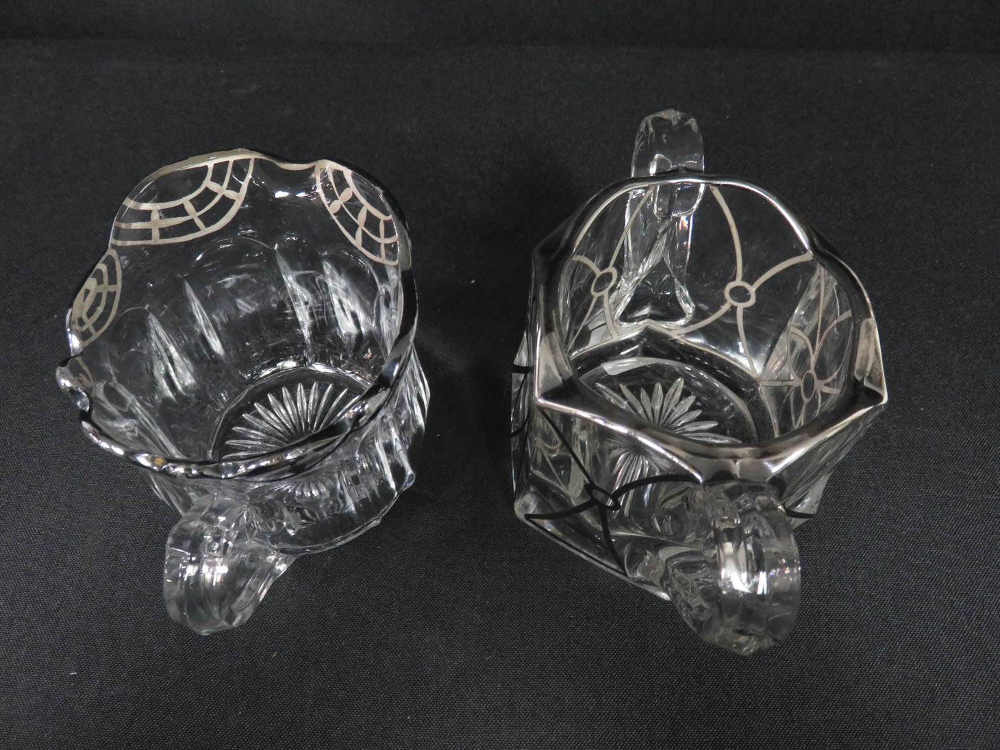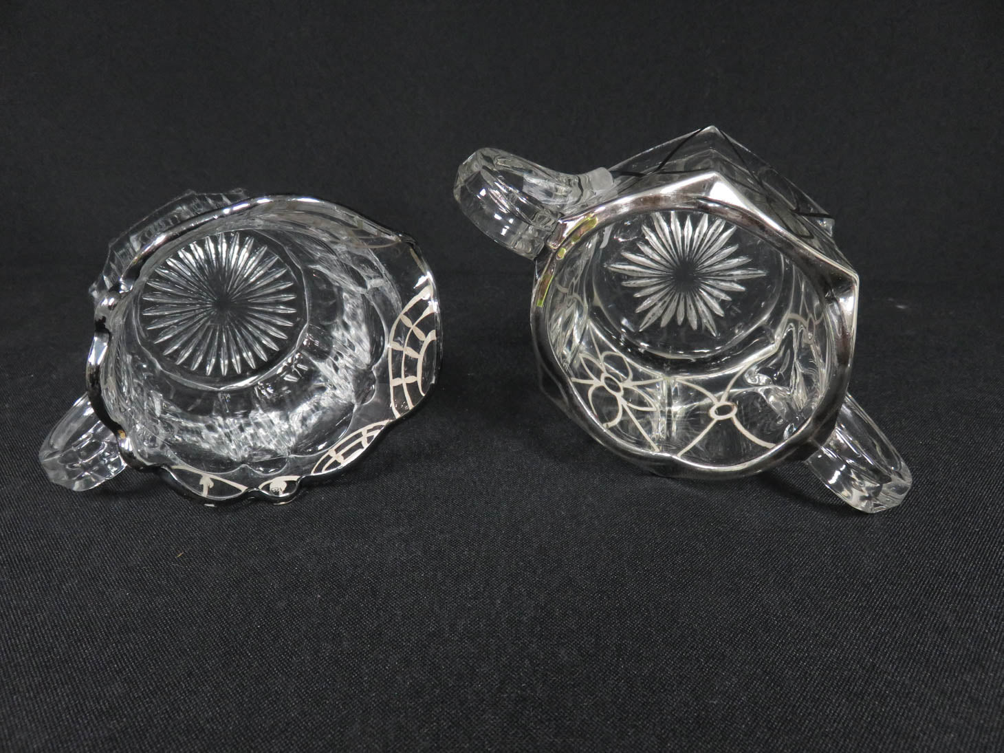 Pressed glass with silver trim, double handle sugar, scalloped edges