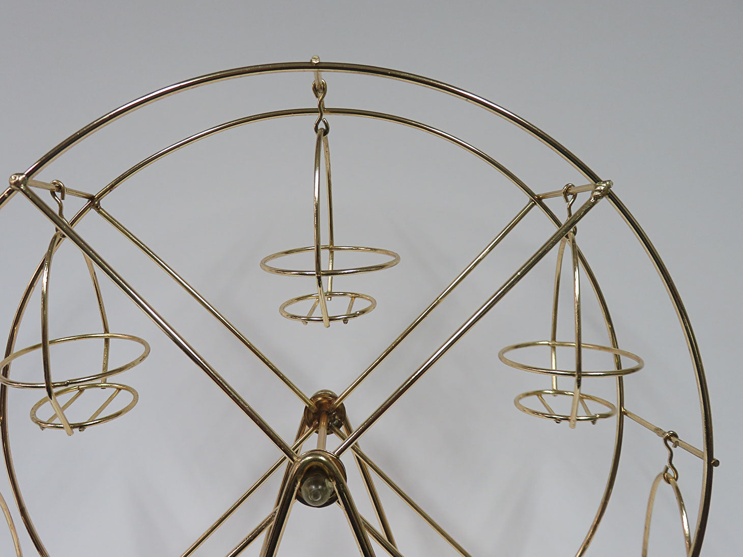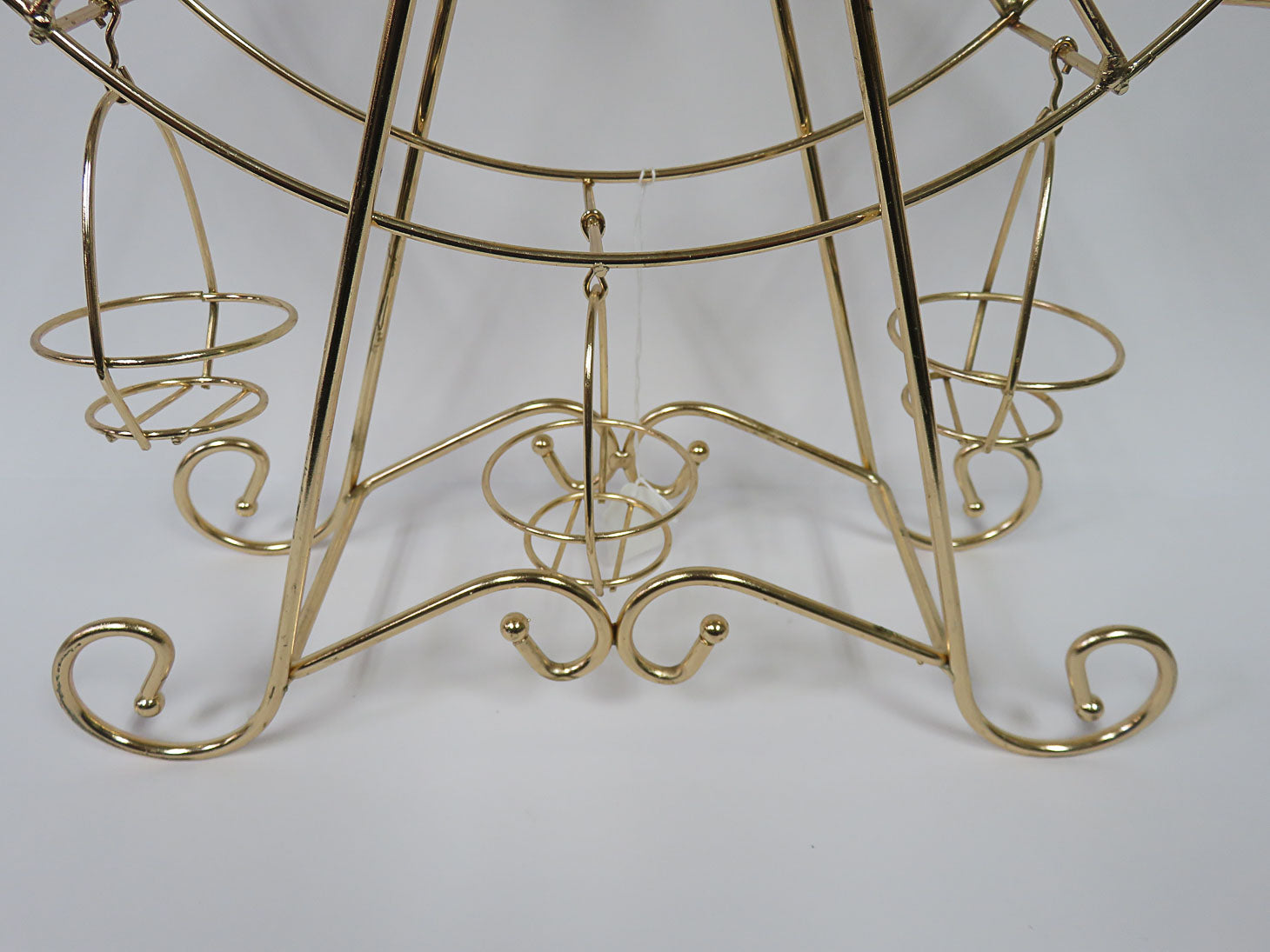 Gold tone metal, spins. Holds 8 mini cupcakes.