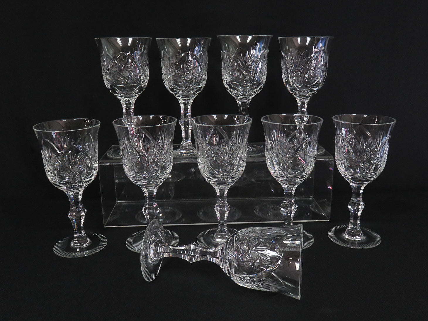 Set of 10, clear with pinwheel and ferns, wedge cuts on rim of base