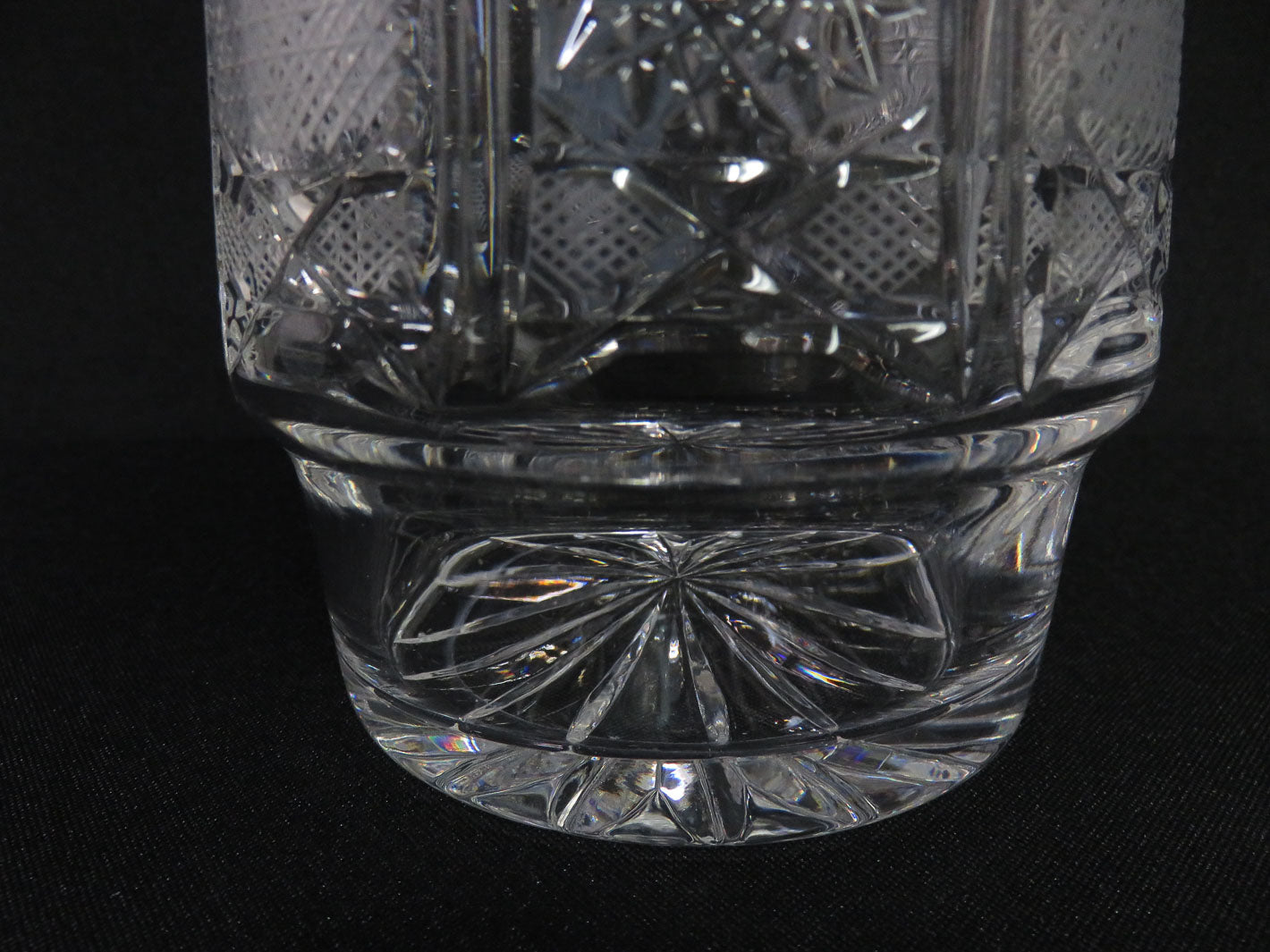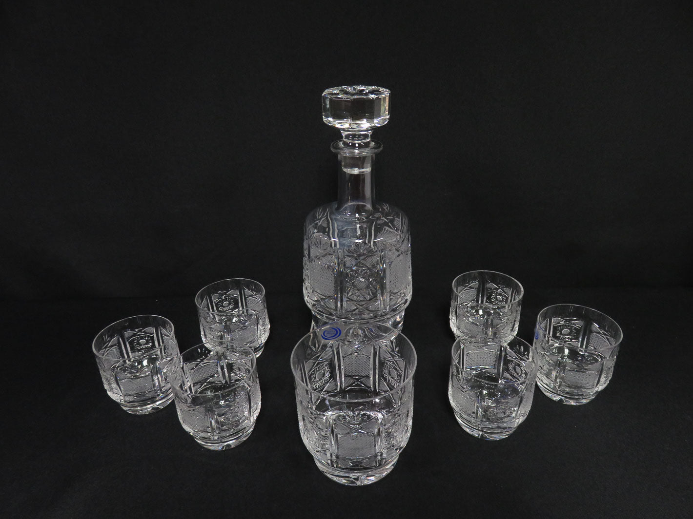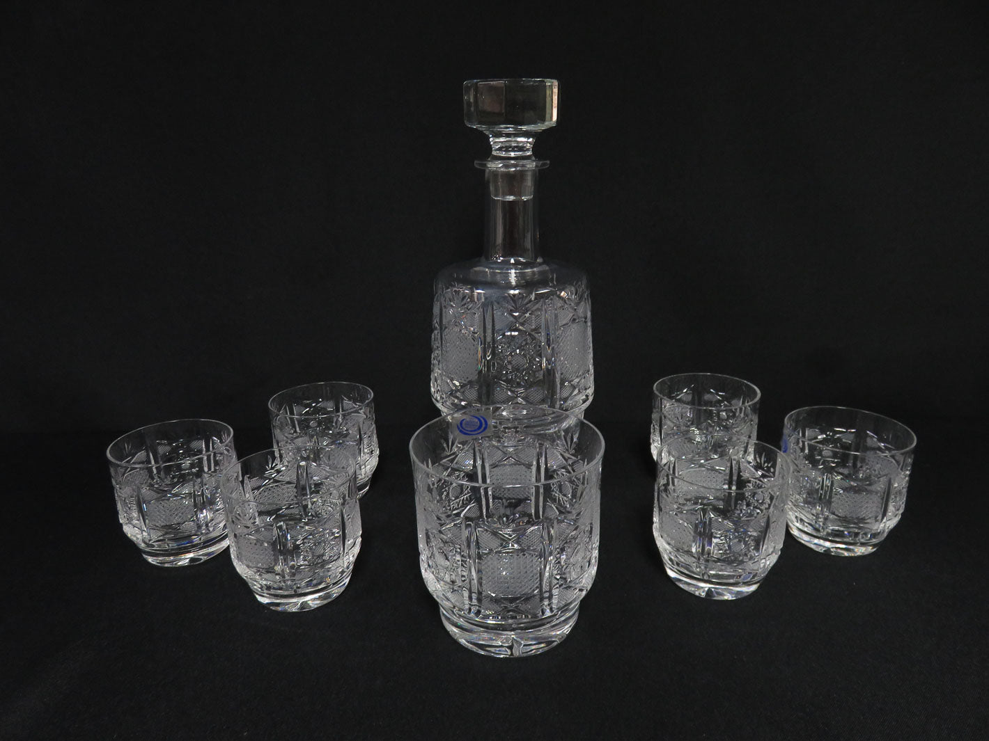 Decanter with stopper, ice bucket and 6 glasses. Cut glass with frosted details. 9pcs