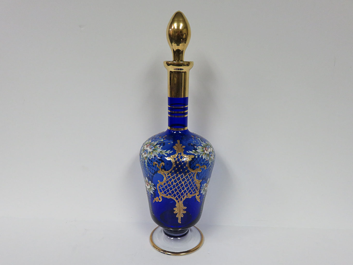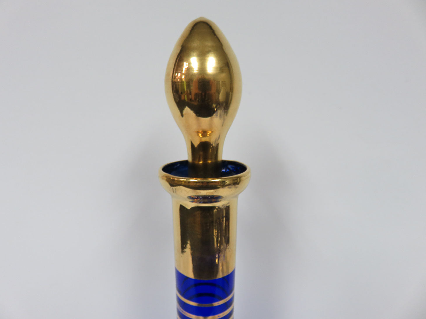 Item Number: 16204-89 Decanter and 6 glasses. Cobalt blue with heavy gilt usage and floral design. 14" H Decanter, 4.25" glasses