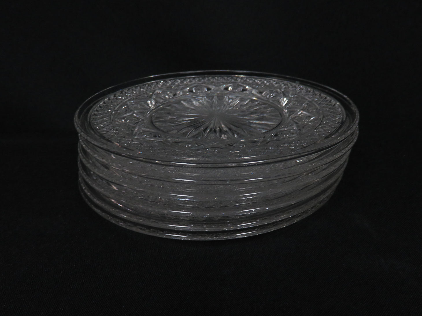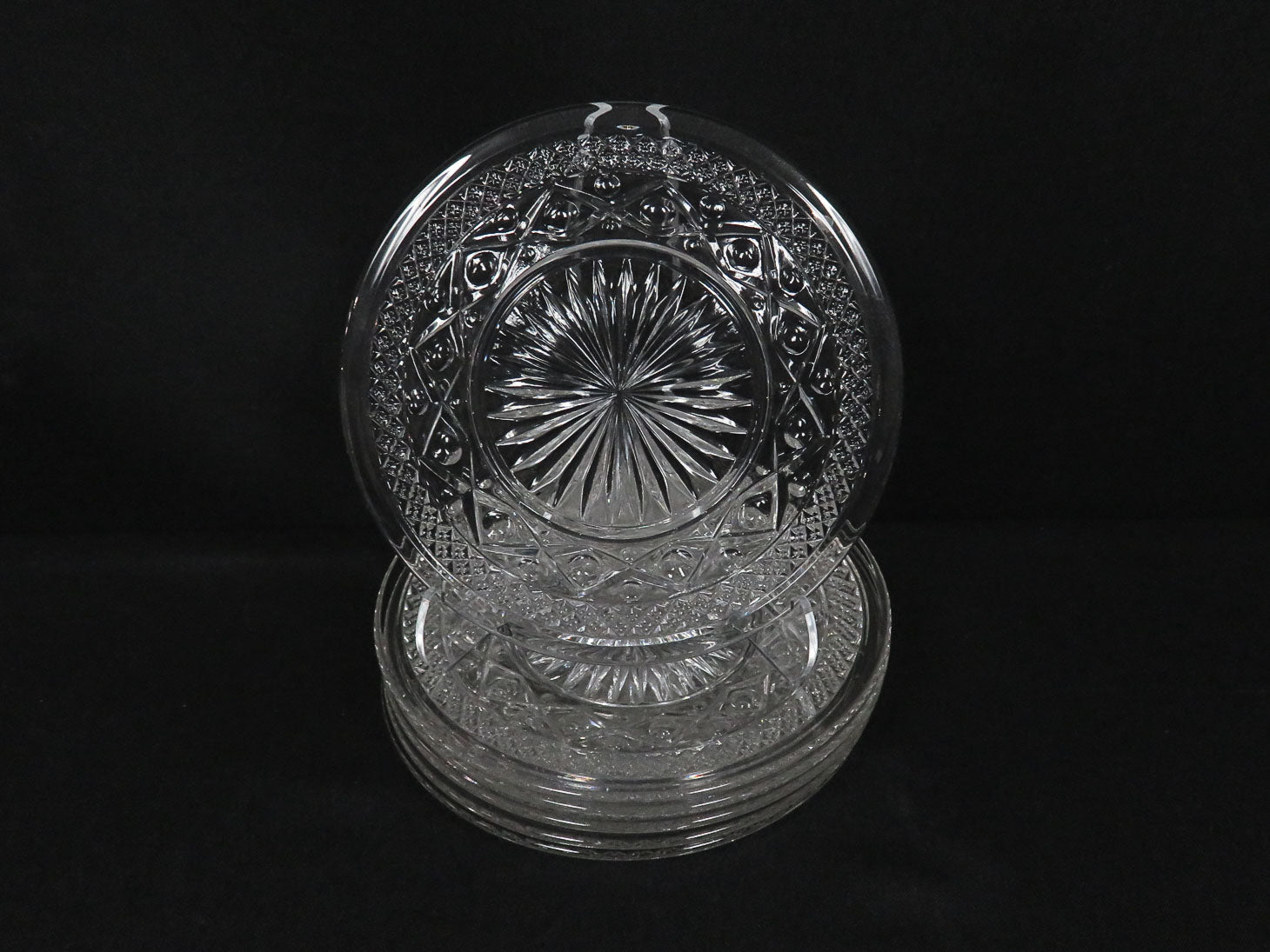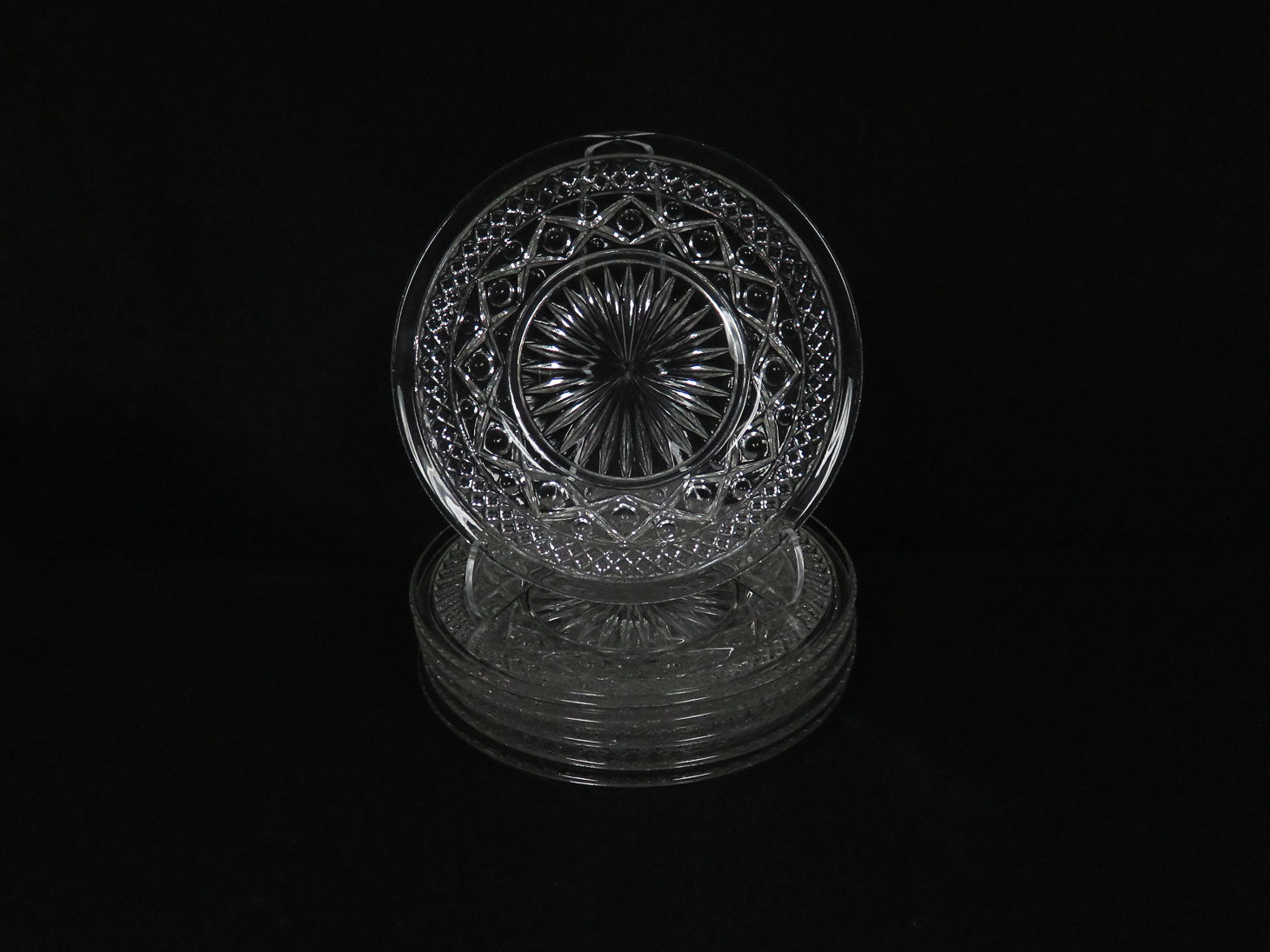 Set of 6, clear with starburst in center, diamond cut design on rim.