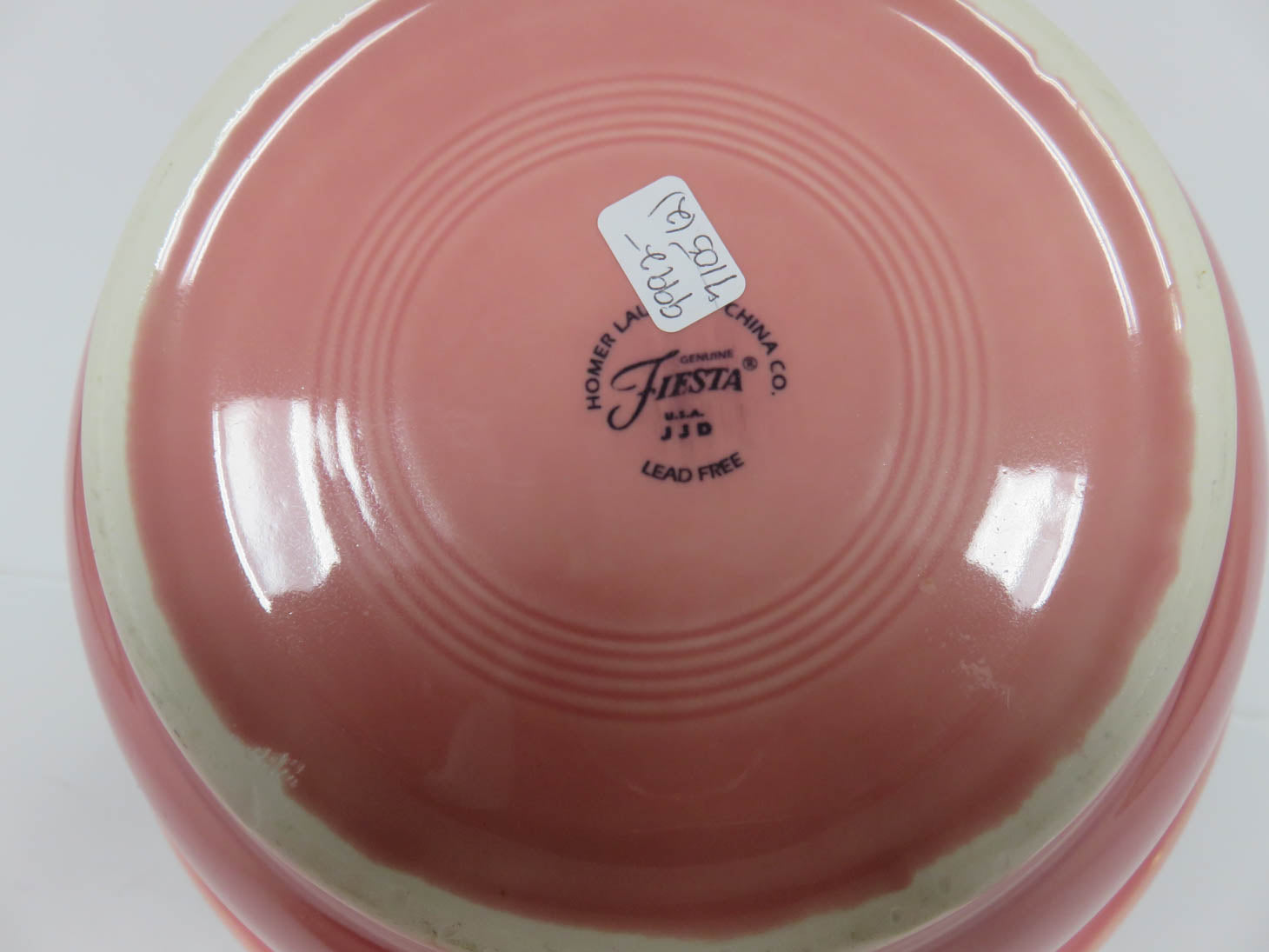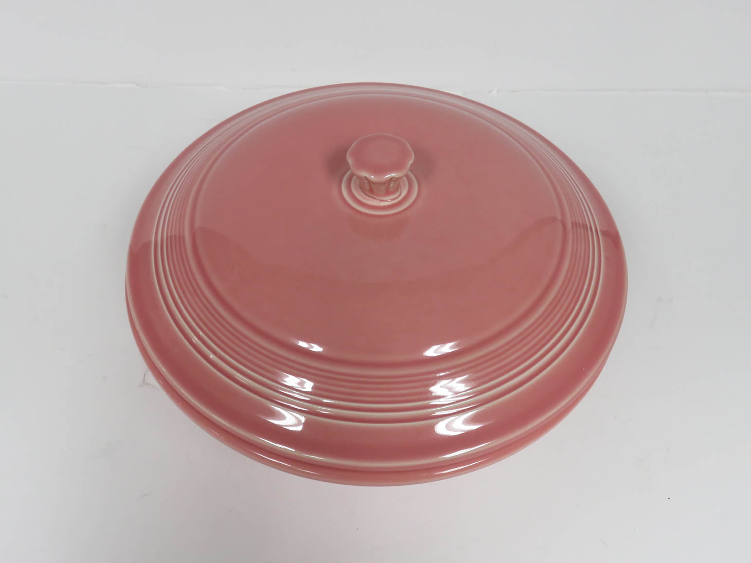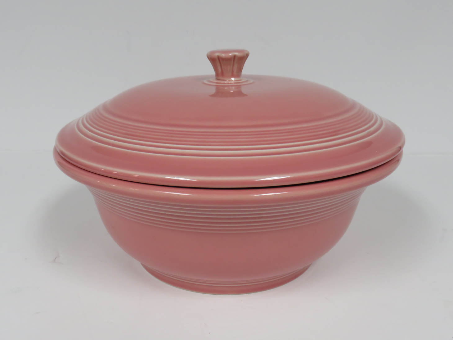 Rose pink, fluted top, knob on lid, concentric rings on bowl and lid