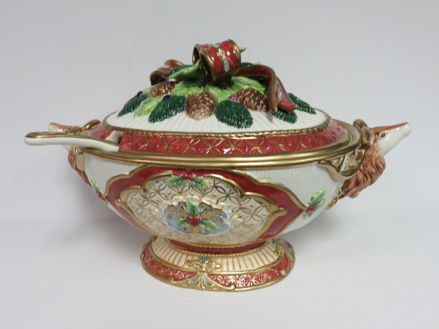 Florentine Christmas tureen, oval shape, gold, green and red, reindeer head handles, ribbon lid and ladle (3 pcs)