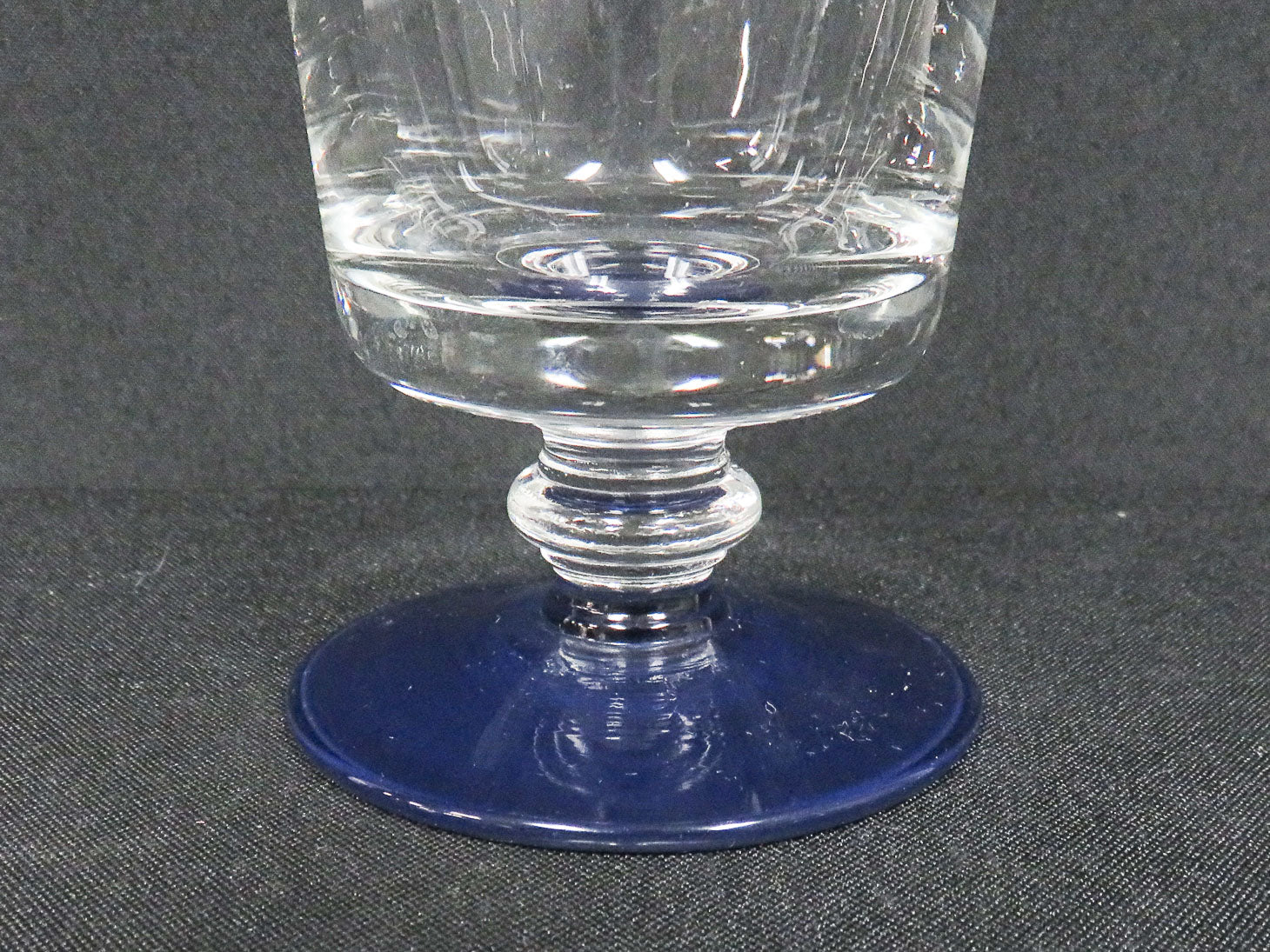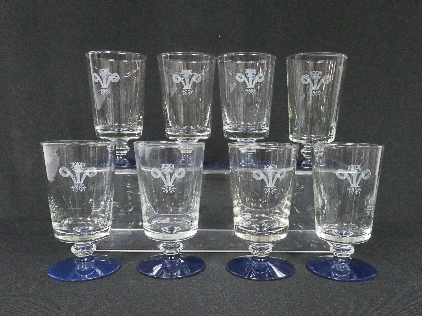 Set of 8, Clear with cobalt base and art deco etched design.