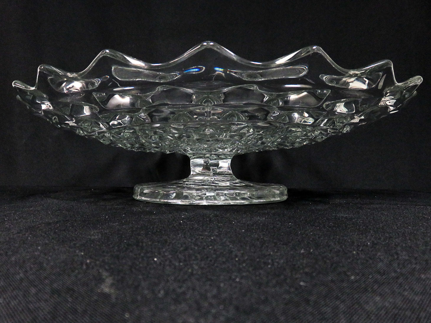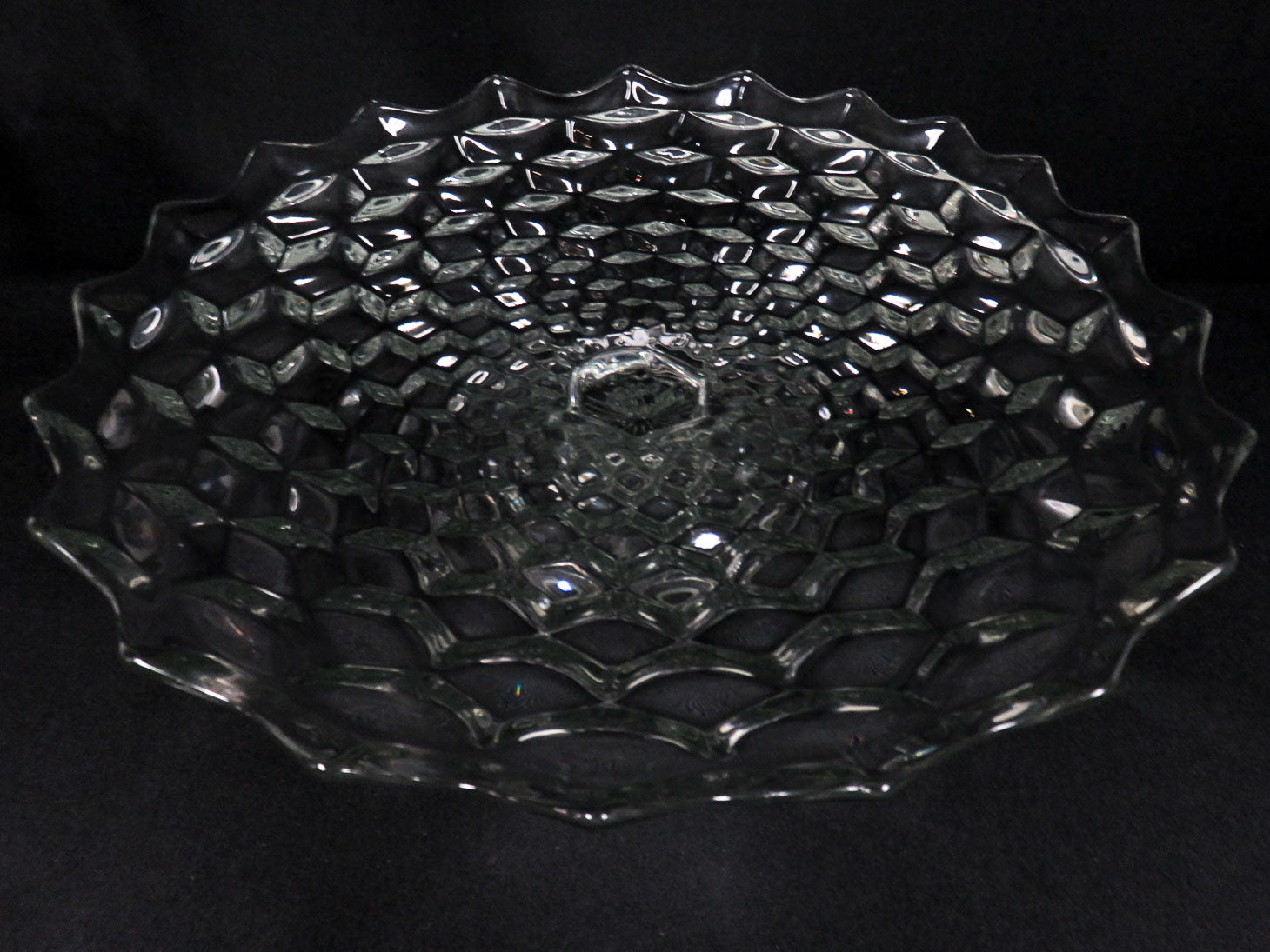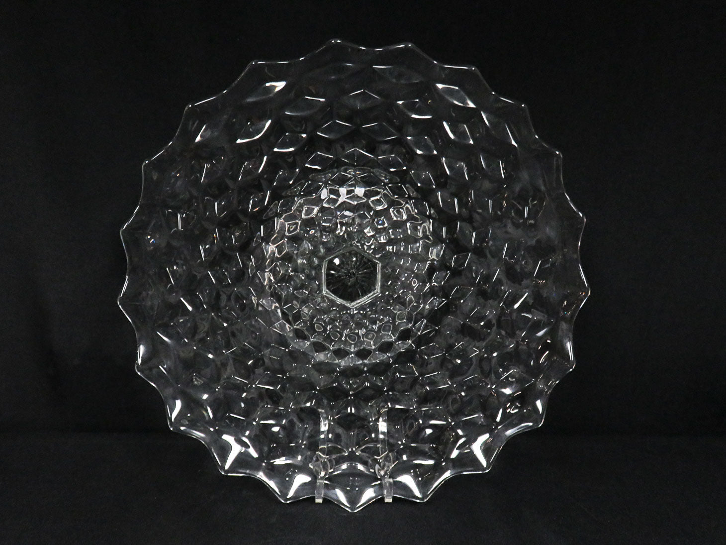 Round, clear on pedestal with block geometric design and scalloped edges