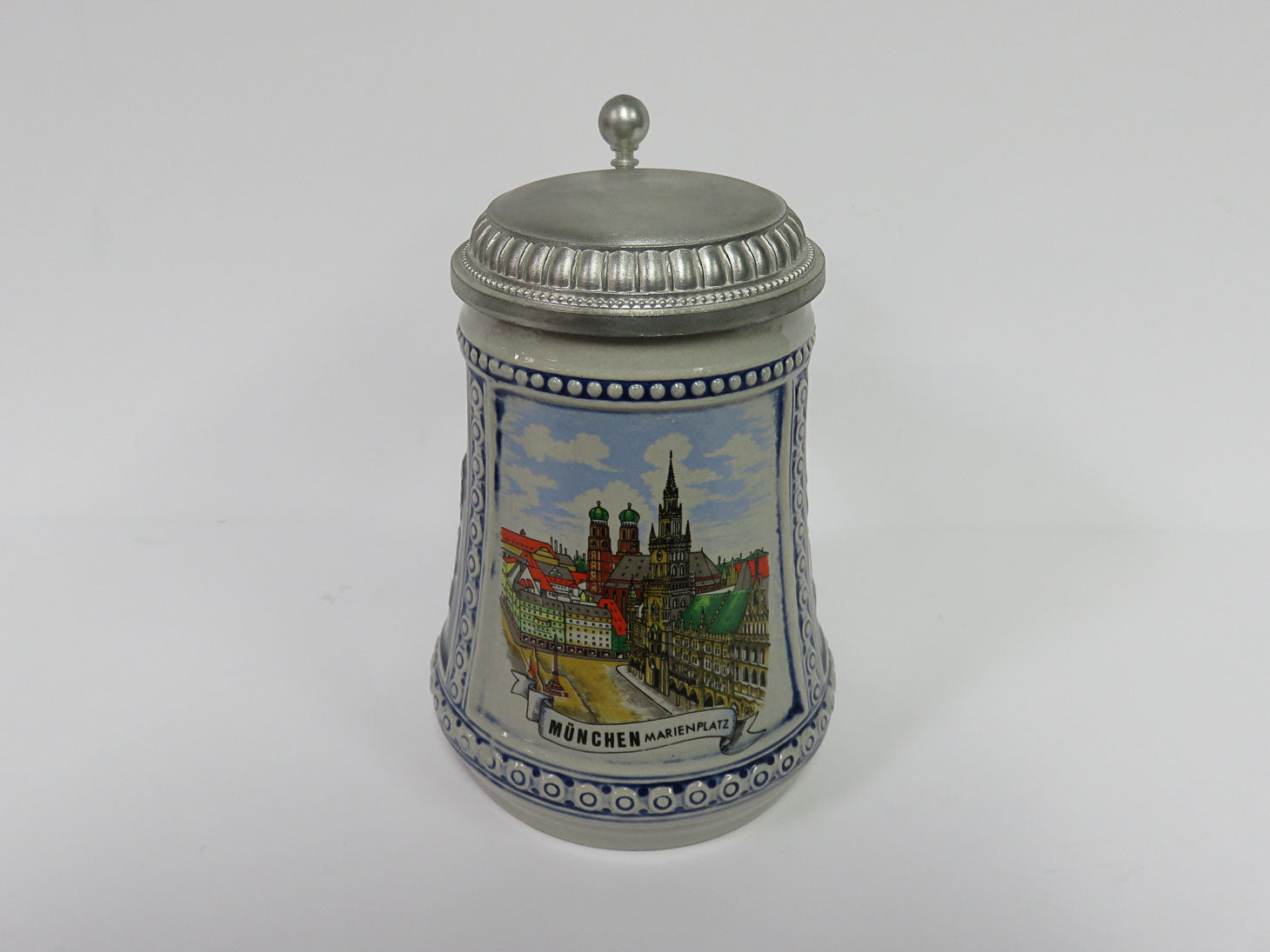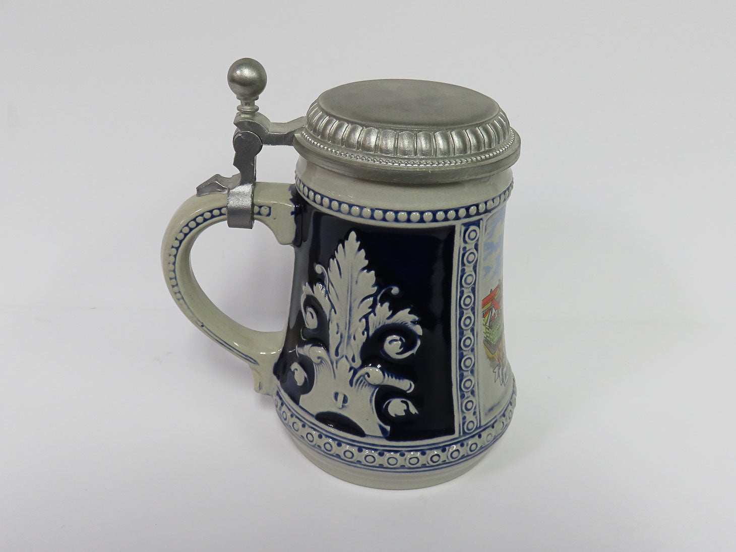 Half liter, gray with navy panels, German scenes, pewter lid