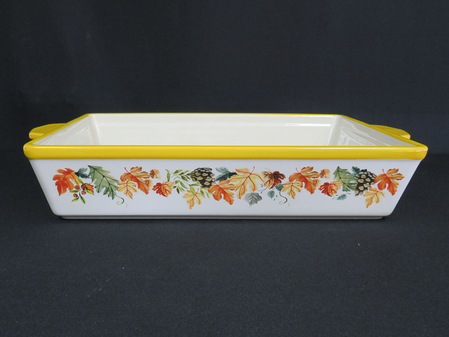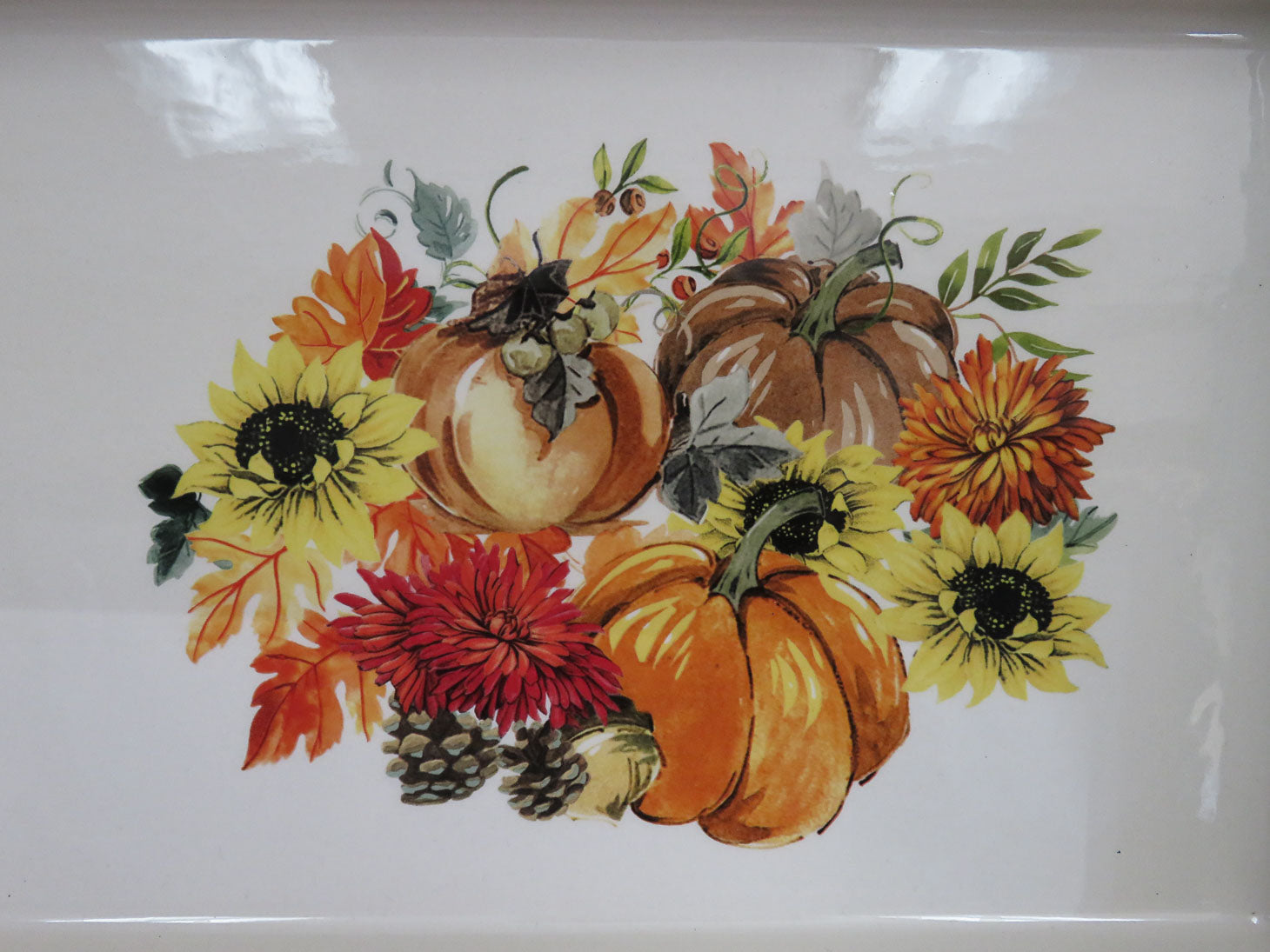 Rectangular with fall theme, harvest gold handle & rim, pumpkins and leaves.