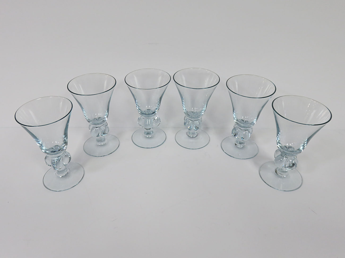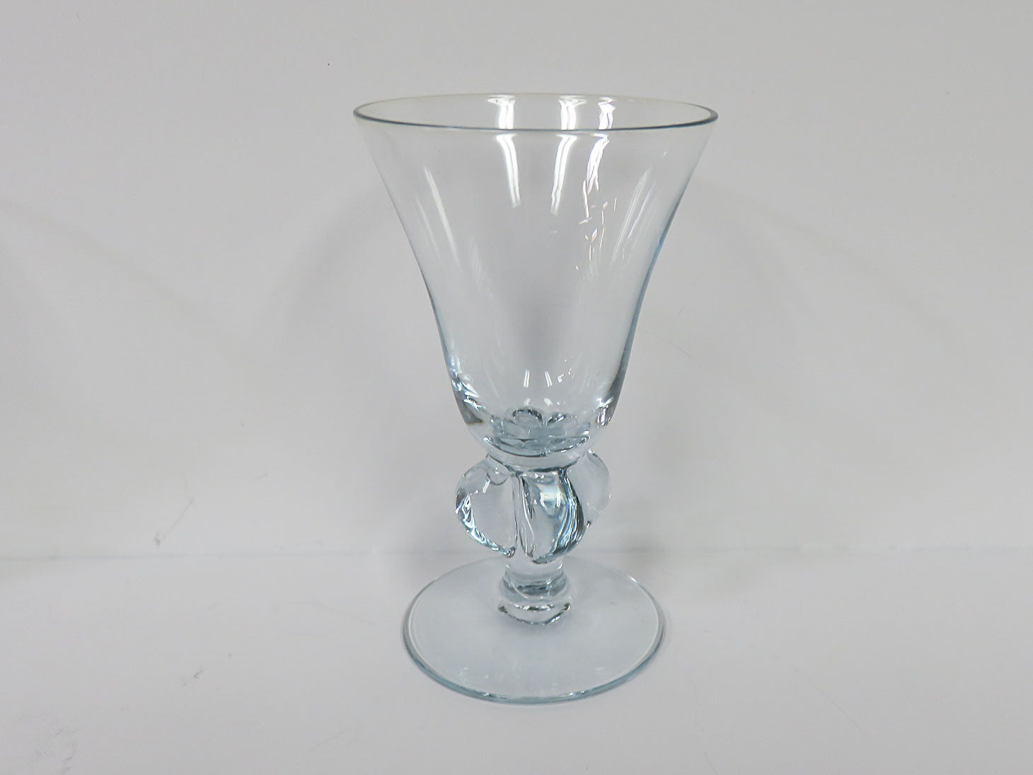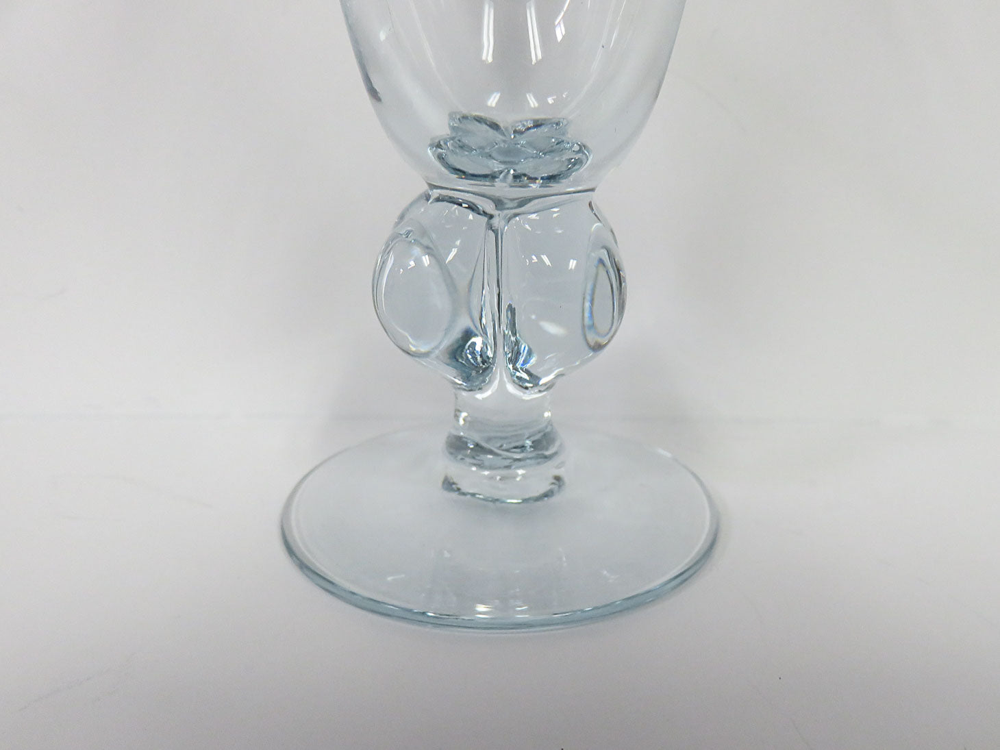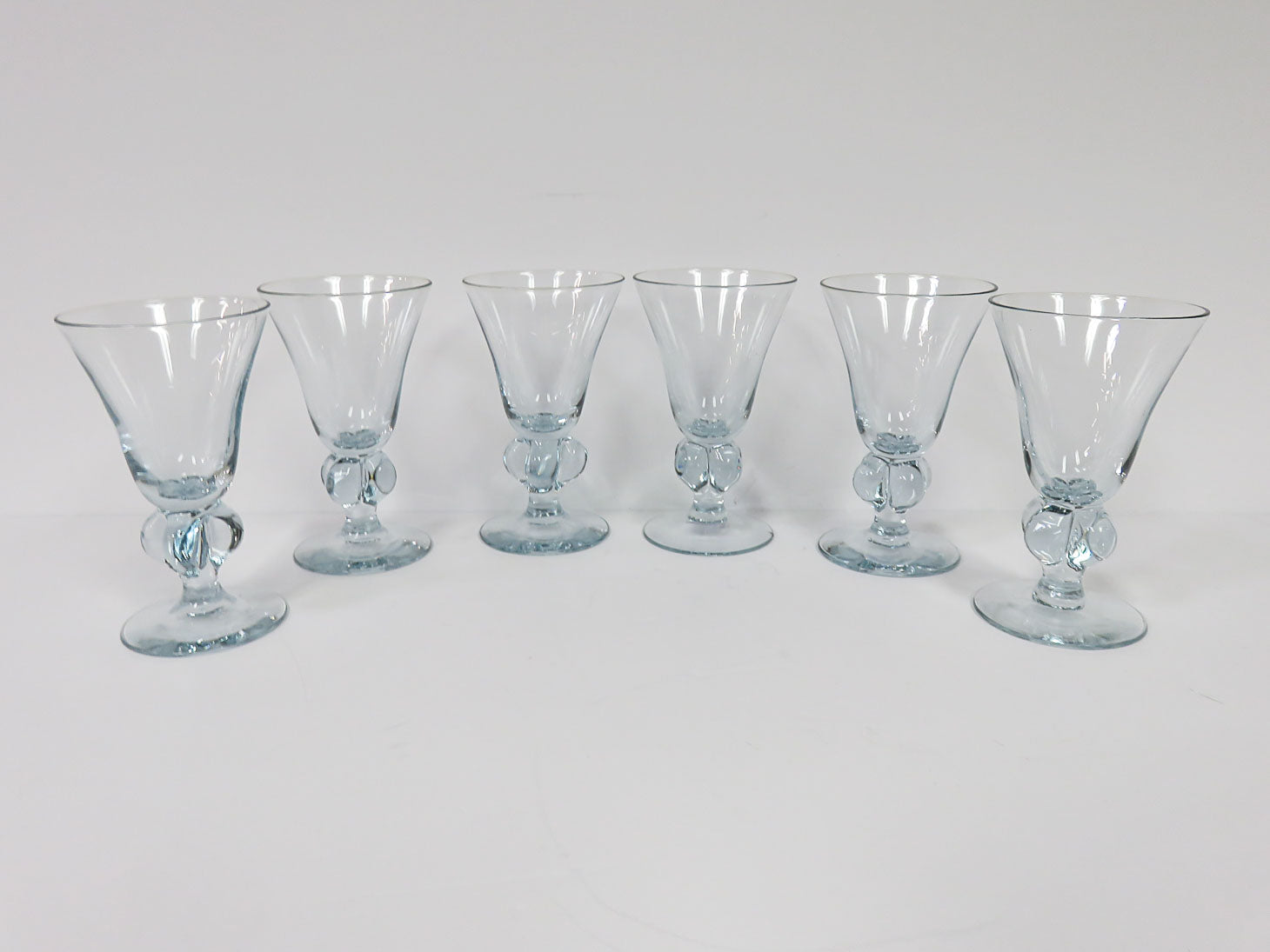Set of 6, hand blown cordials with a slight blue tint with a four lobe stem.