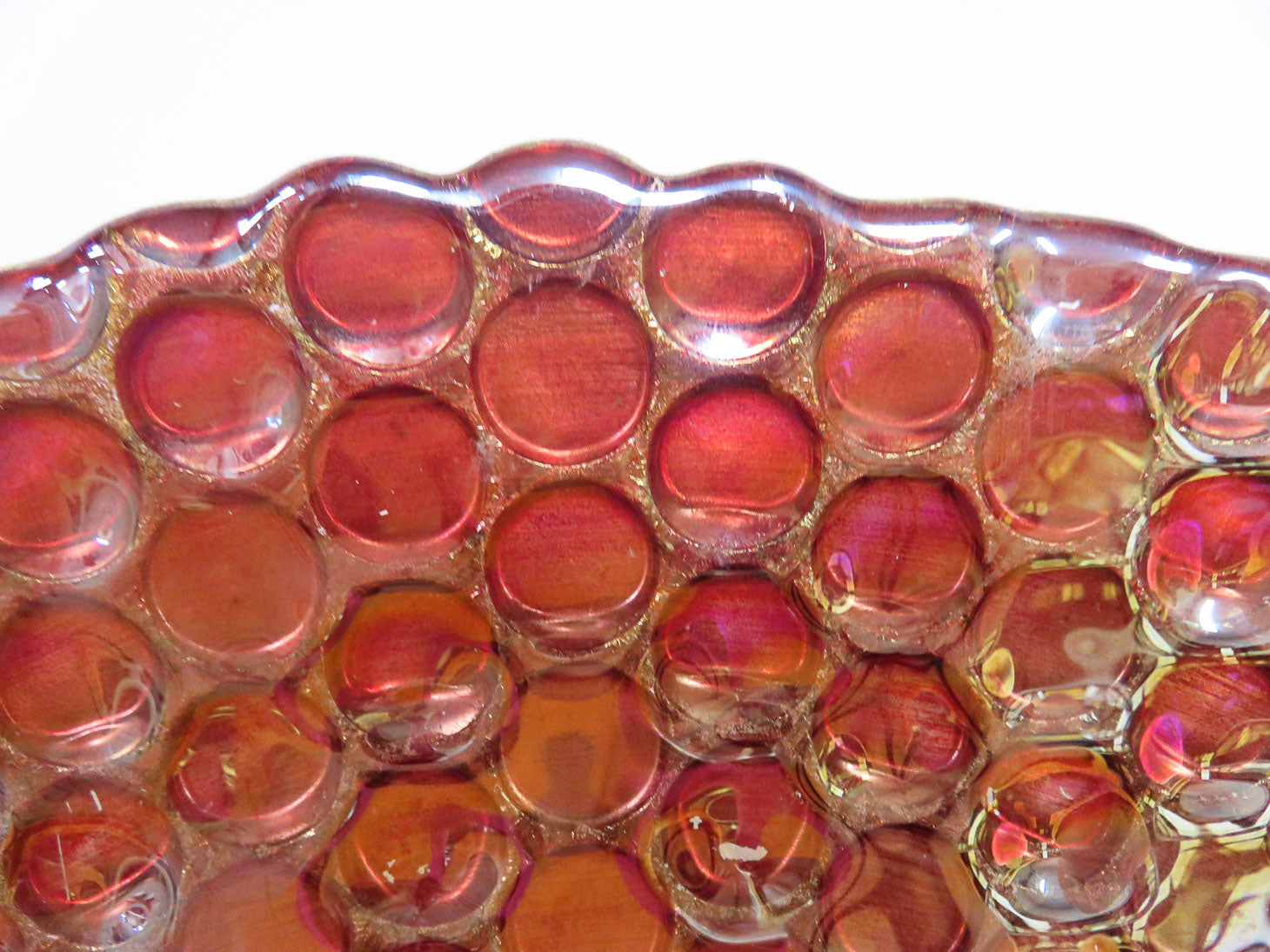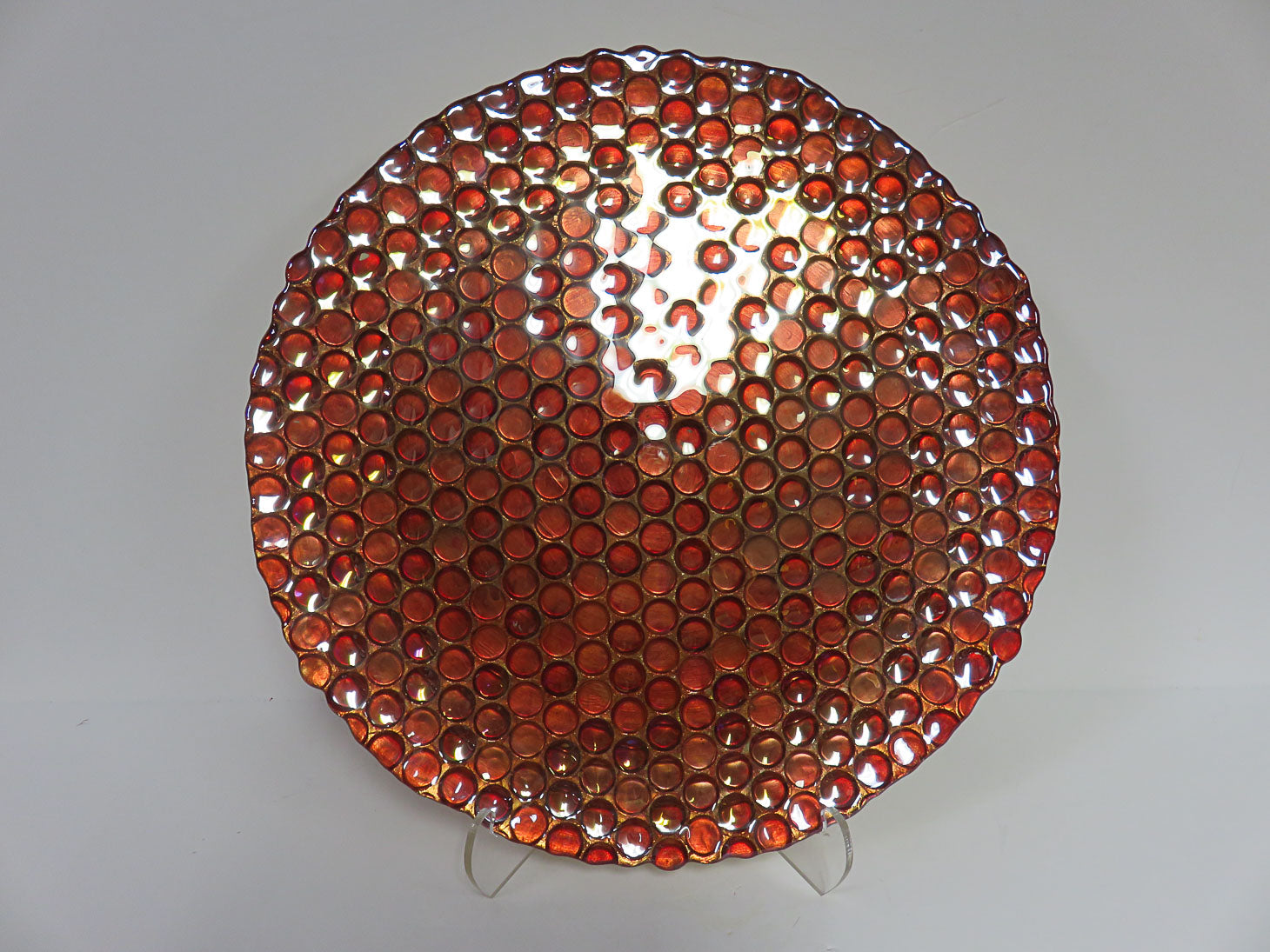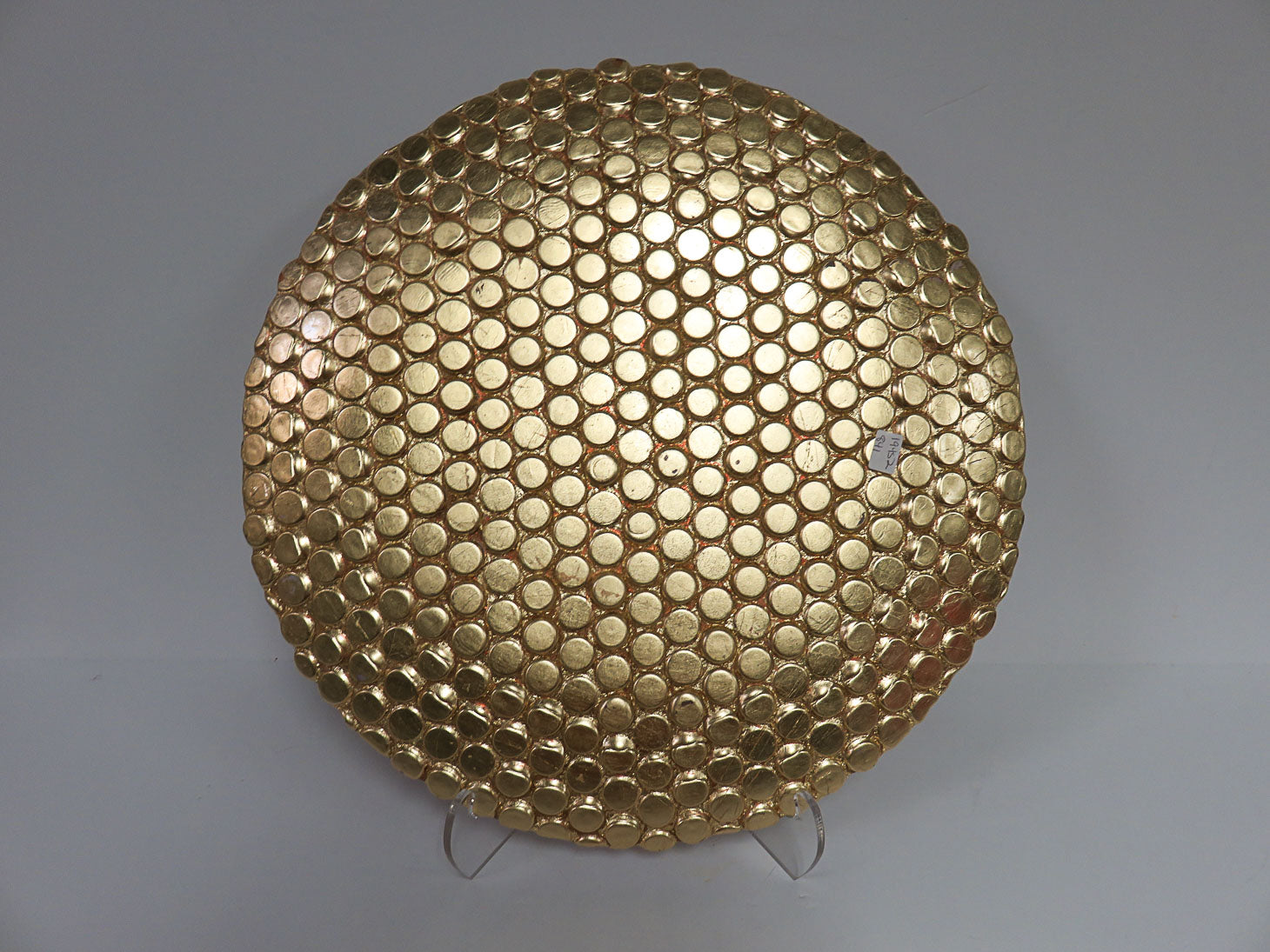 Round, orange and red, small coin pattern, with gold bottom 15" D