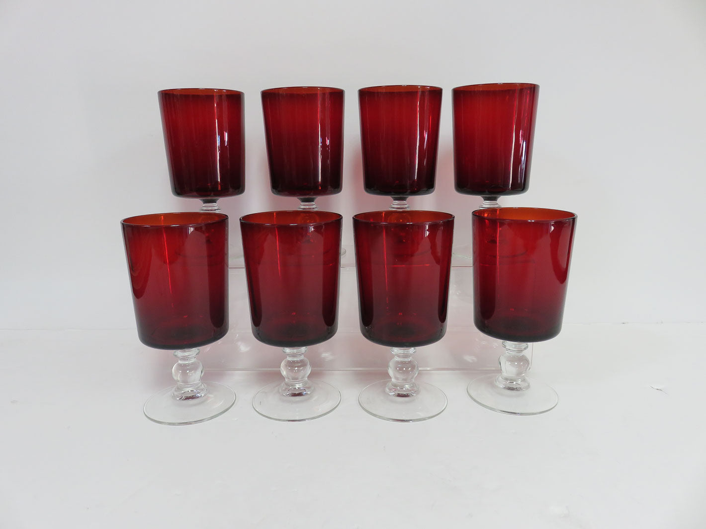 Item Number: 17471-27 Set of 8, "Cavalier" pattern, ruby red cup with clear stem and base. Two sets available. Sold separately. #17471-28. 6"