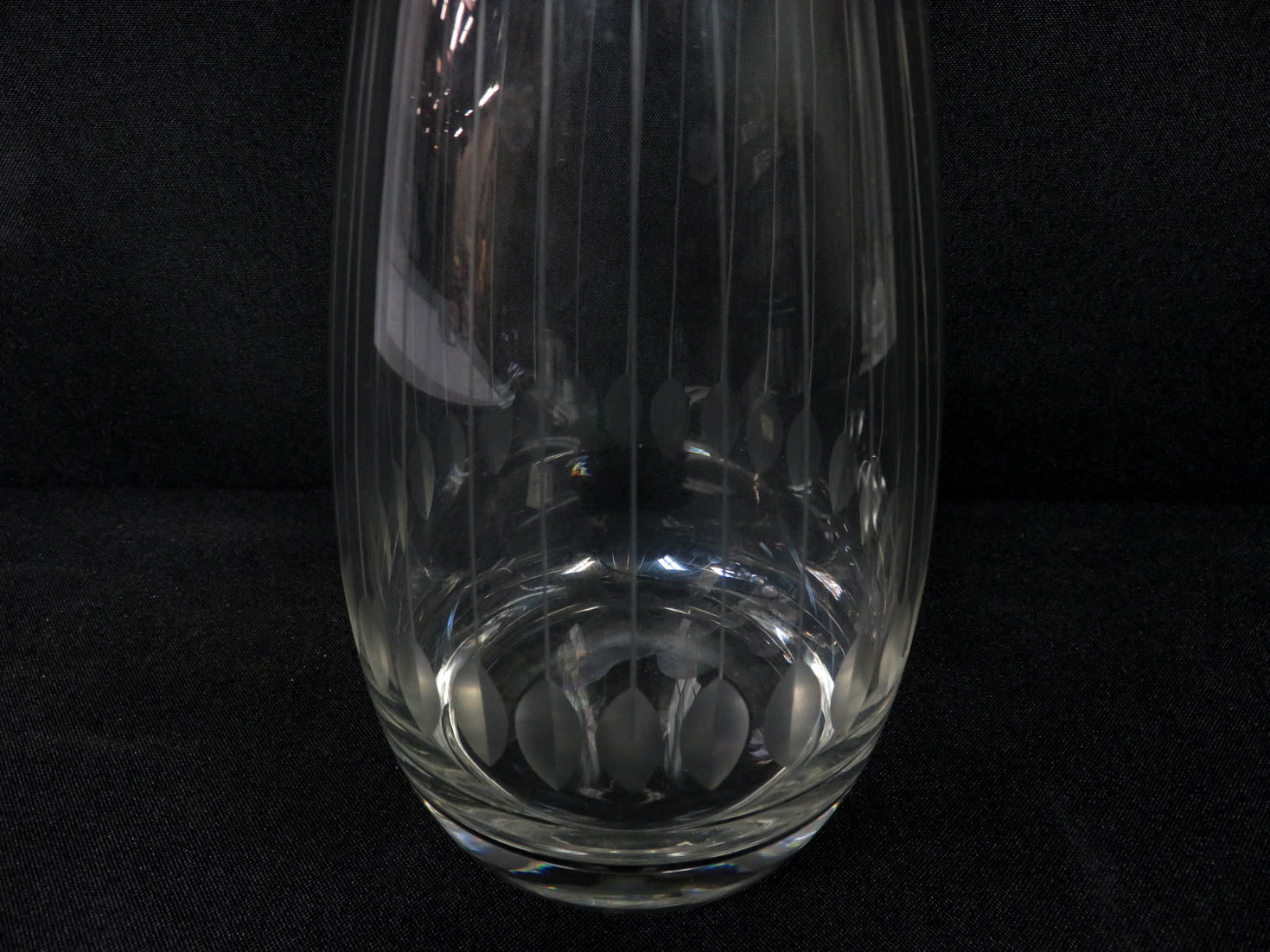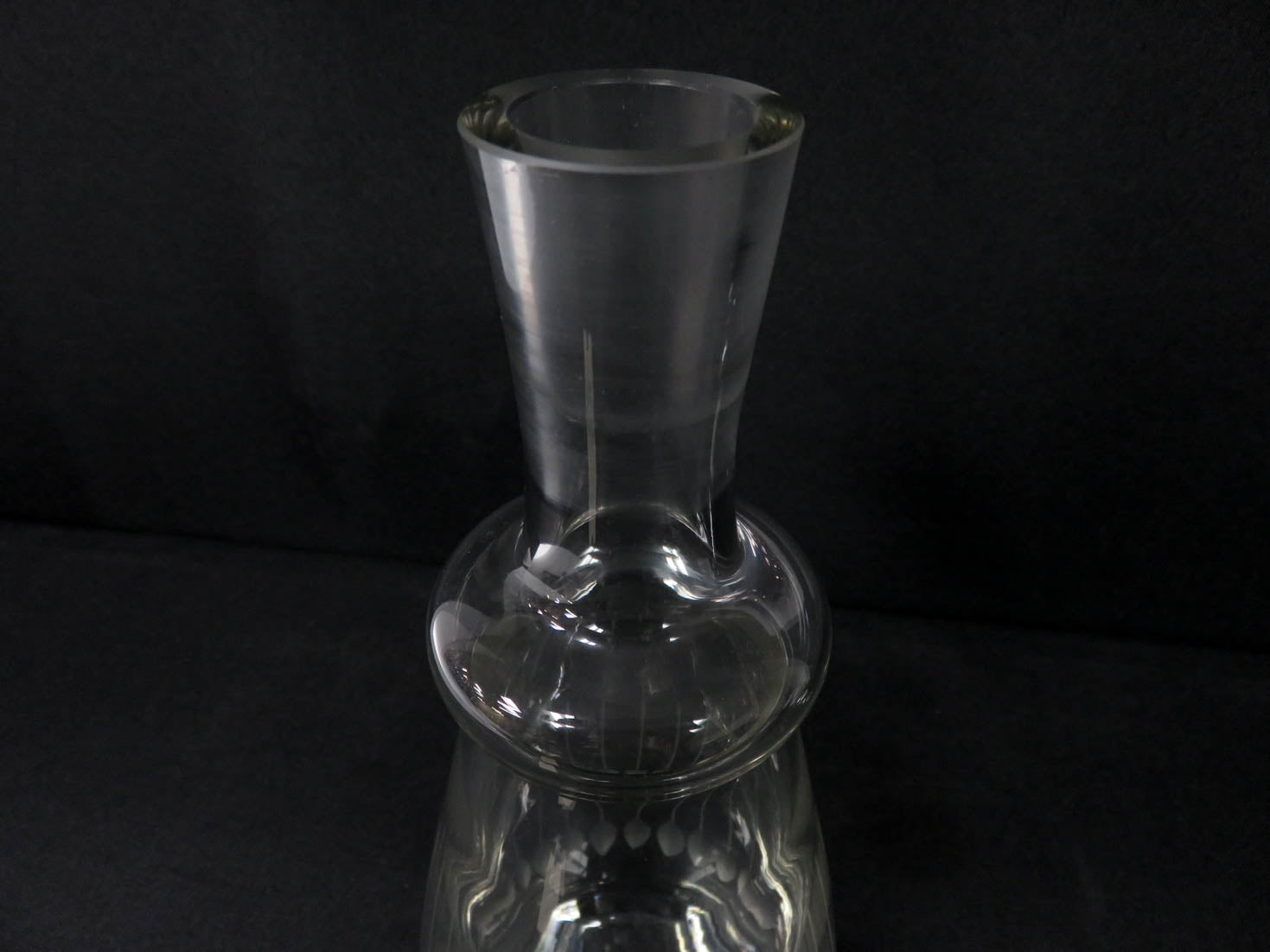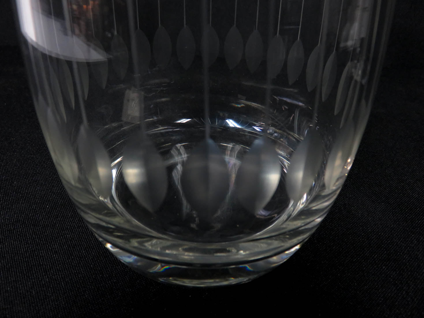 Hand blown with etched stripe & leaf pattern, flat topped stopper.